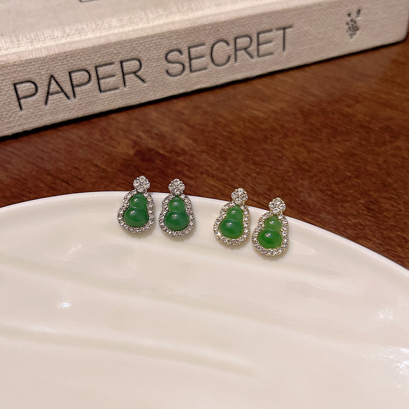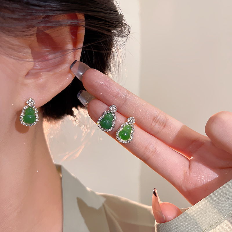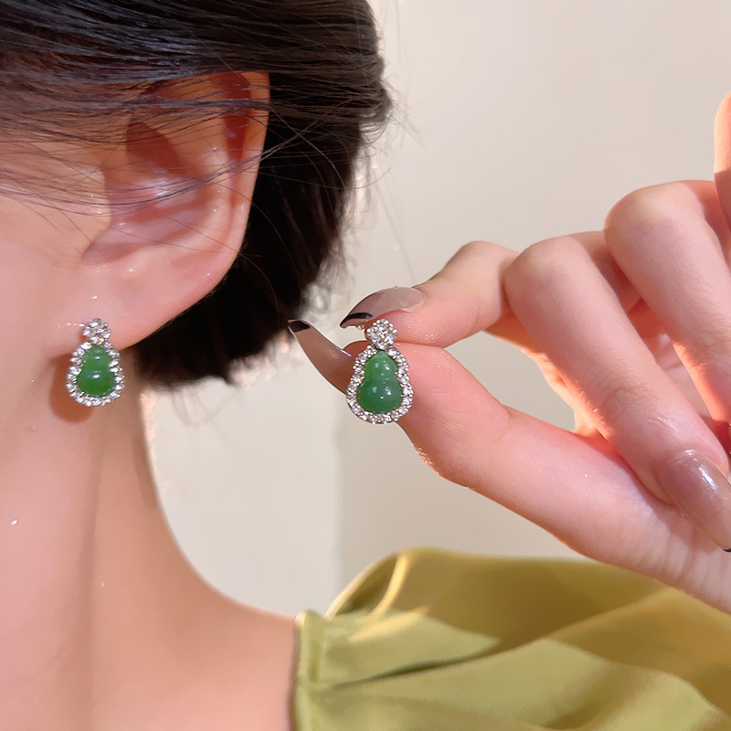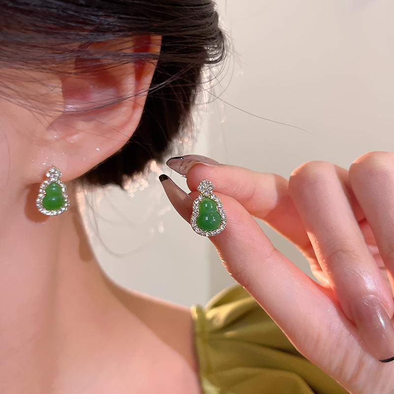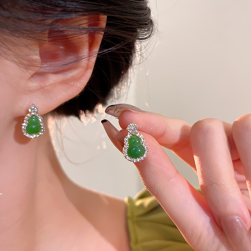 新中式中古风仿玉髓祖母绿葫芦耳钉超闪锆石耳环网红同款复古耳饰