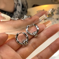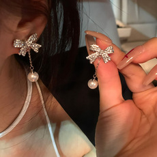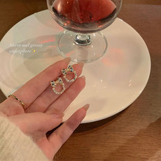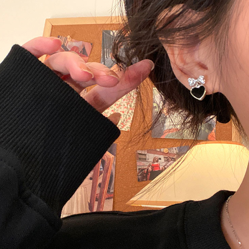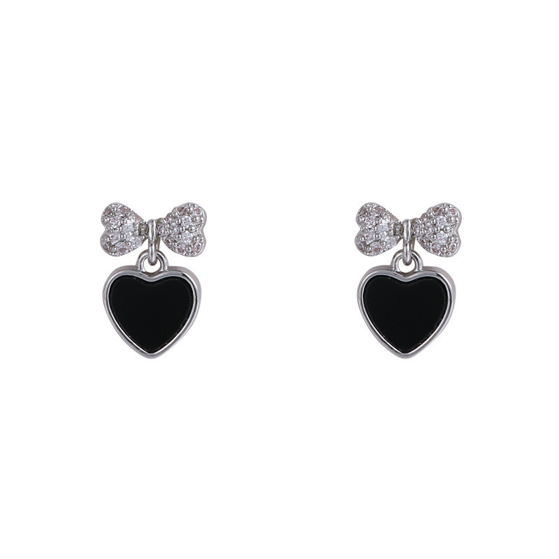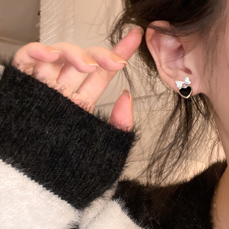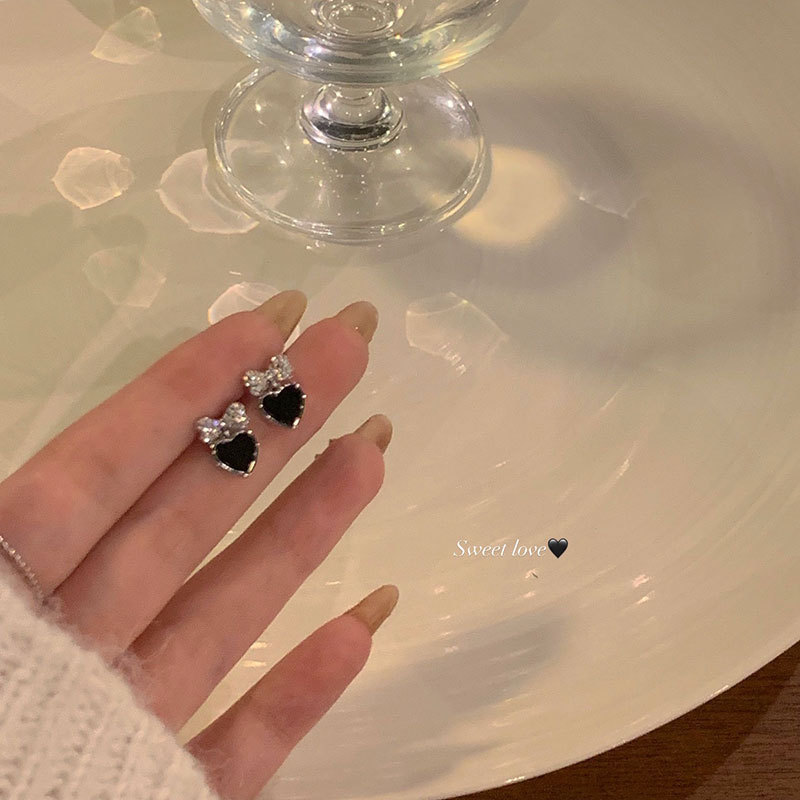 S925银针韩国新款微镶精致蝴蝶结耳钉复古高级设计感黑色桃心耳环