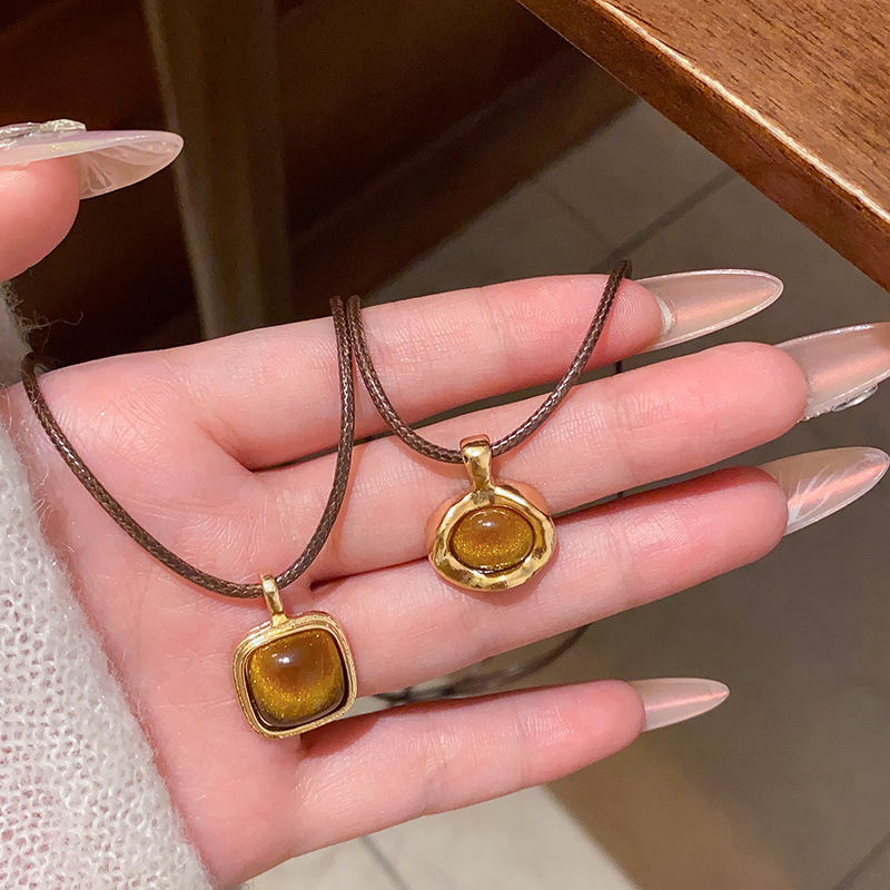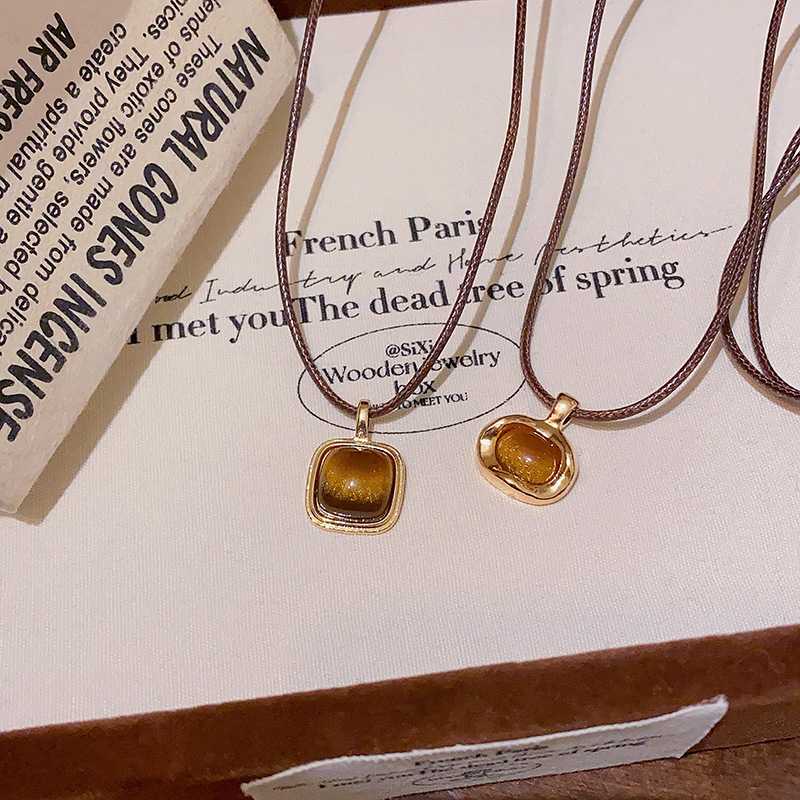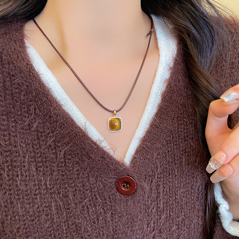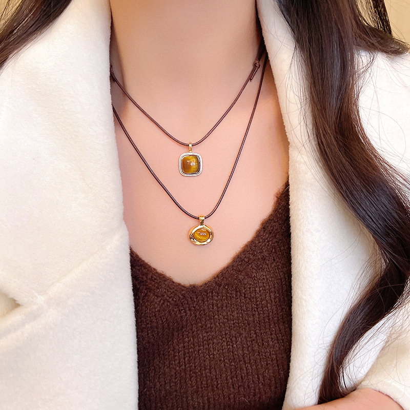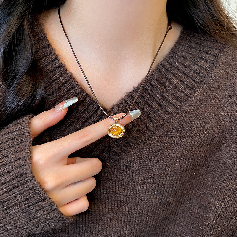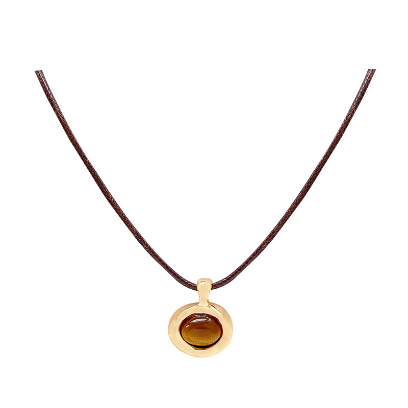 秋冬款美拉德虎眼石项链轻奢小众简约设计感皮绳抽拉式毛衣卫衣链