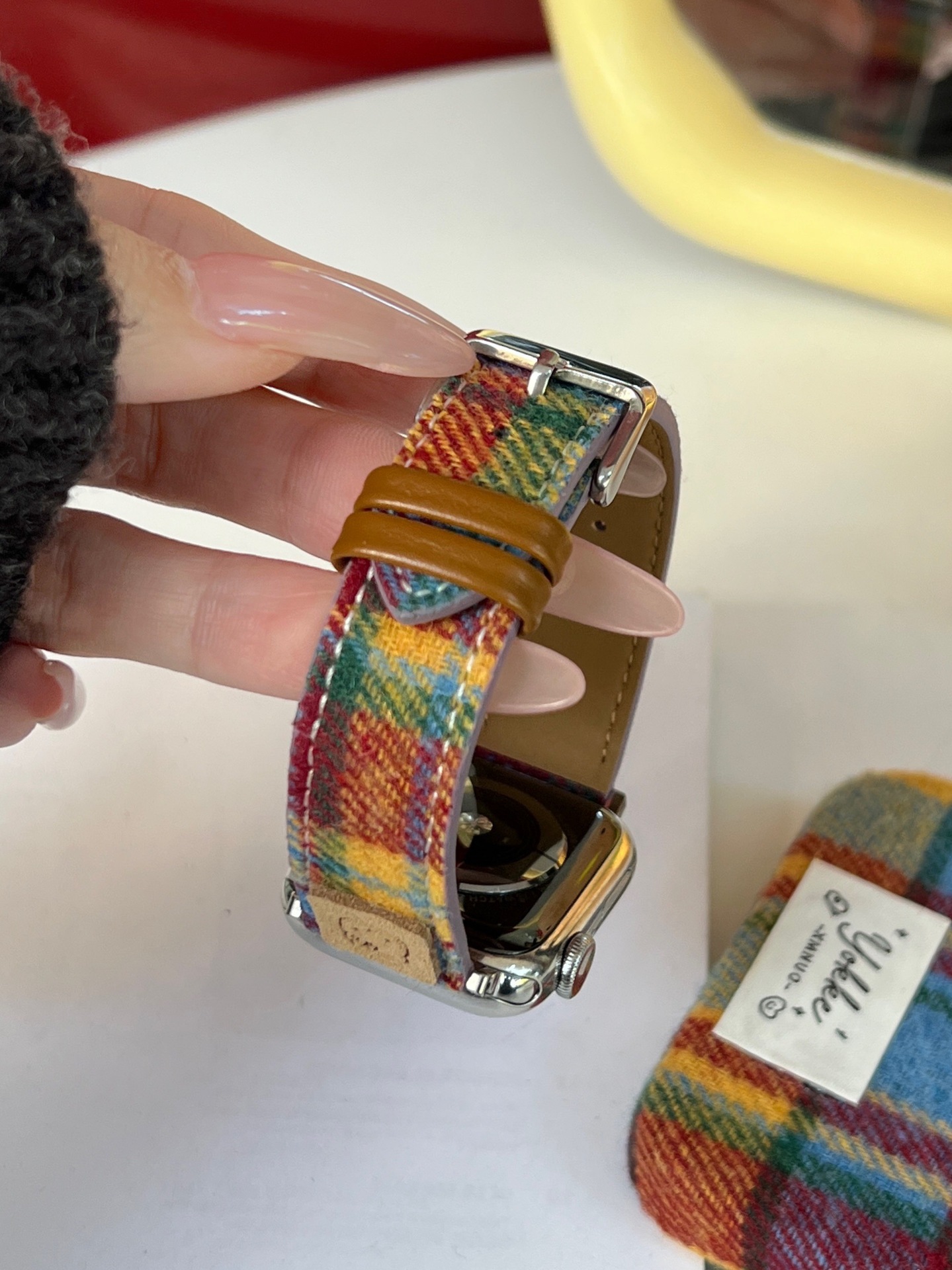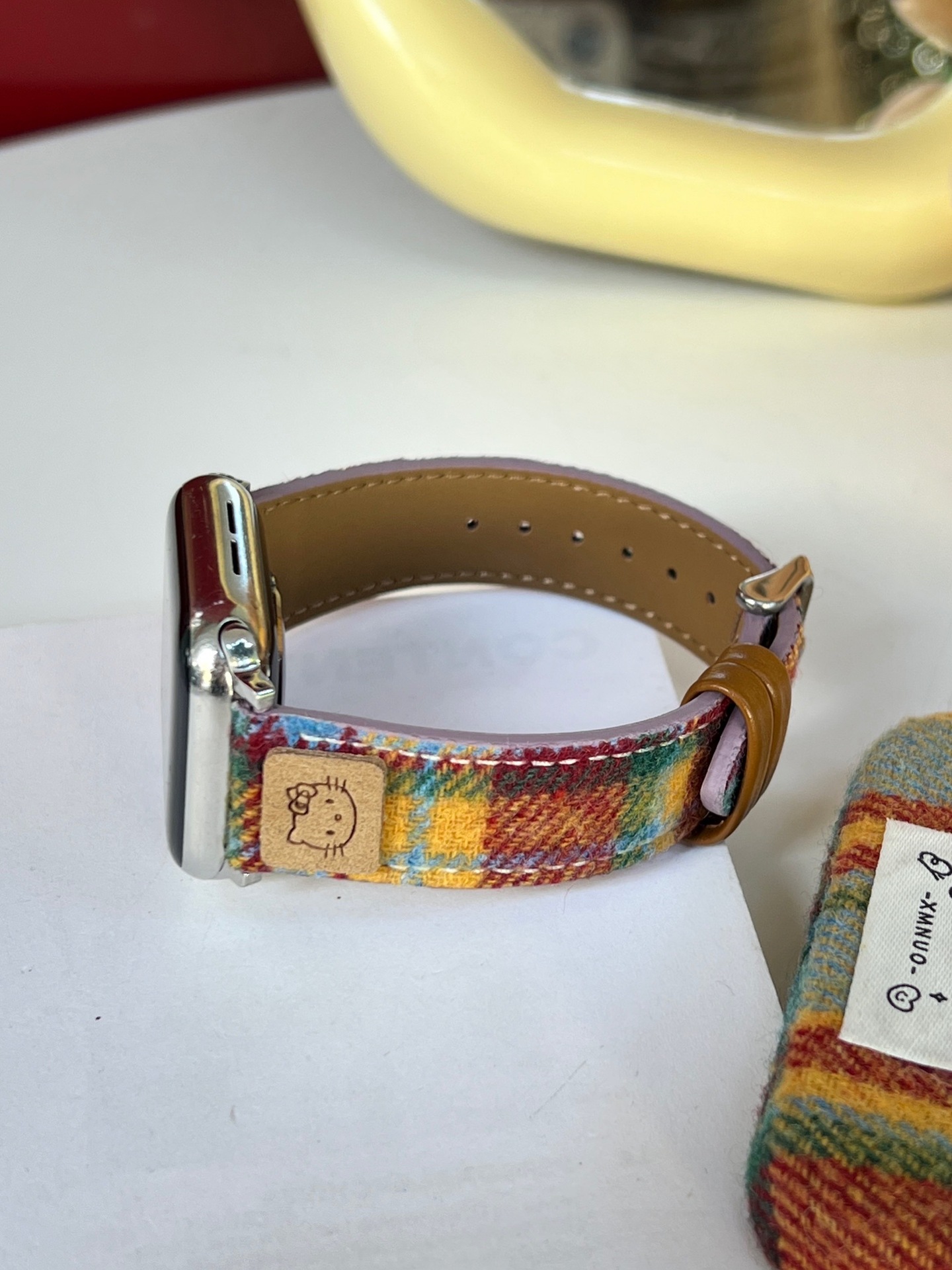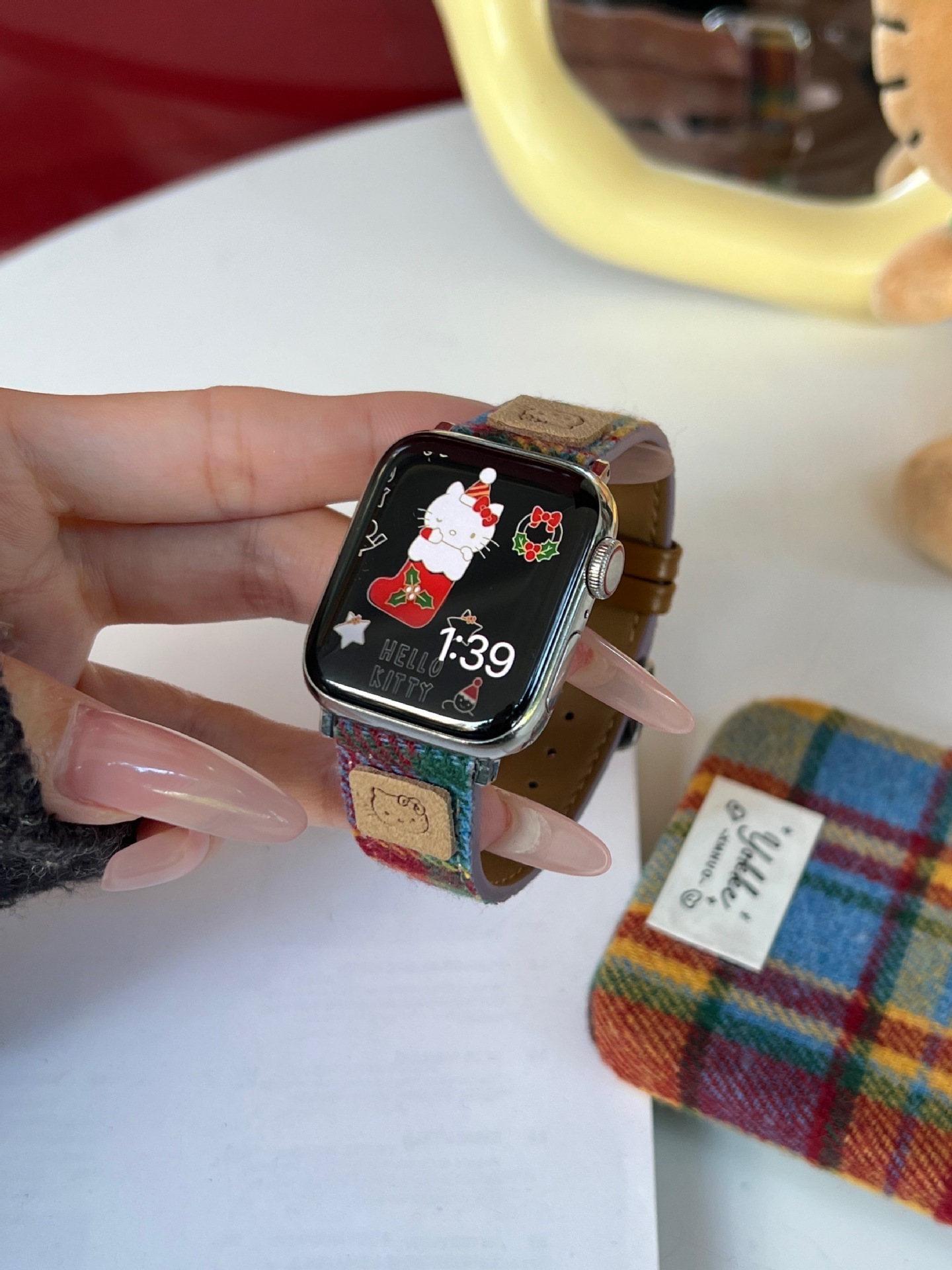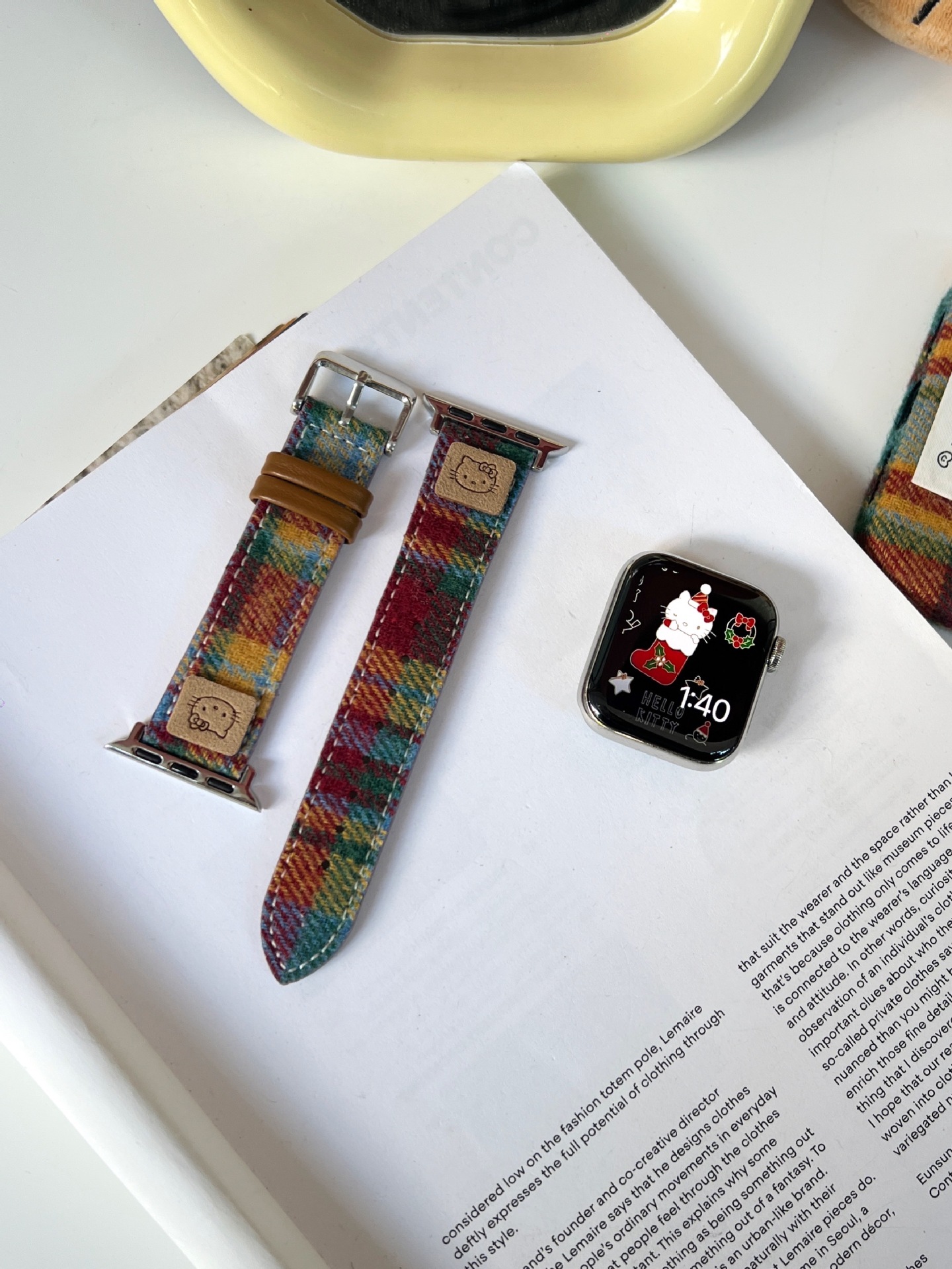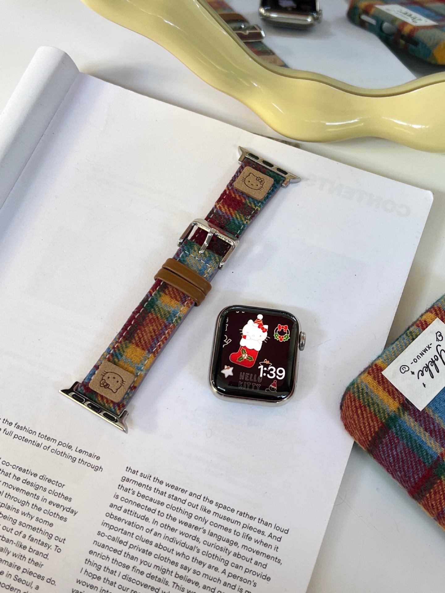 适用苹果手表iwatch10代987654Ultra/SE彩色凯蒂织布格纹皮质表带