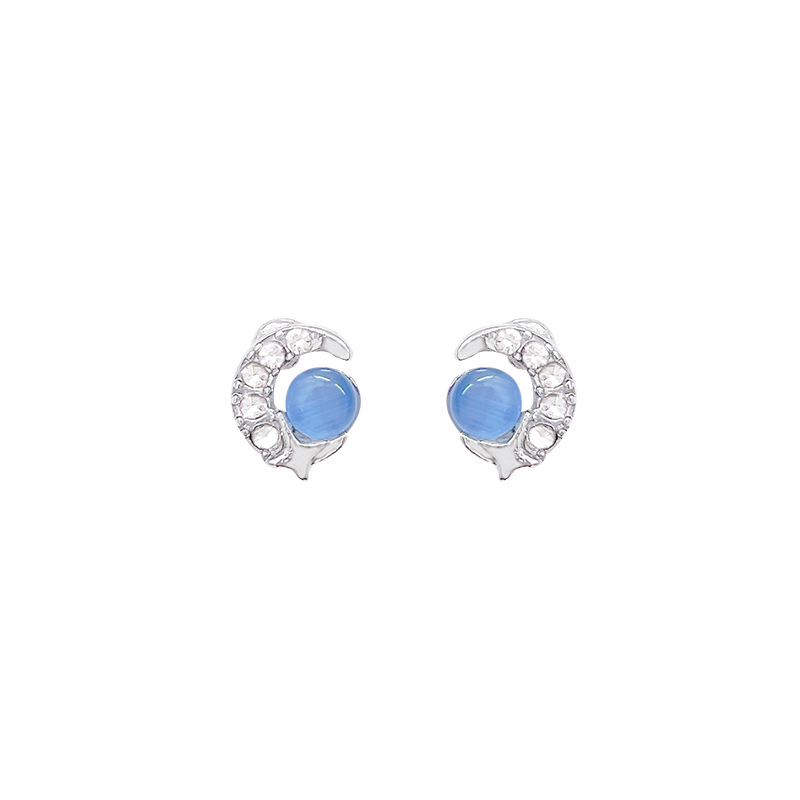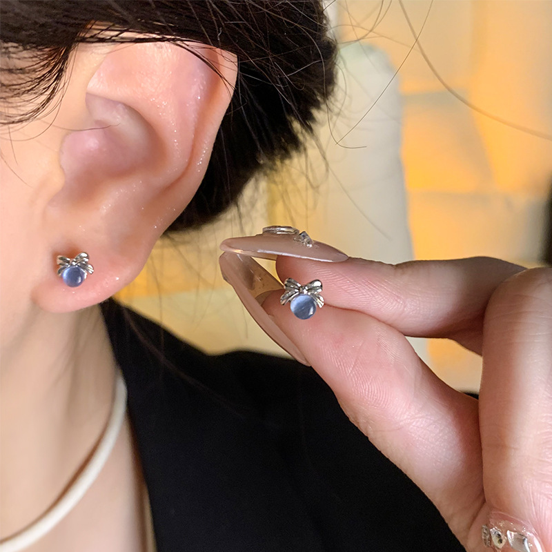 S925银针小众高级感蝴蝶结蓝色猫眼石耳钉女百搭气质星月耳环耳饰