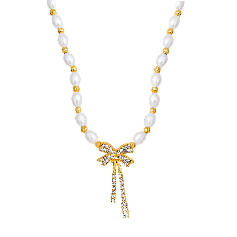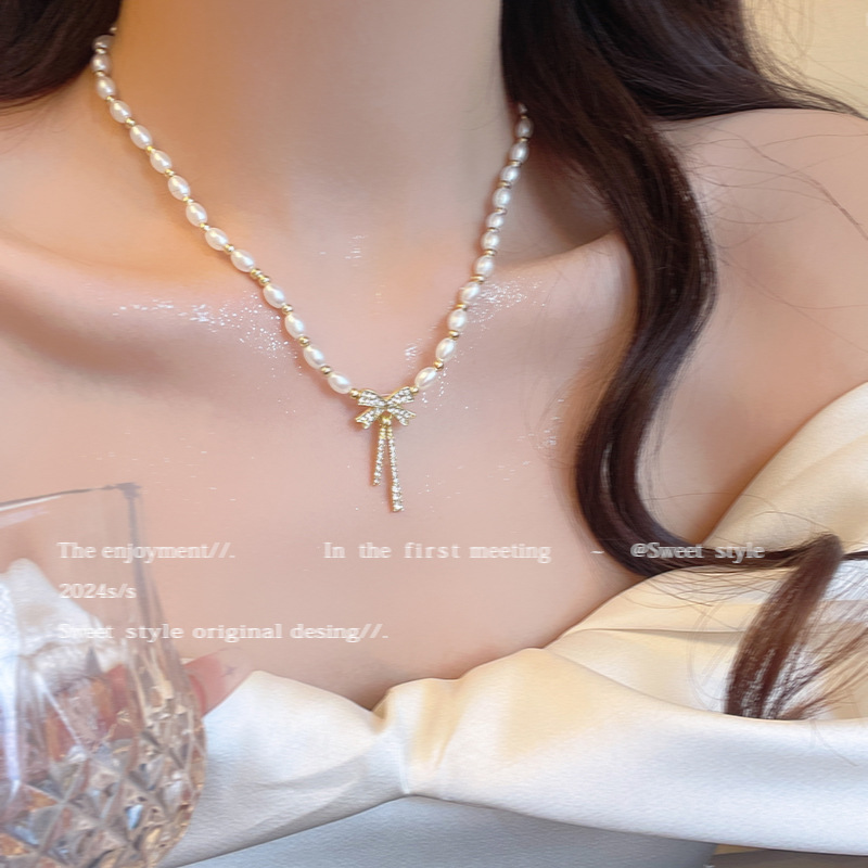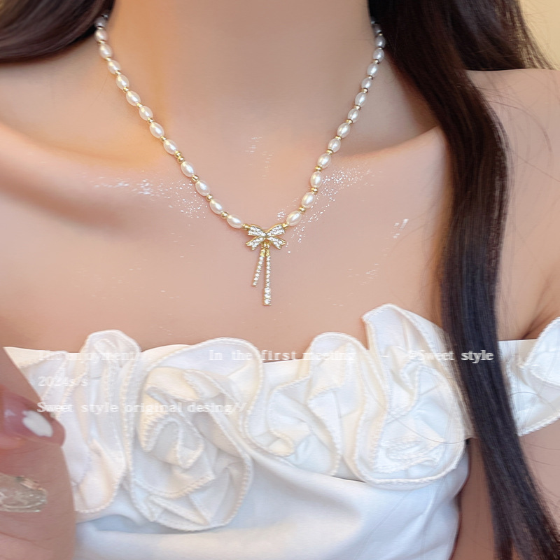 法式复古温柔气质珍珠项链女轻奢小众满钻超闪蝴蝶结吊坠锁骨链