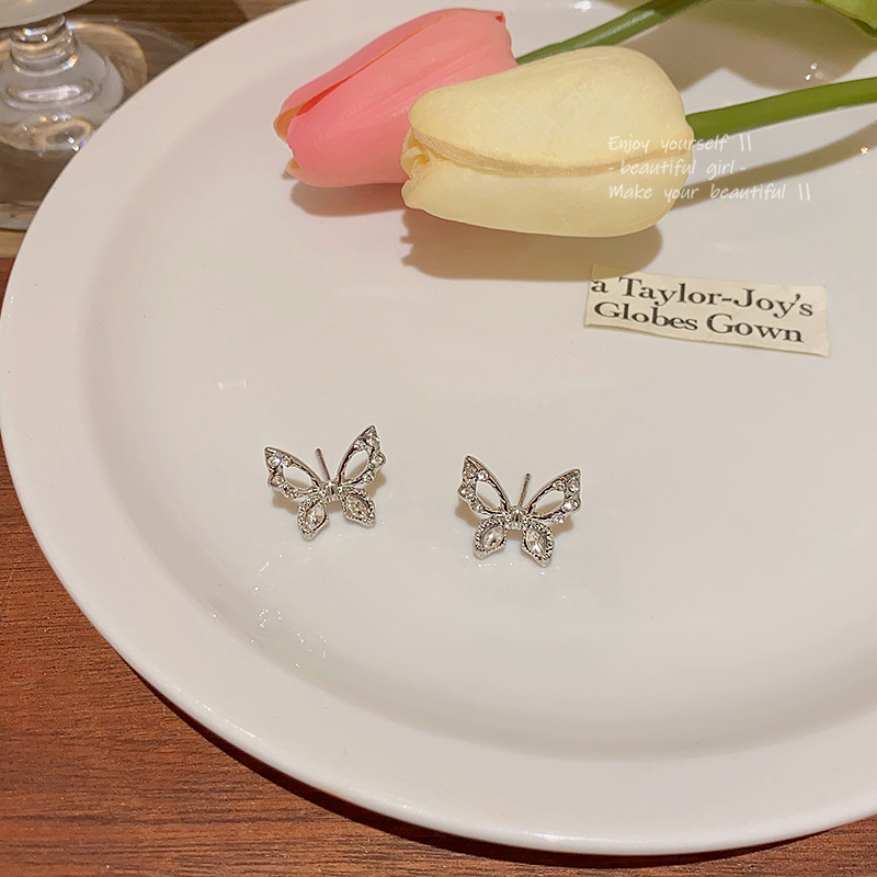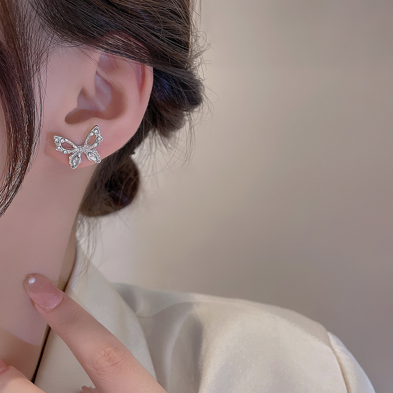 S925银针超闪水钻蝴蝶耳环女轻奢小众高级设计感耳钉网红耳饰批发