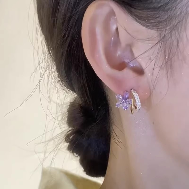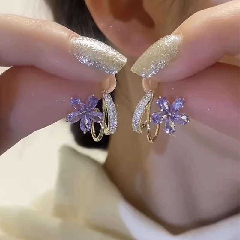 轻奢小众超闪紫色锆石耳环女法式复古时尚百搭气质花朵耳钉耳饰品