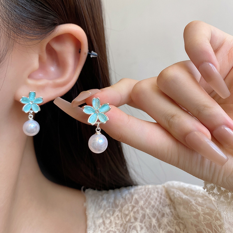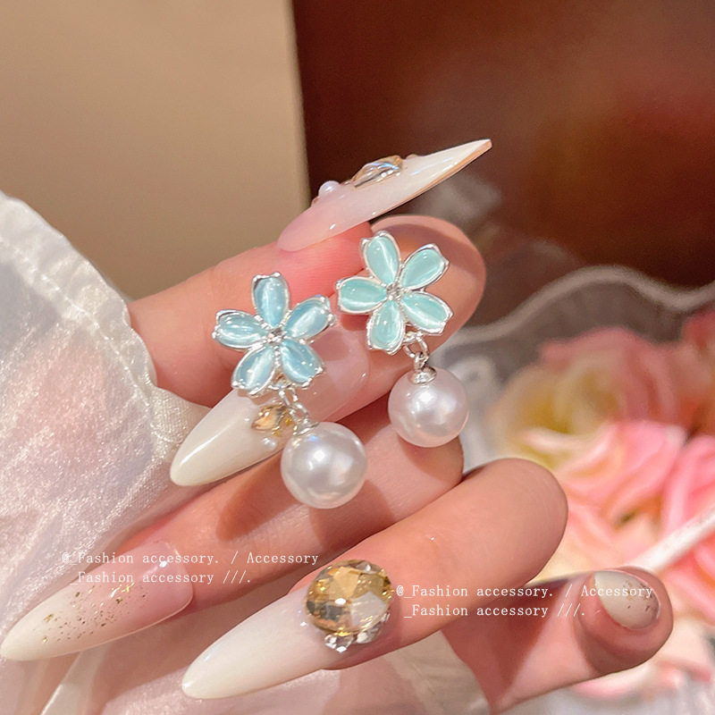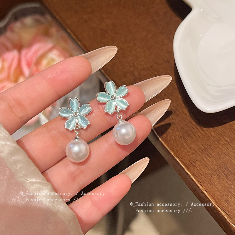 小清新薄荷绿猫眼石花朵耳环女S925银针小众高级感珍珠耳环耳饰品
