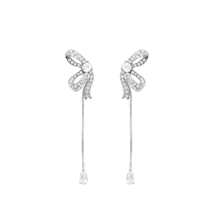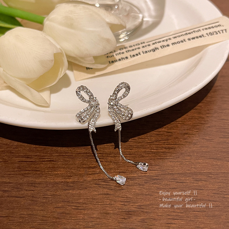 S925银针韩系爆款长款流苏满钻蝴蝶结耳环女高级设计感耳钉耳饰品