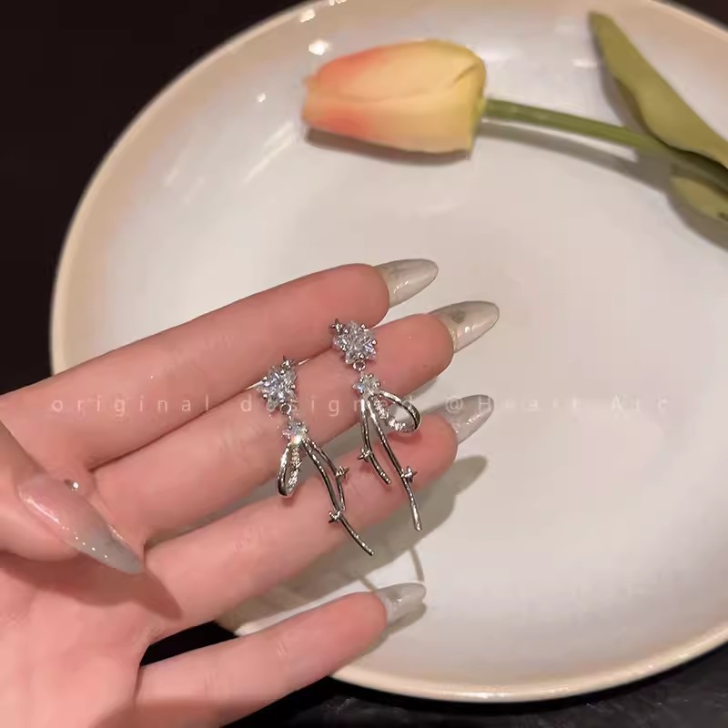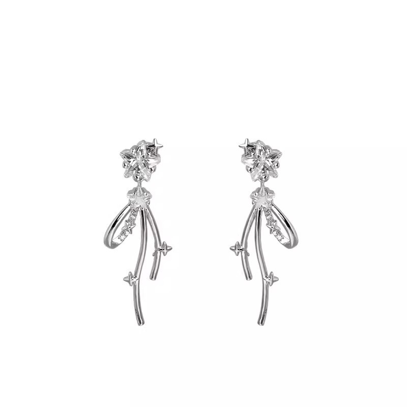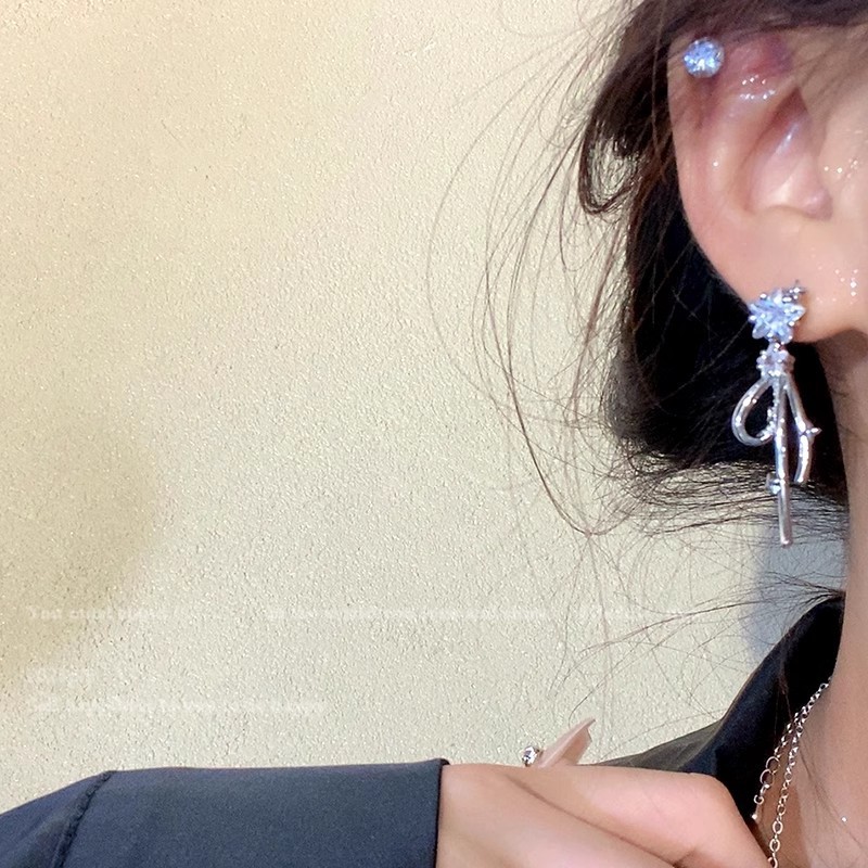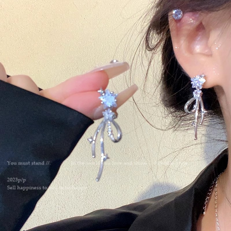 S925银针精致锆石星星耳钉轻奢小众高级感长款流苏蝴蝶结耳环耳饰