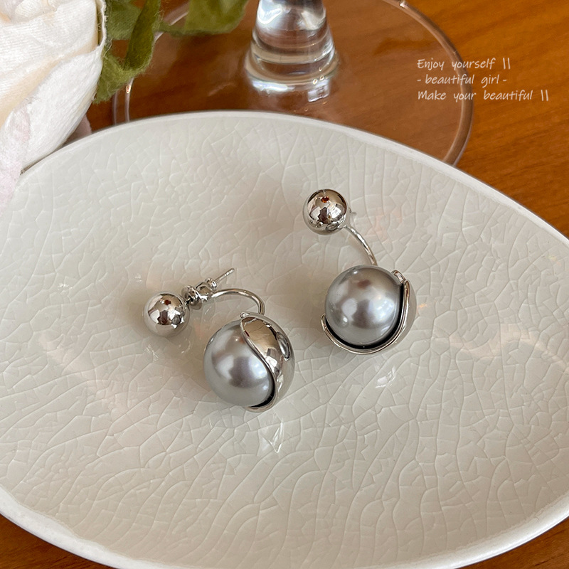 S925银针施家灰珍珠耳钉女高级感一款两戴后挂式耳环网红同款耳饰