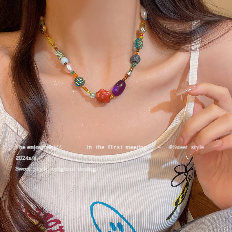 多巴胺甜美彩色陶瓷串珠项链女ins潮轻奢小众高级感锁骨链颈链