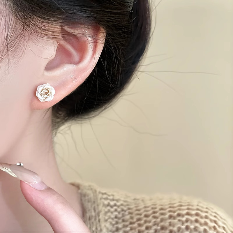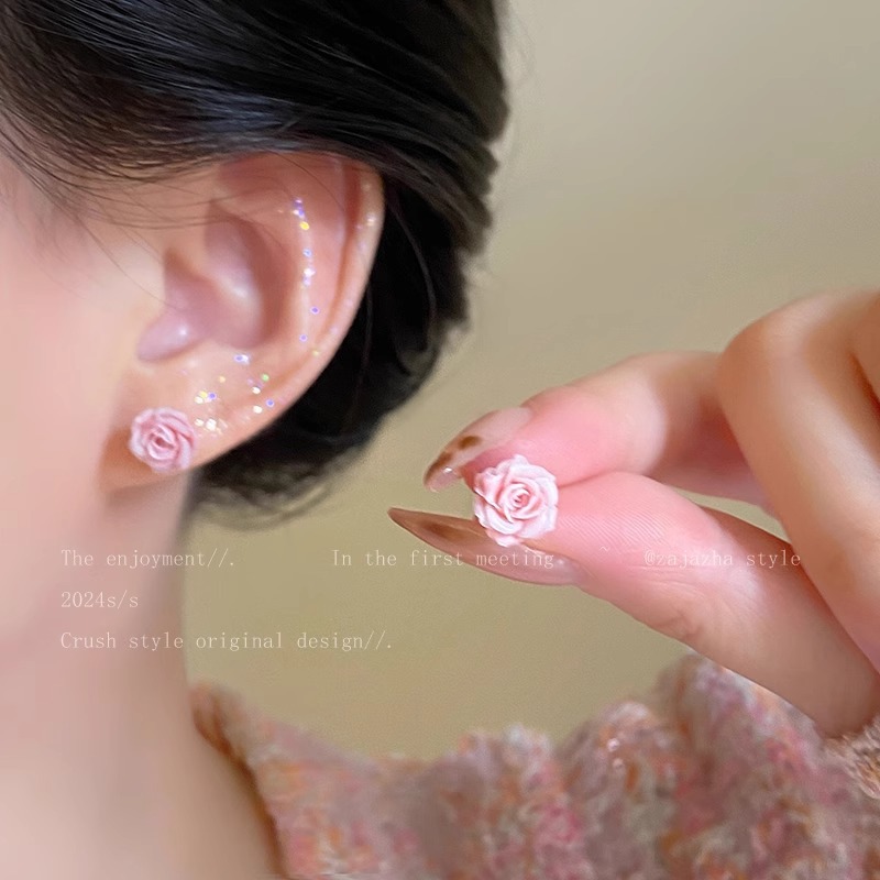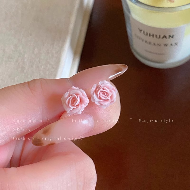 甜美气质小清新粉色玫瑰花耳钉女超仙百搭干枯玫瑰花朵耳环耳饰品