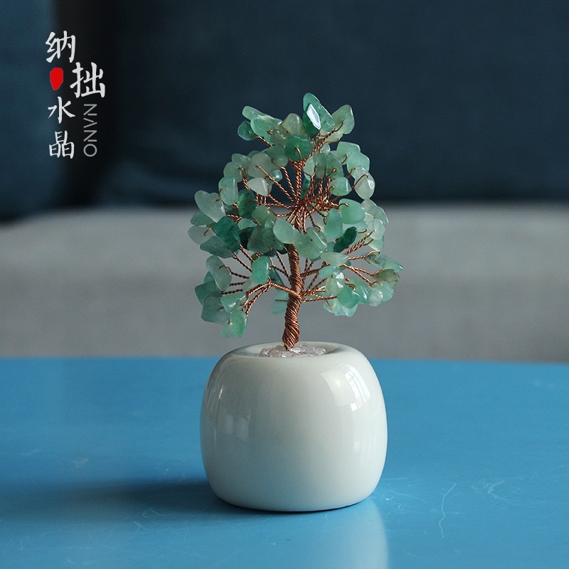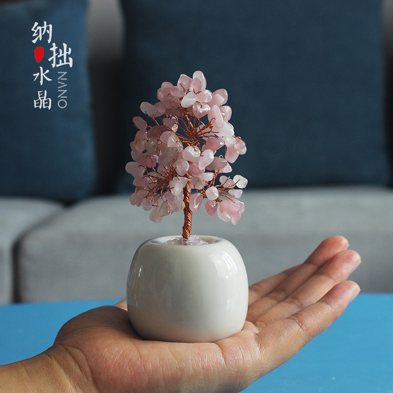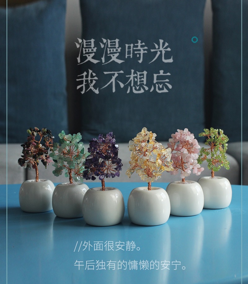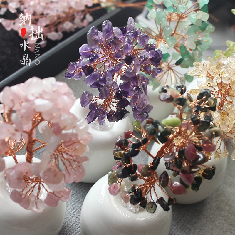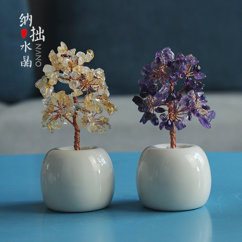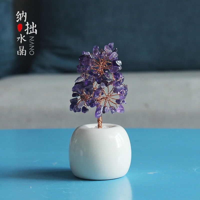 迷你天然粉水晶树摆件办公室桌面发财树家居装饰乔迁紫黄同事礼物