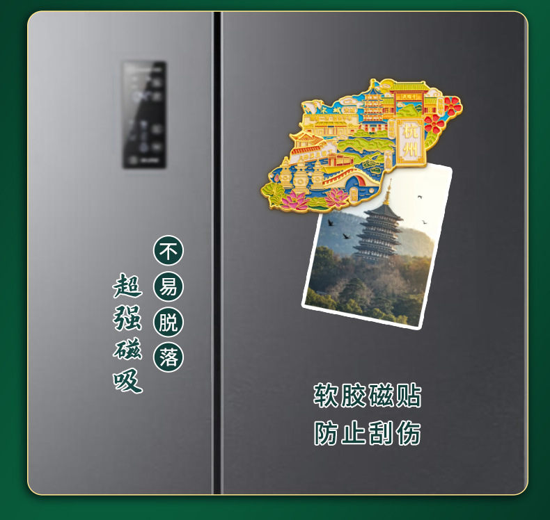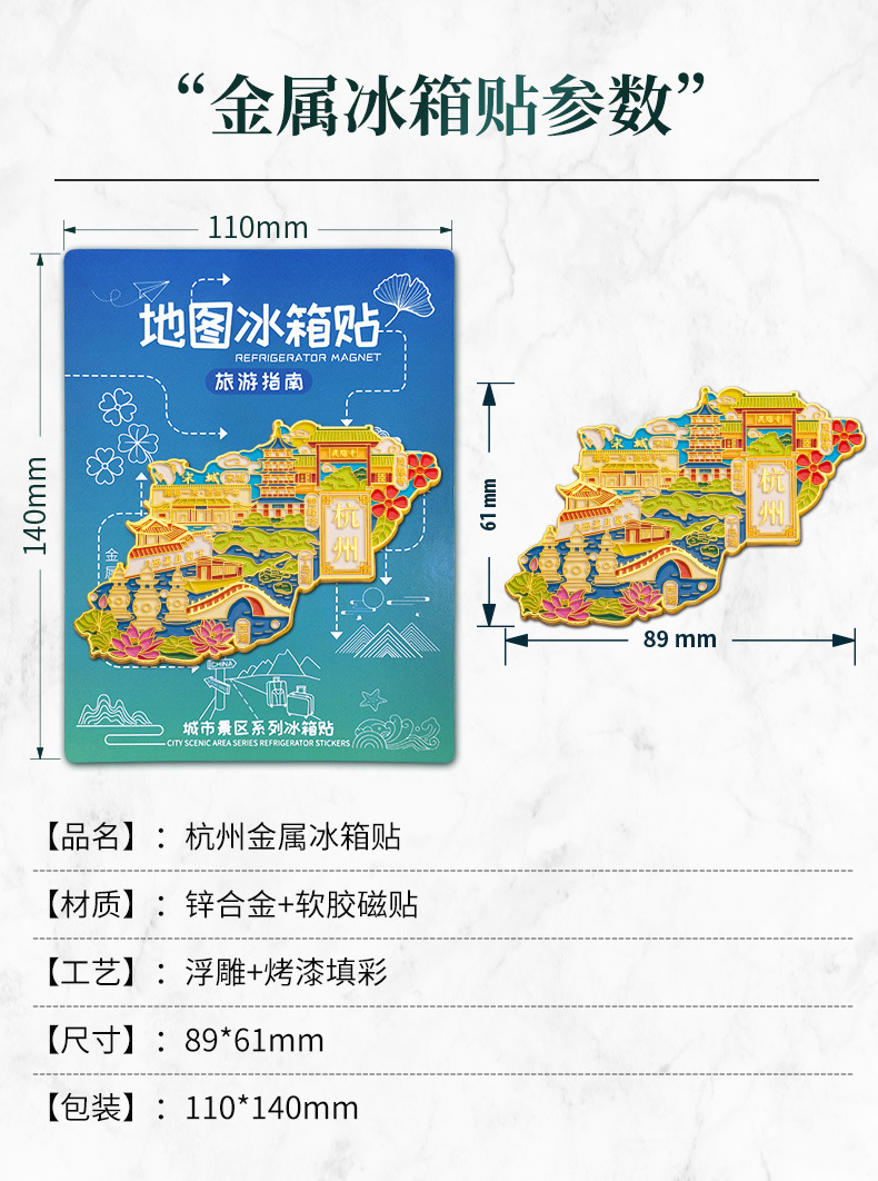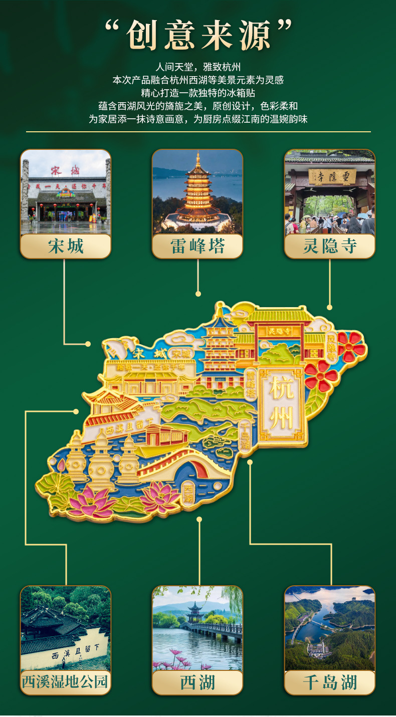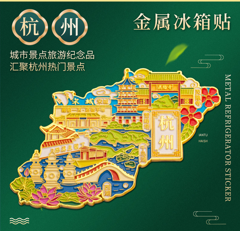 城市地图杭州文创金属冰箱贴西湖雷峰塔宋城千岛湖旅游景点纪念品