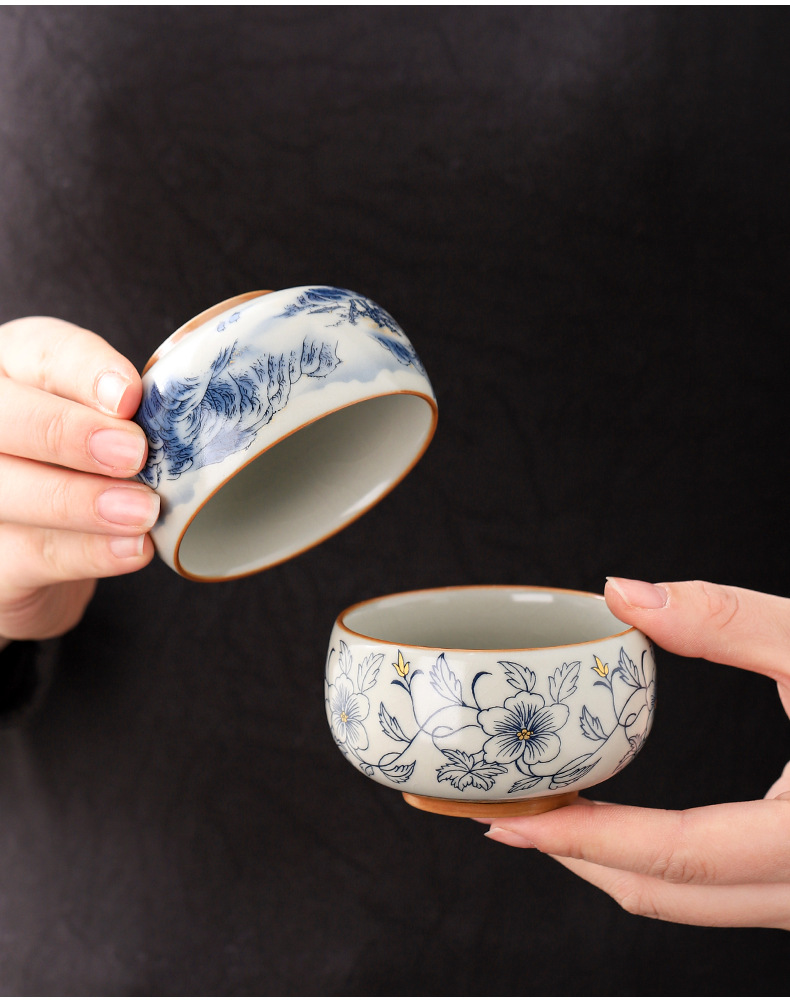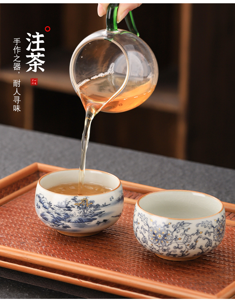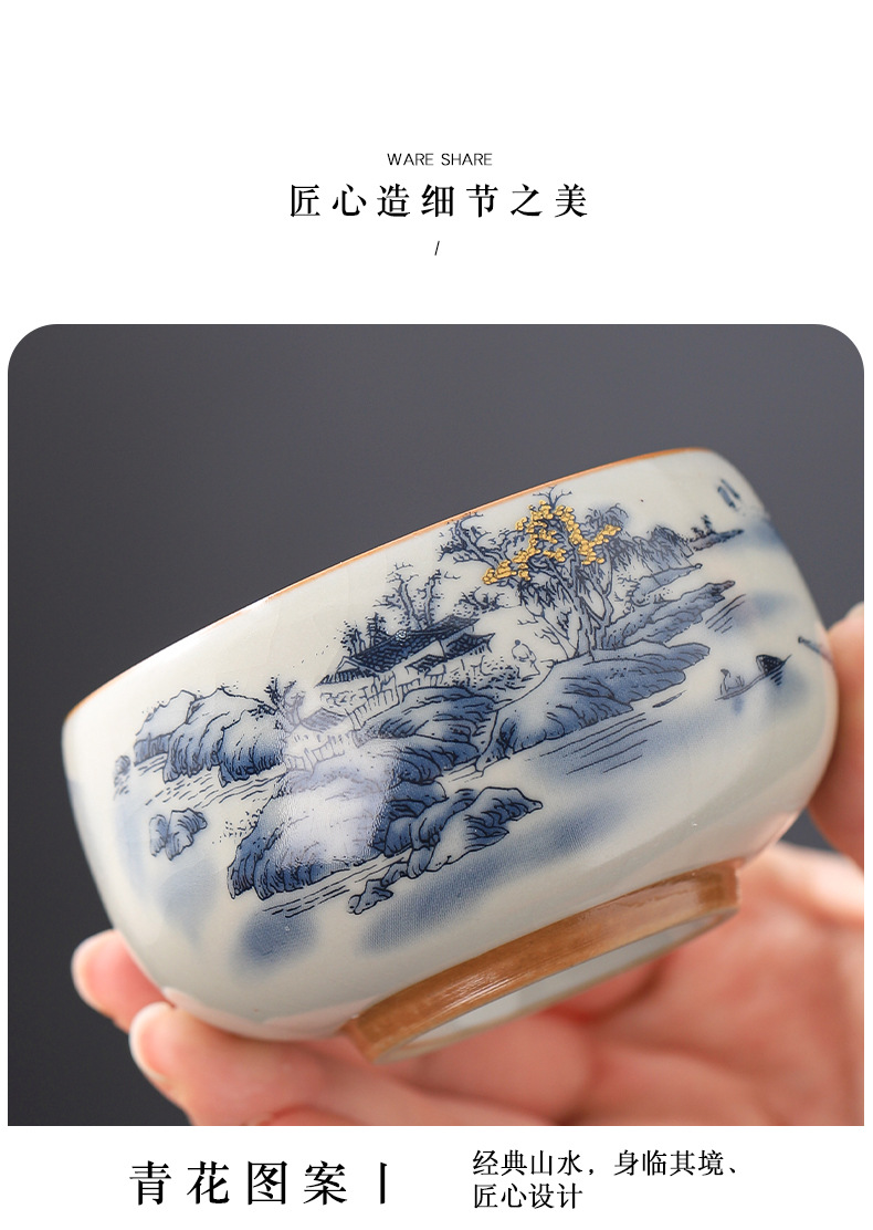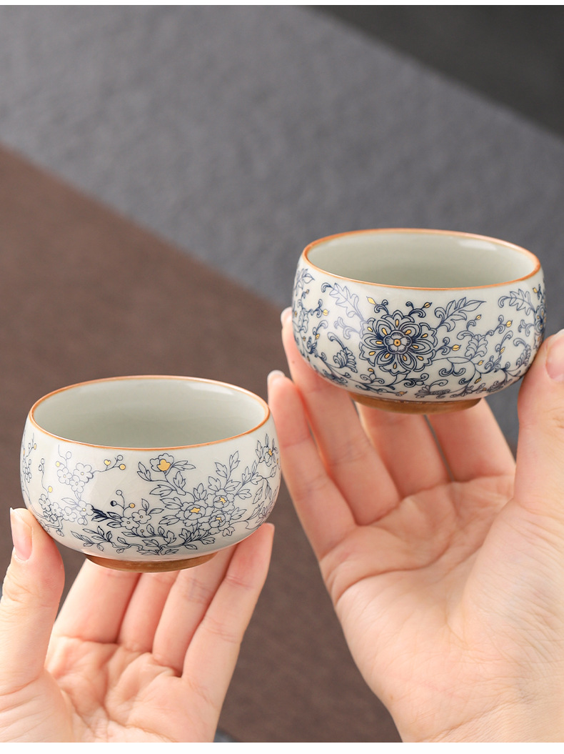 汝窑罗汉杯功夫茶具陶瓷主人杯开片可养茶杯青花缠枝莲品茗杯