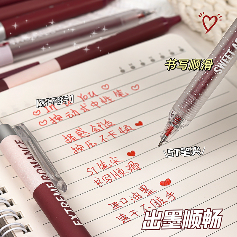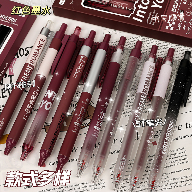 高颜值红笔红色中性笔波尔多碳素笔ins风ST少女心复古按动笔黑色