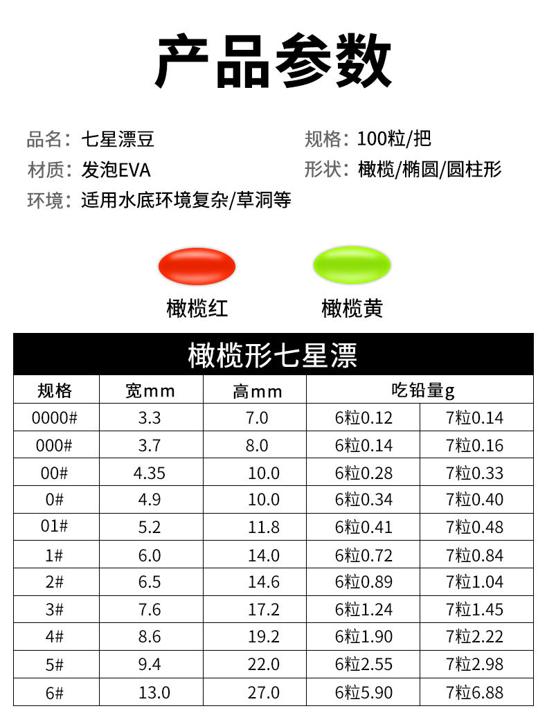 100粒 阿酷七星漂鱼漂浮漂流线橄榄形圆柱型散装七星瓢豆配件批发