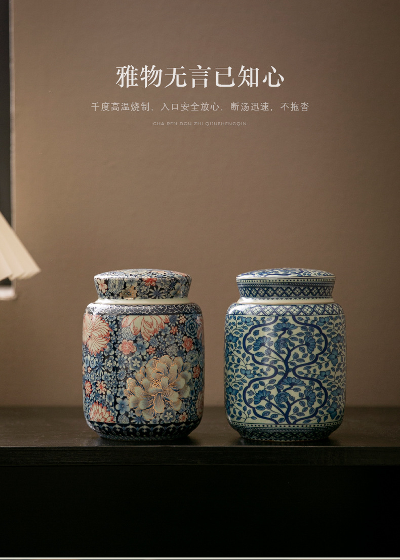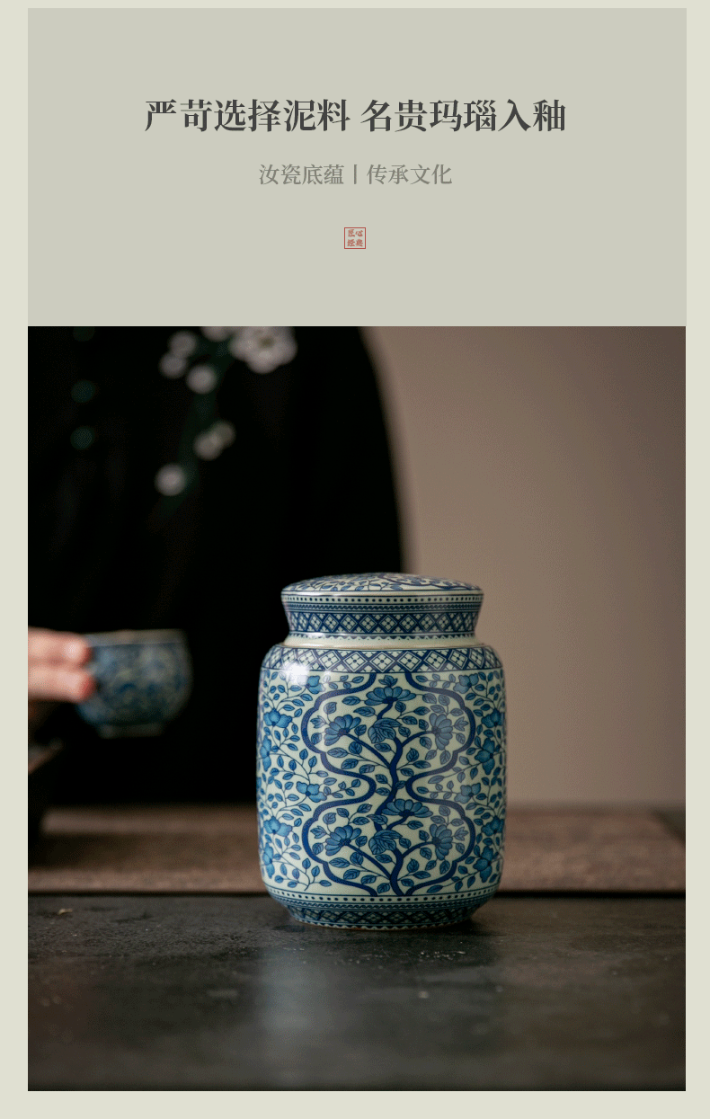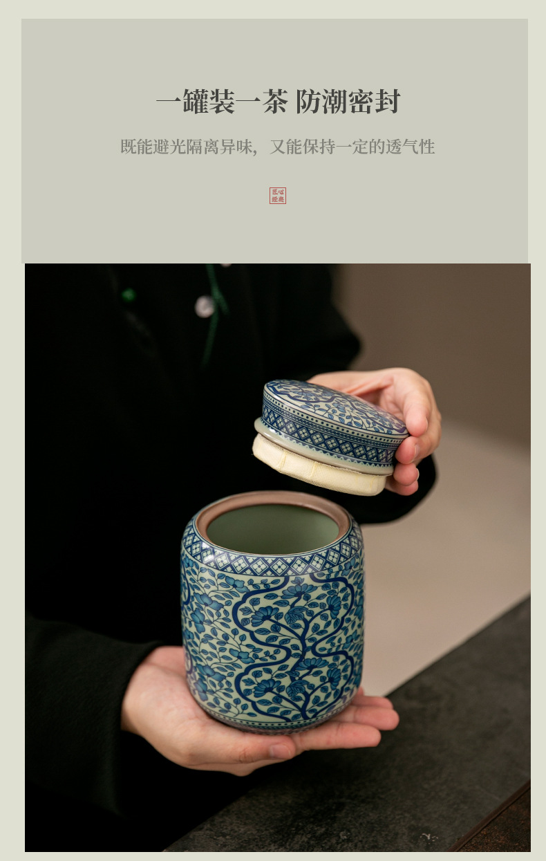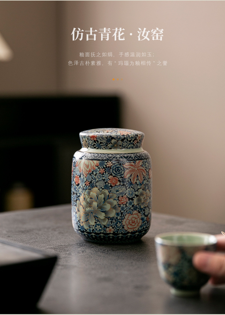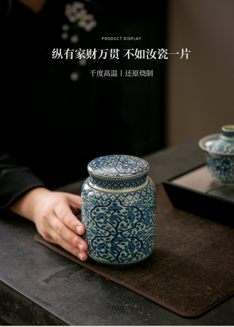 汝窑青花陶瓷家用小型中式茶叶密封罐储存罐茶叶罐可养复古存茶罐