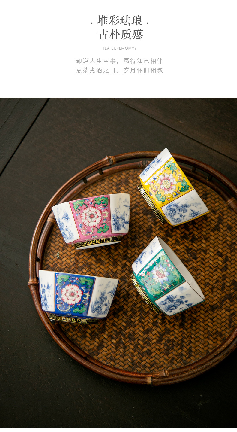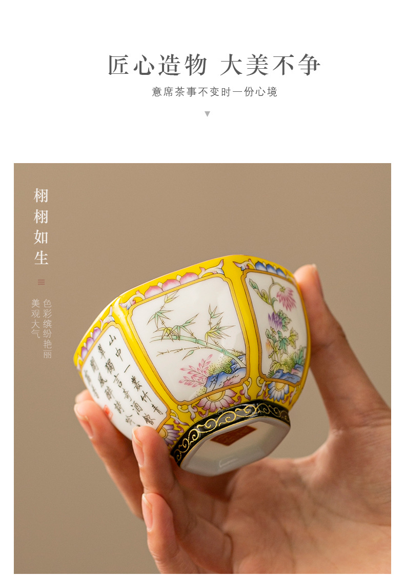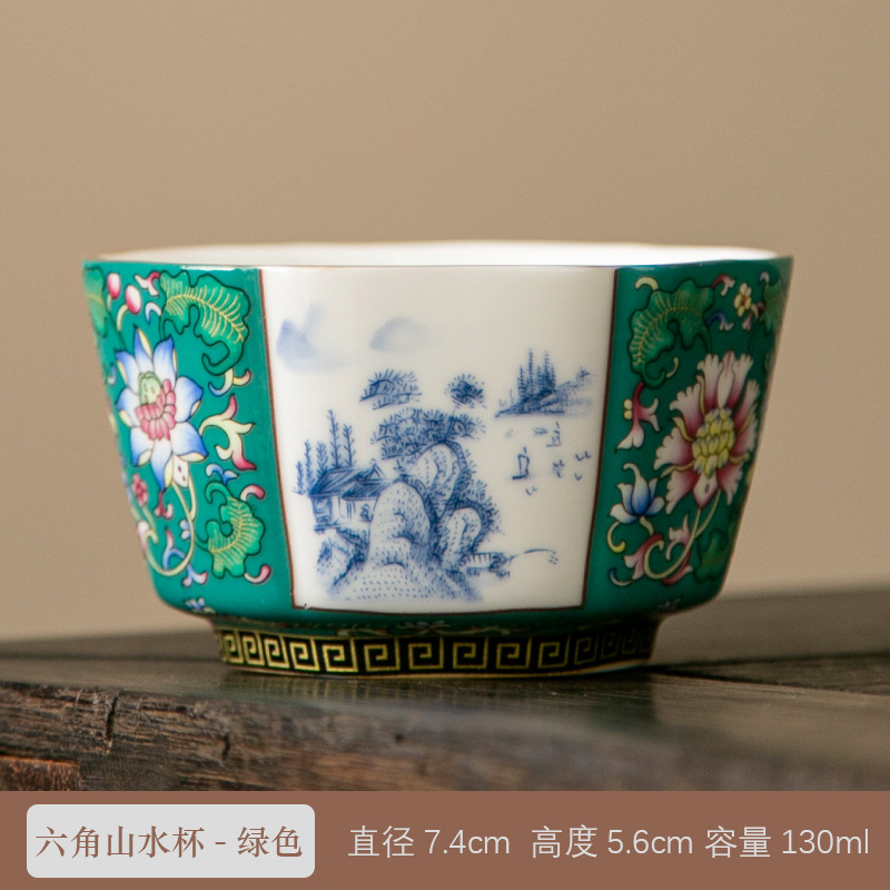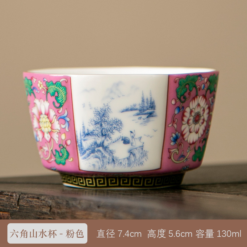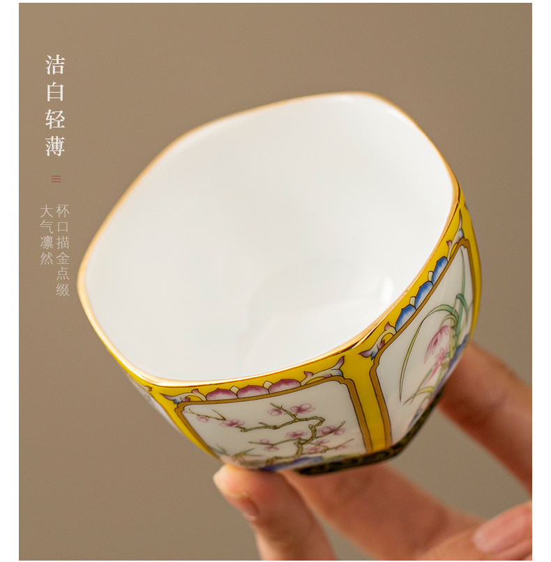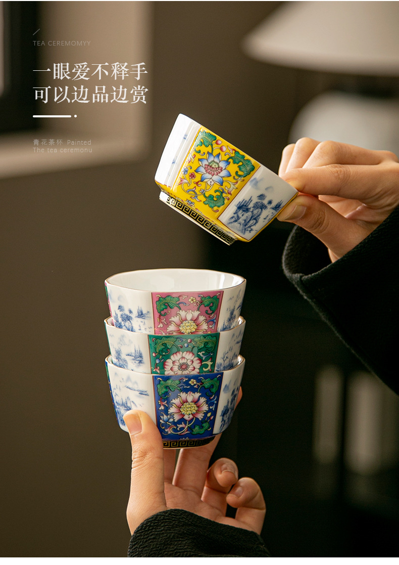 轻奢珐琅彩单个陶瓷主人杯功夫茶具家用六方茶盏杯礼盒套装伴手礼