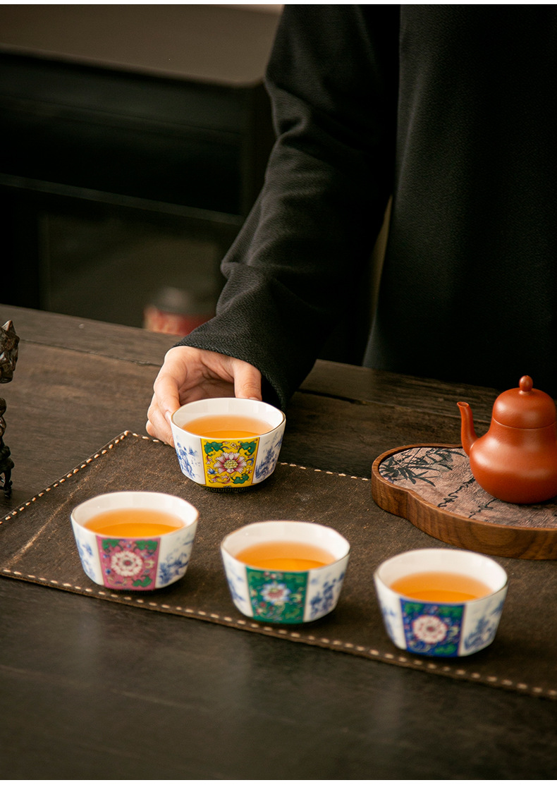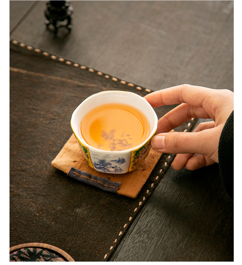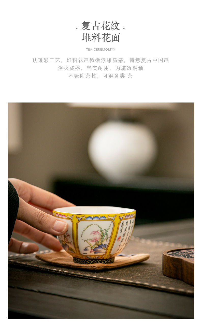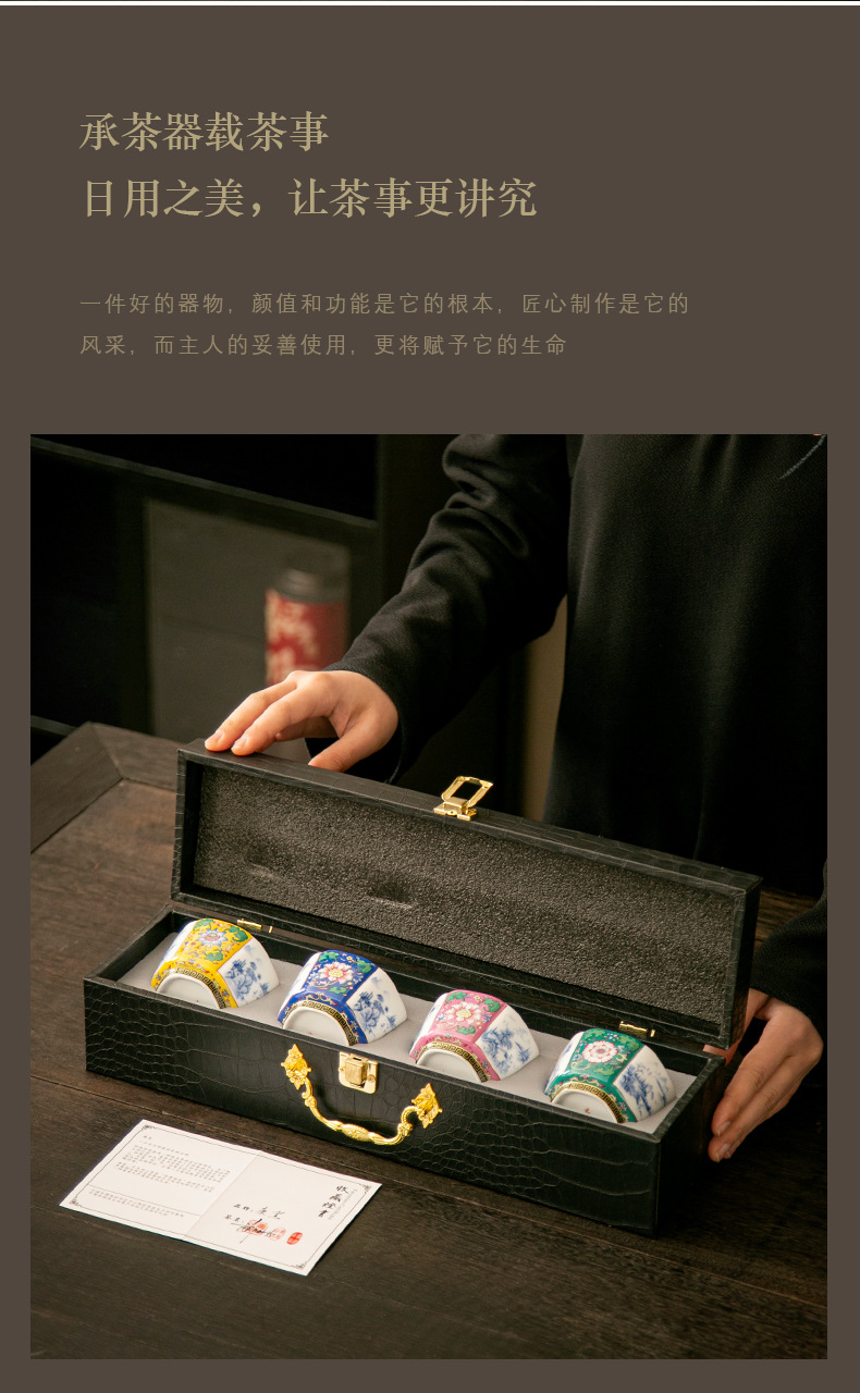 轻奢珐琅彩单个陶瓷主人杯功夫茶具家用六方茶盏杯礼盒套装伴手礼