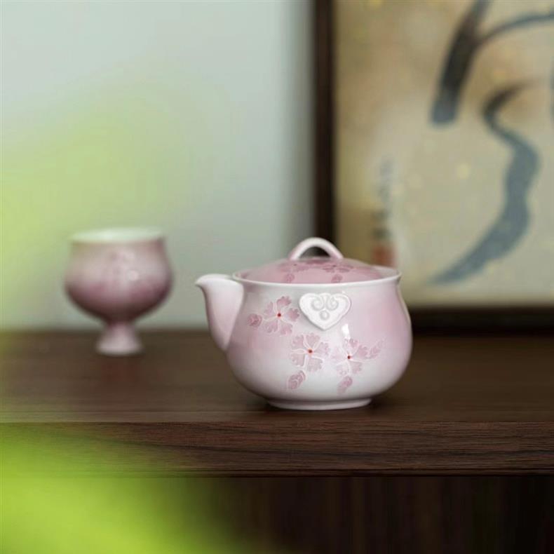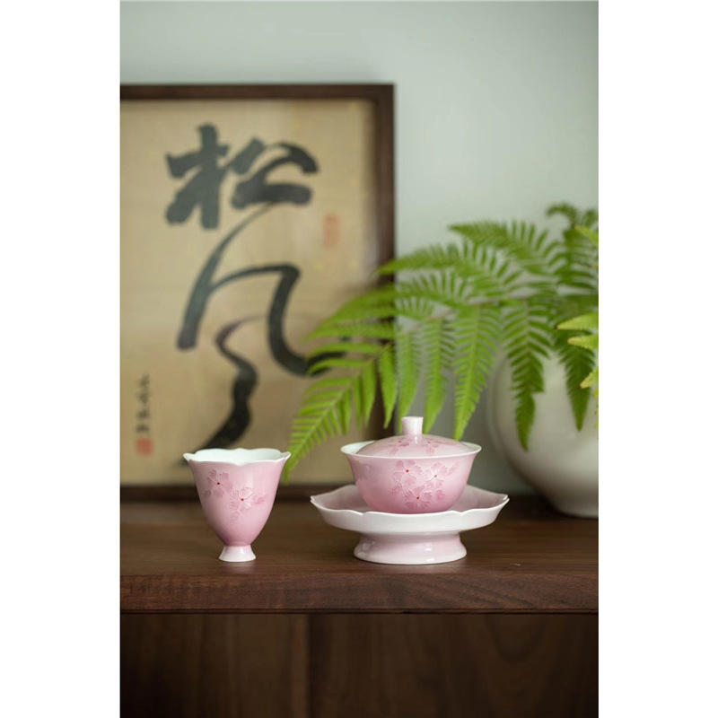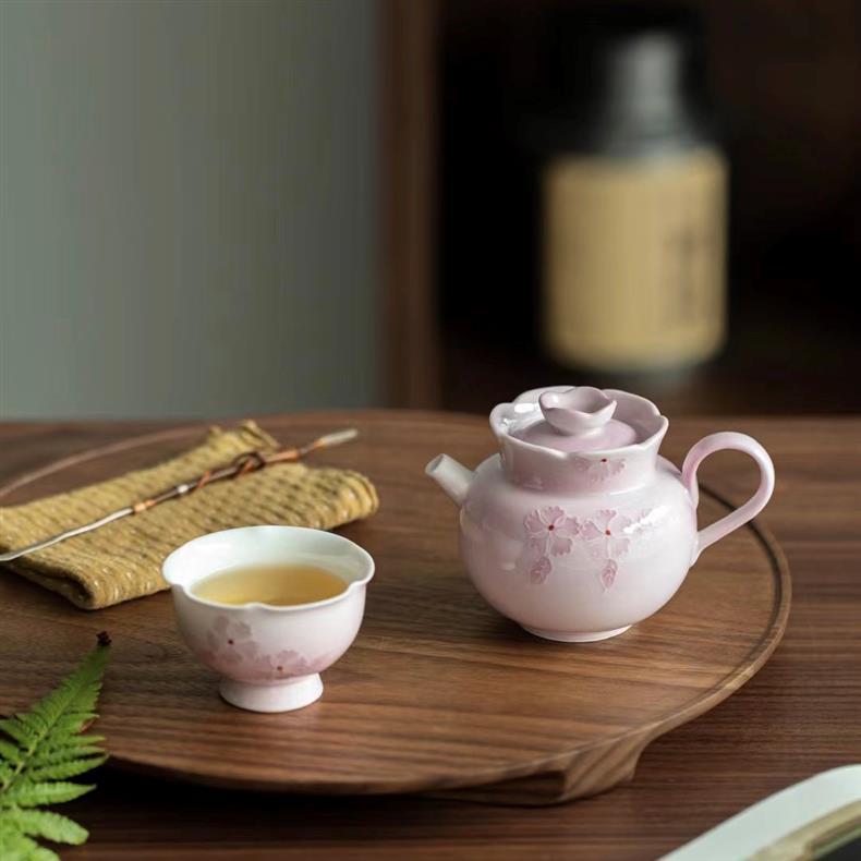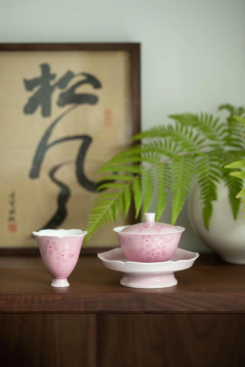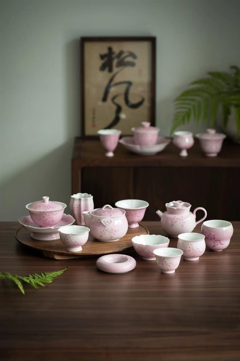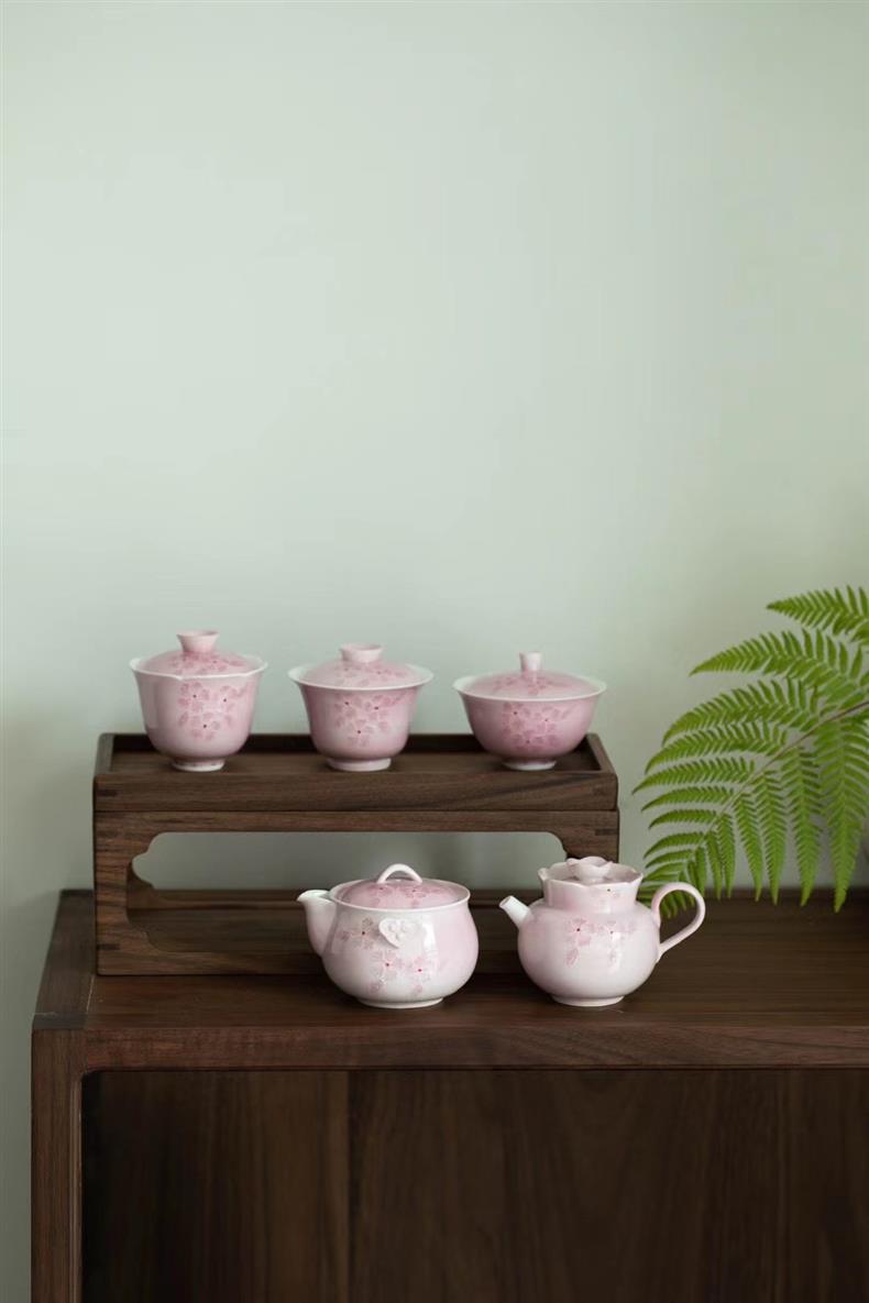 新品粉彩堆料樱花釉下彩手绘高温茶壶茶杯盖碗功夫茶具送礼佳品