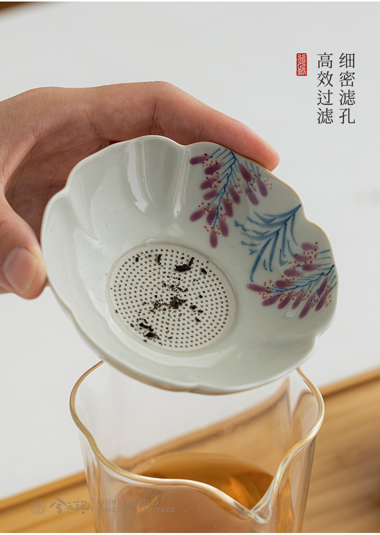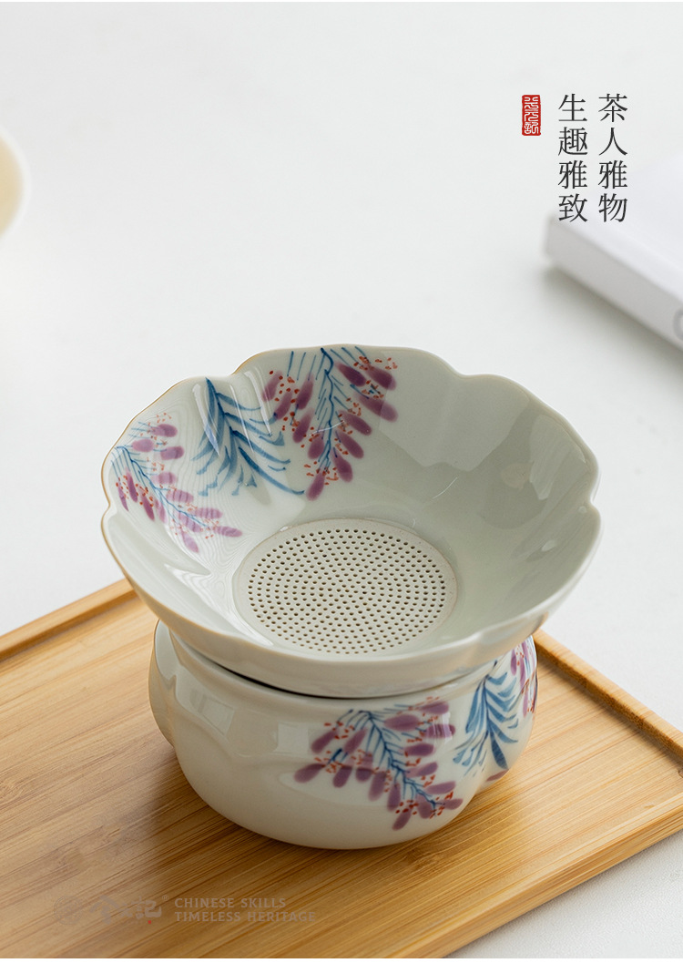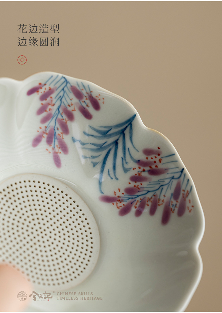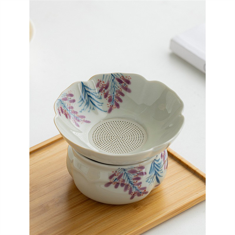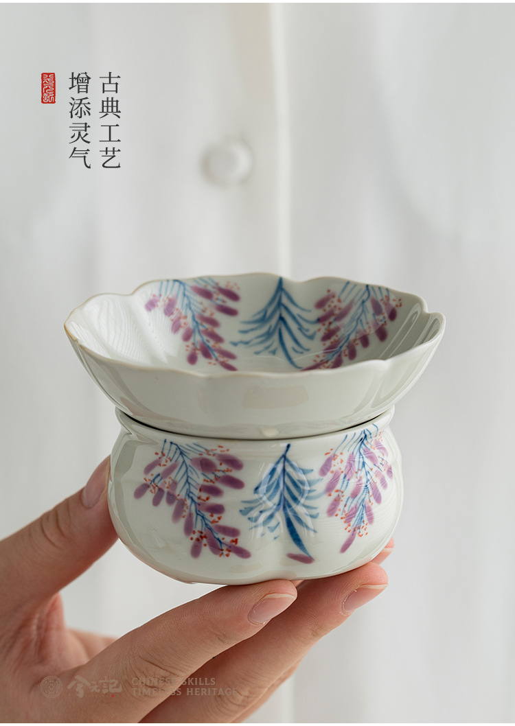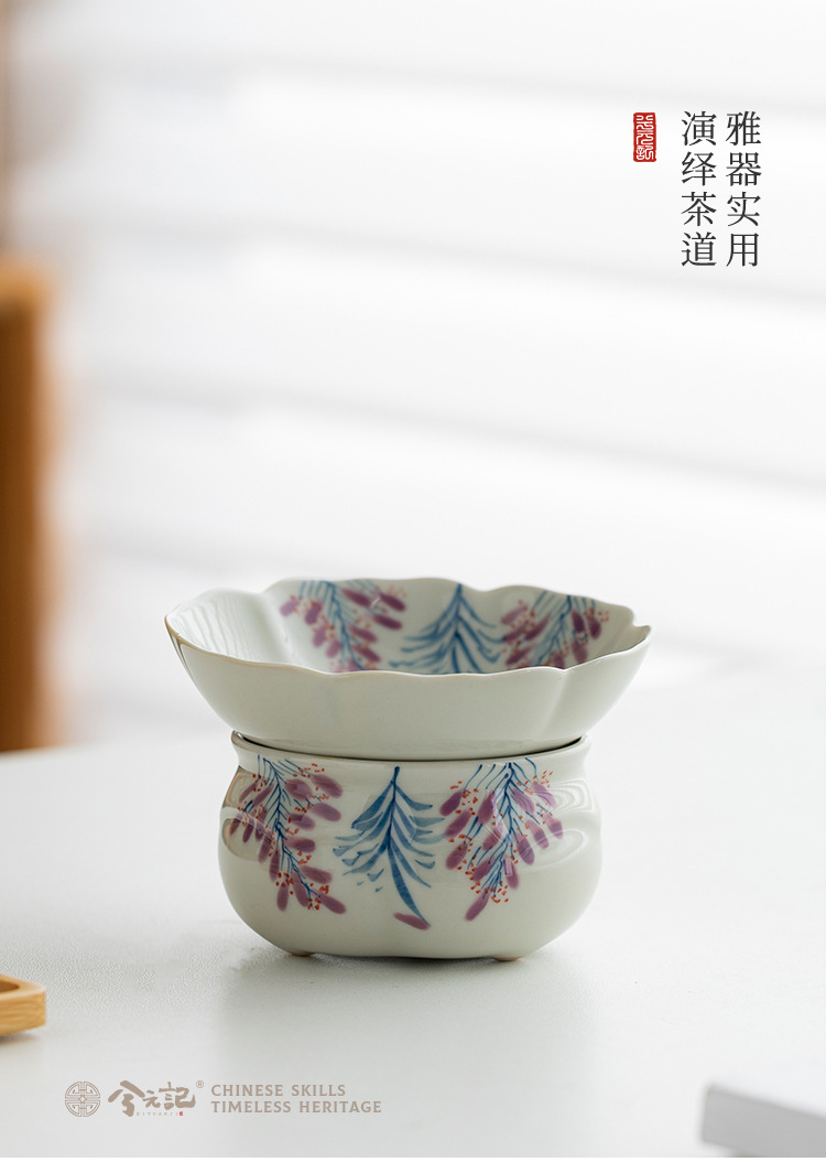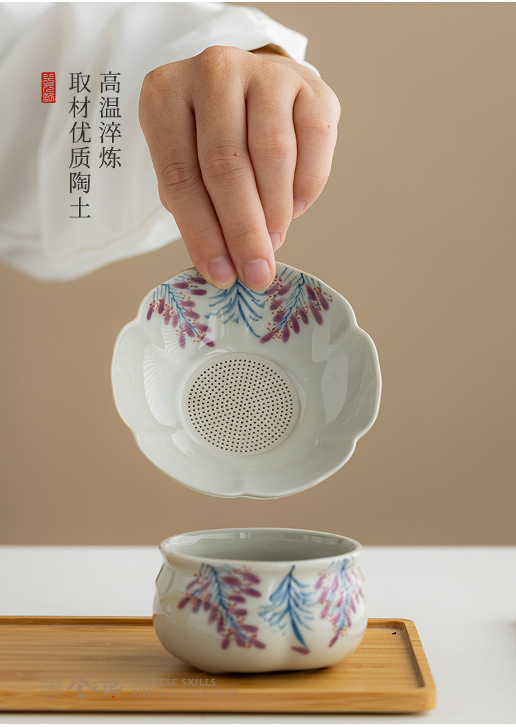 手绘釉下彩紫藤花茶漏茶滤陶瓷茶叶过滤网一体家用滤茶器茶具配件