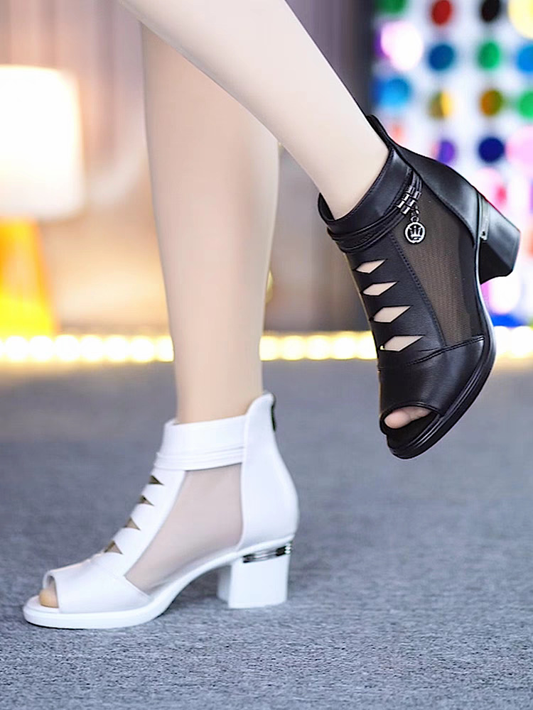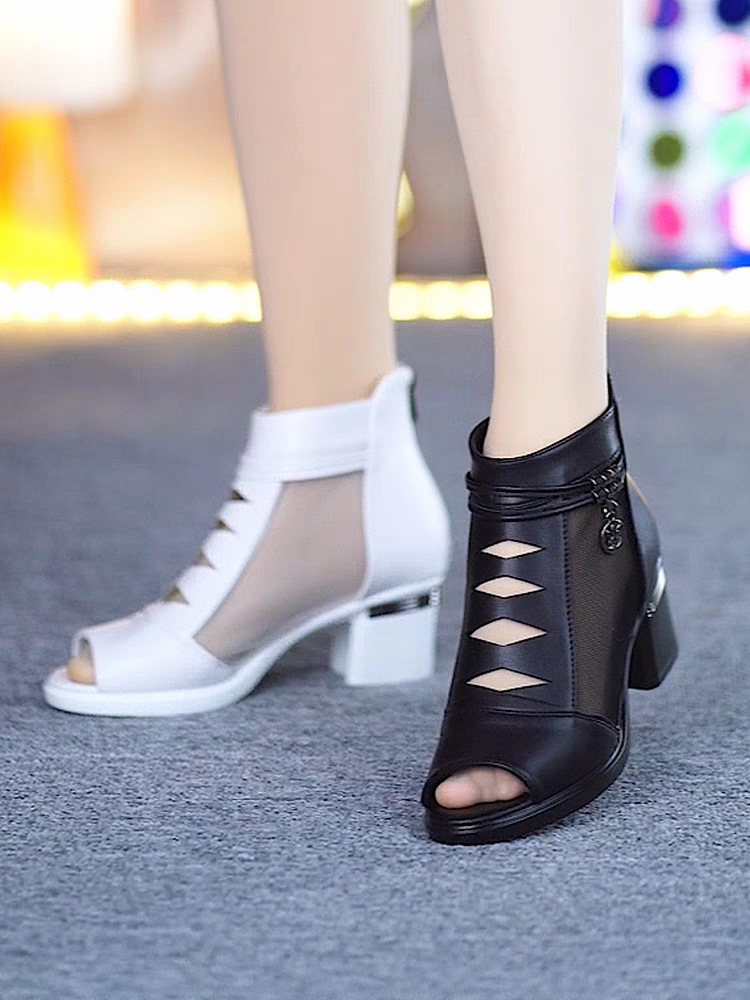 2024夏季新款凉鞋女软皮中跟网纱短靴时尚中跟凉靴粗跟镂空鱼嘴