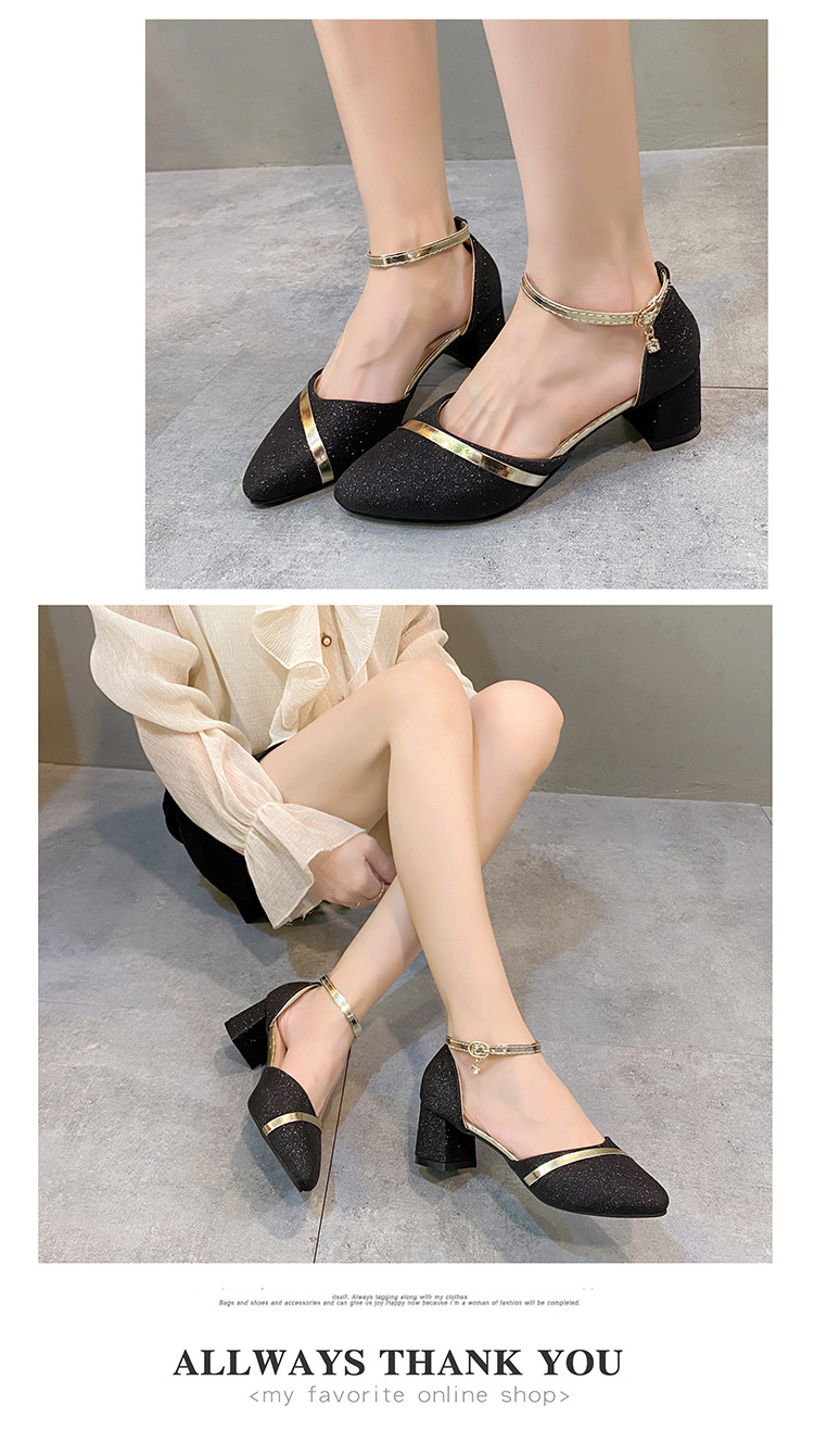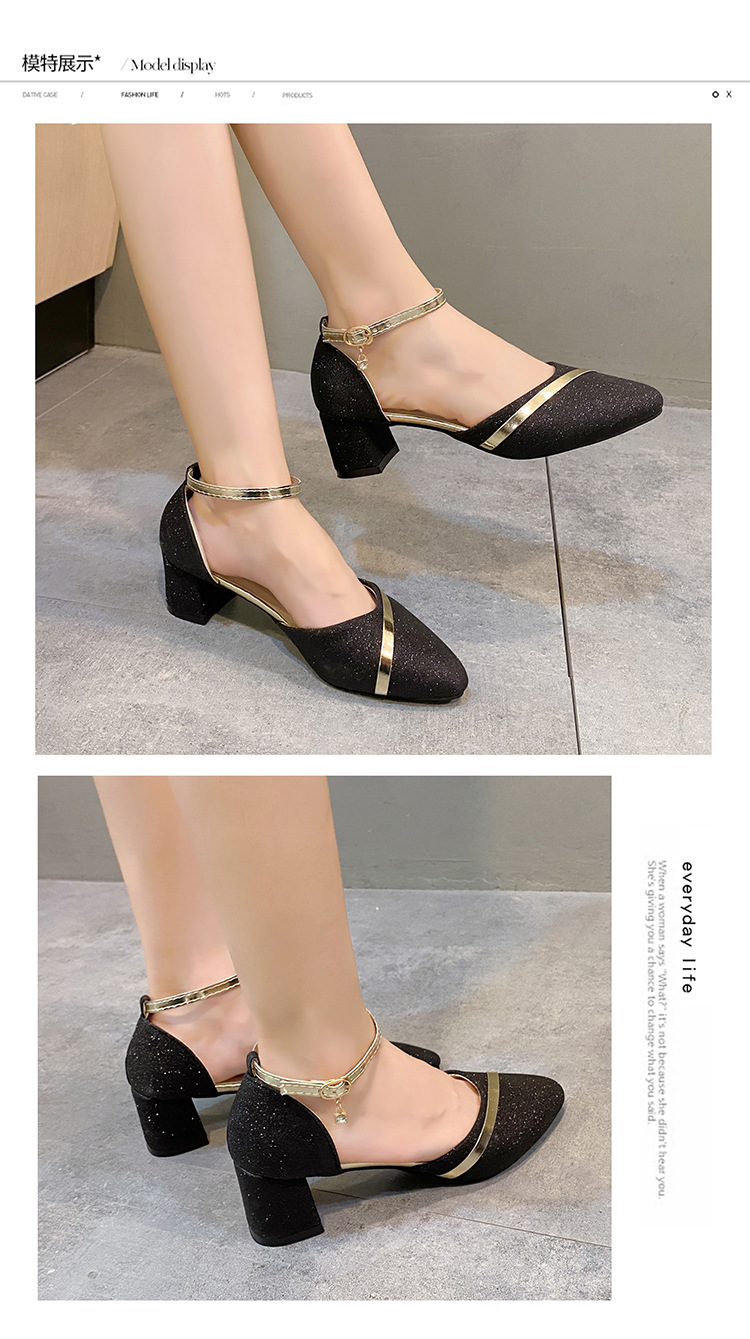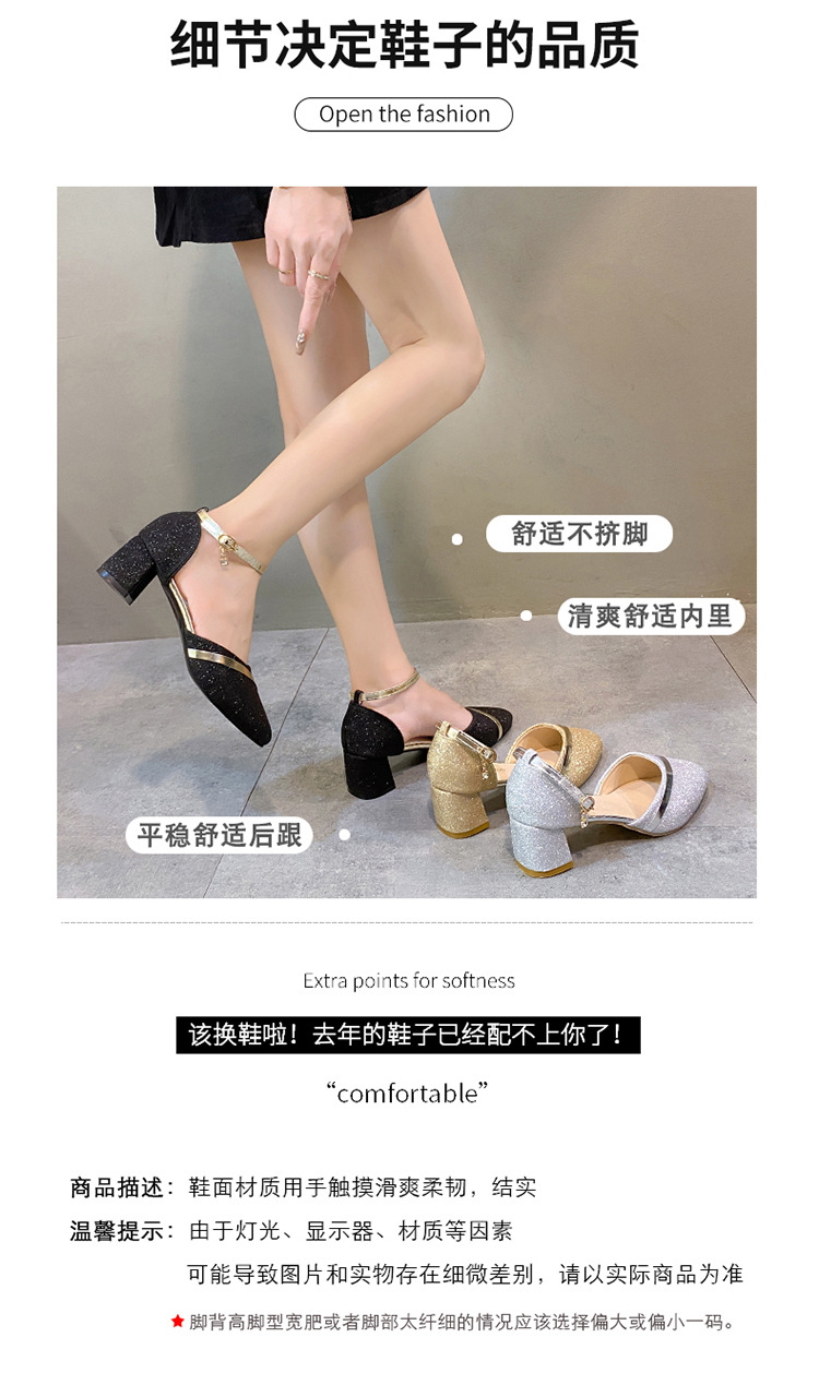 2024春季新款一字扣包头凉鞋女韩版粗跟高跟鞋尖头中空日常女凉鞋