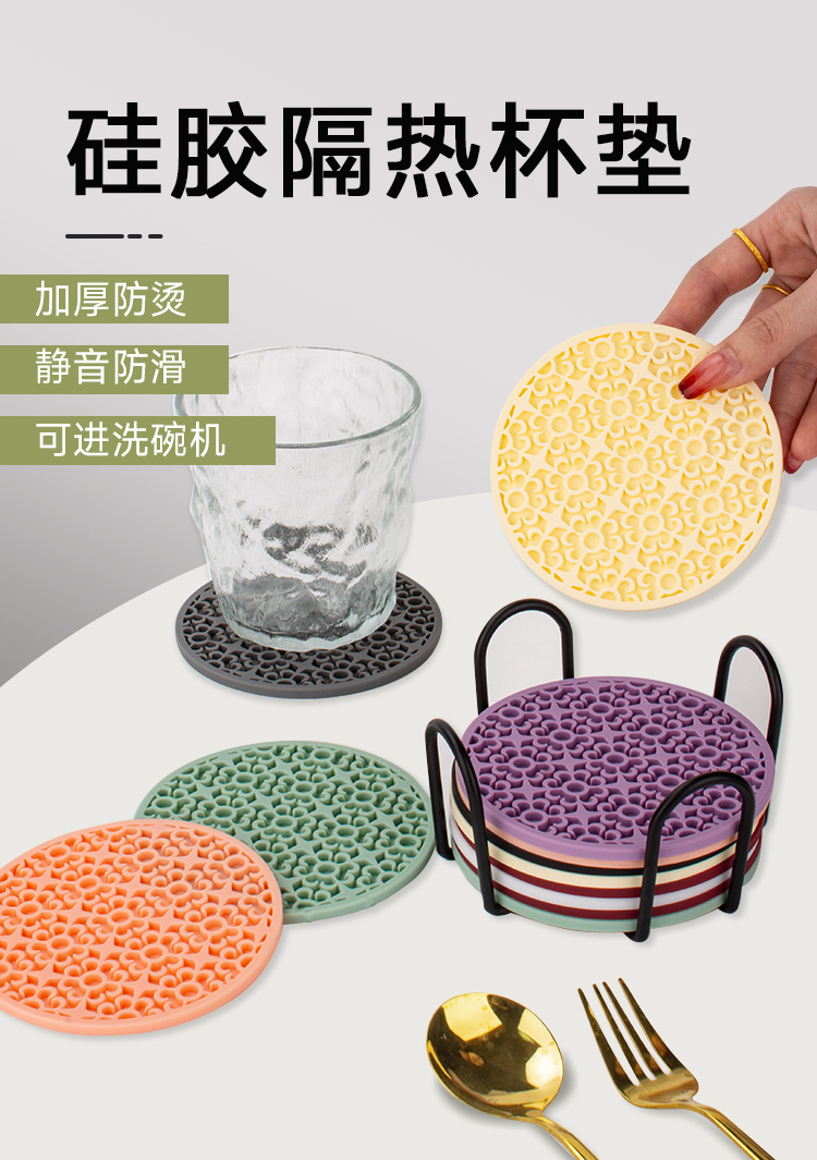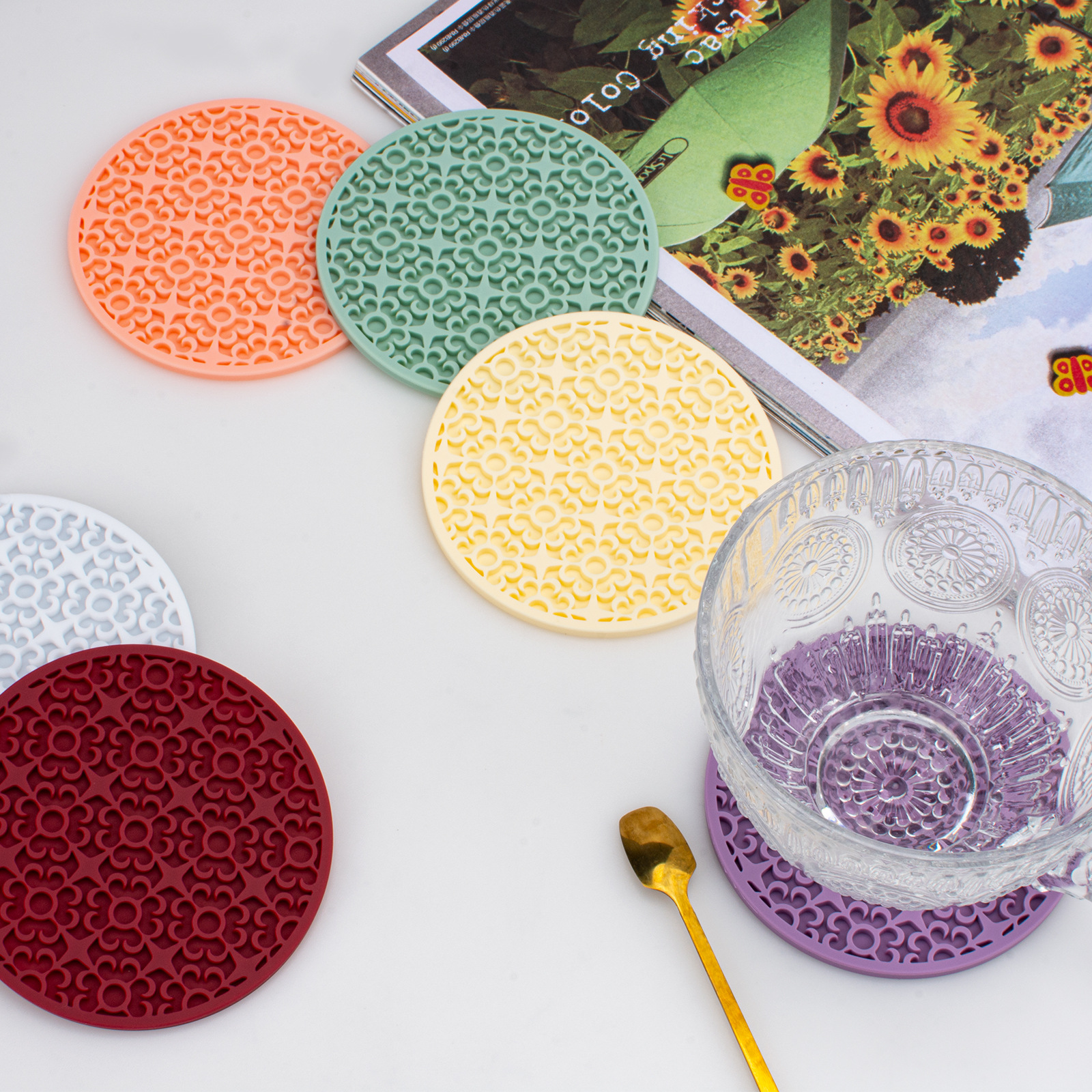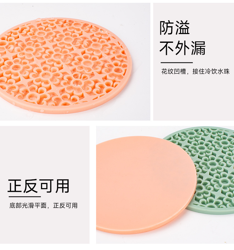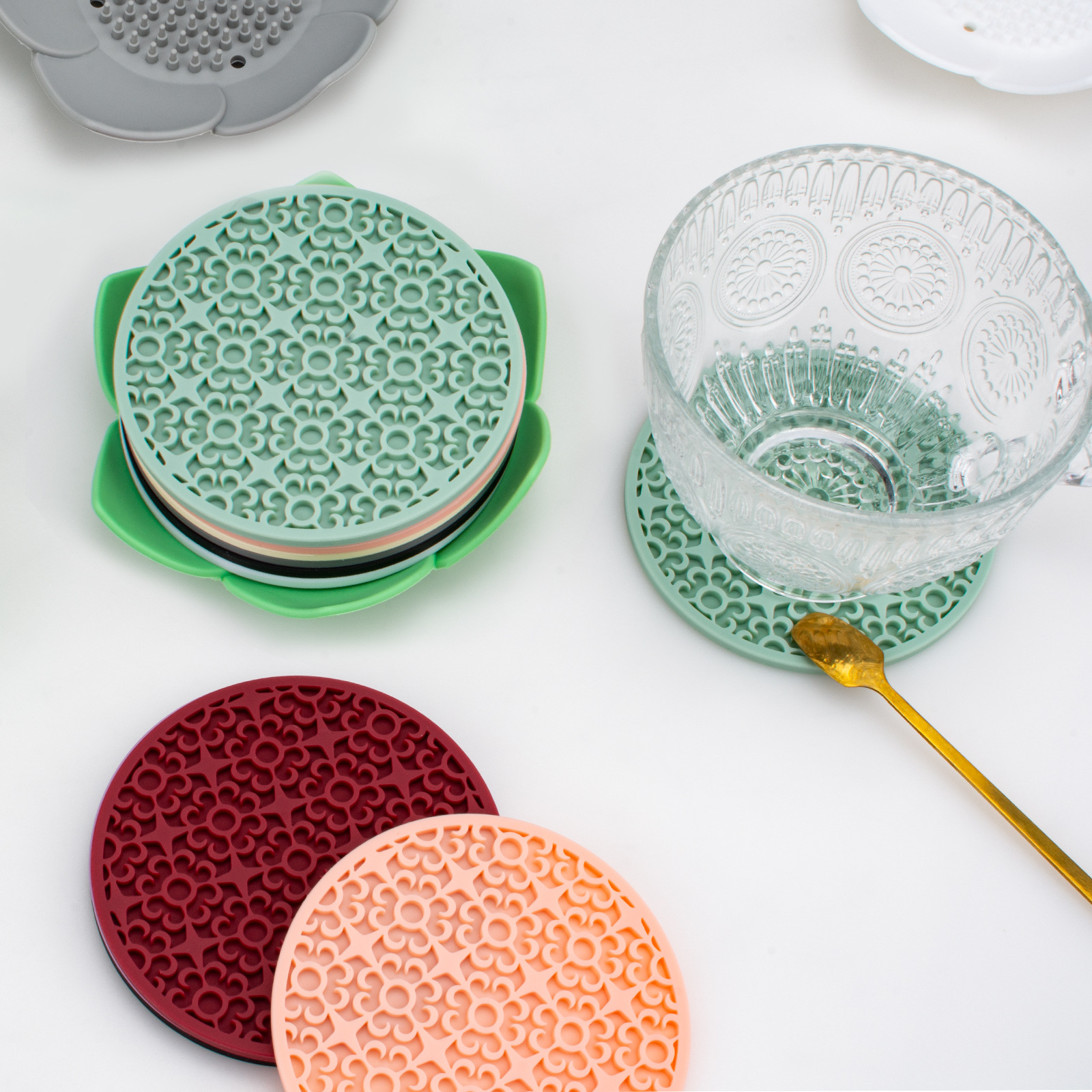 复古花纹沥水硅胶圆形杯垫隔热软胶茶杯垫套装可配杯垫收纳盒架子