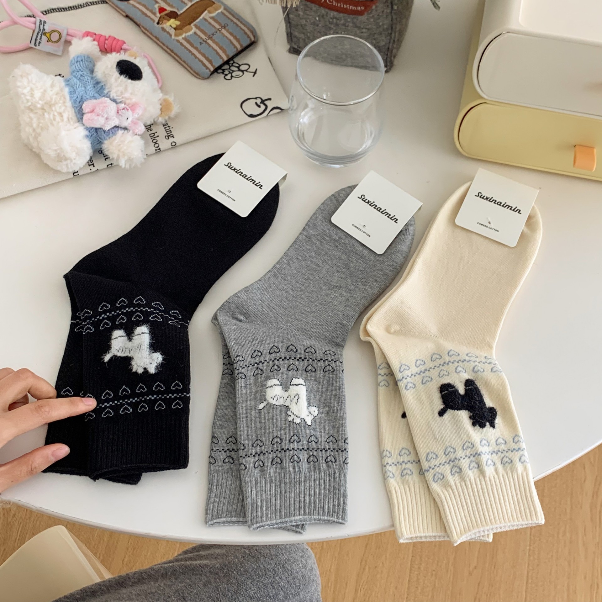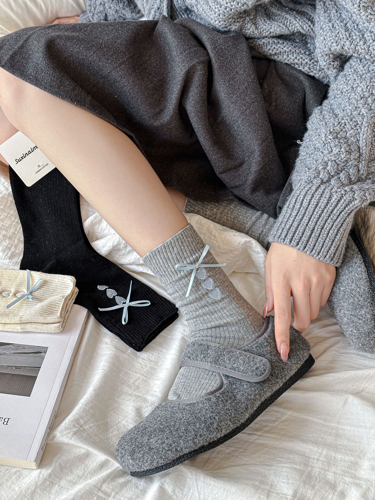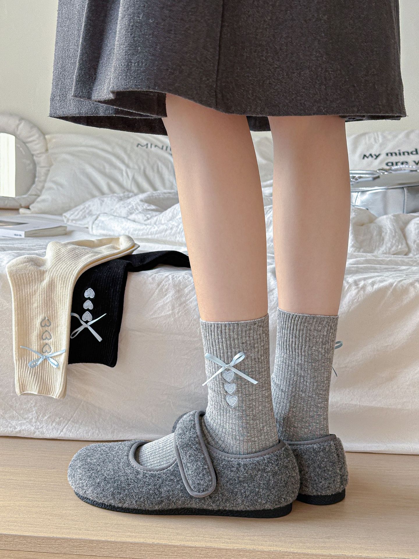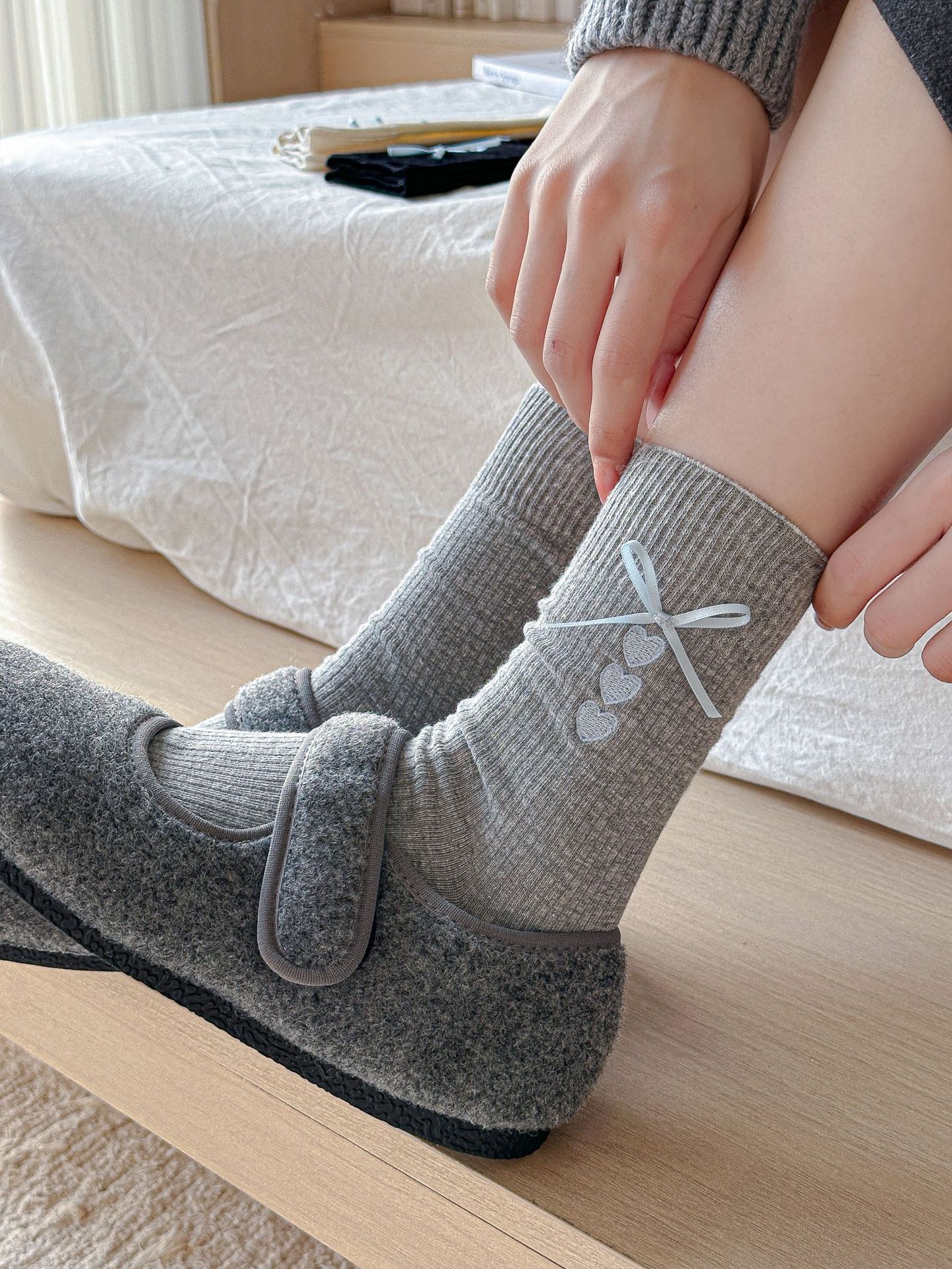 韩版刺绣爱心灰色袜子中筒袜蓝丝带蝴蝶结甜美堆堆袜miu系少女袜
