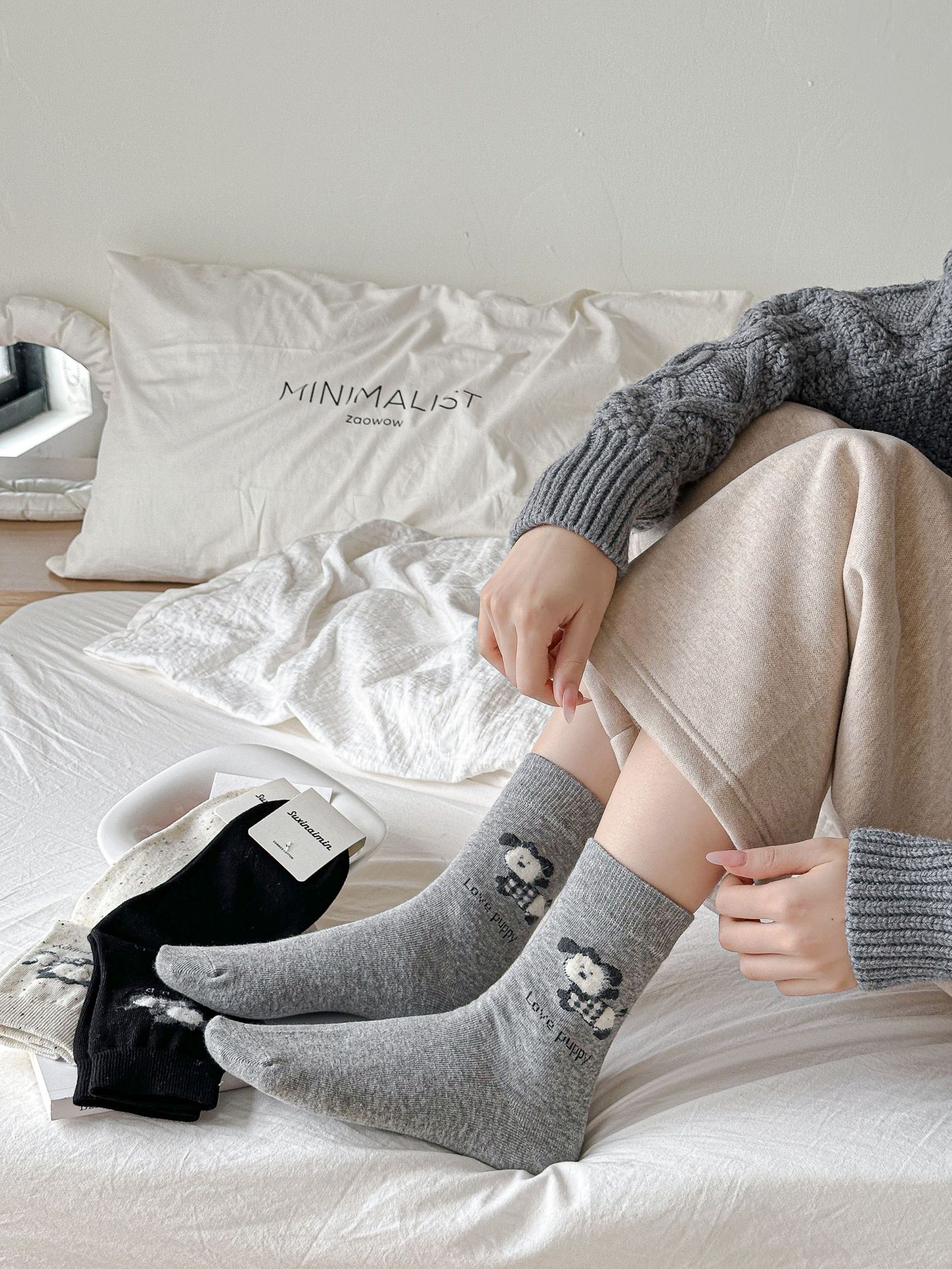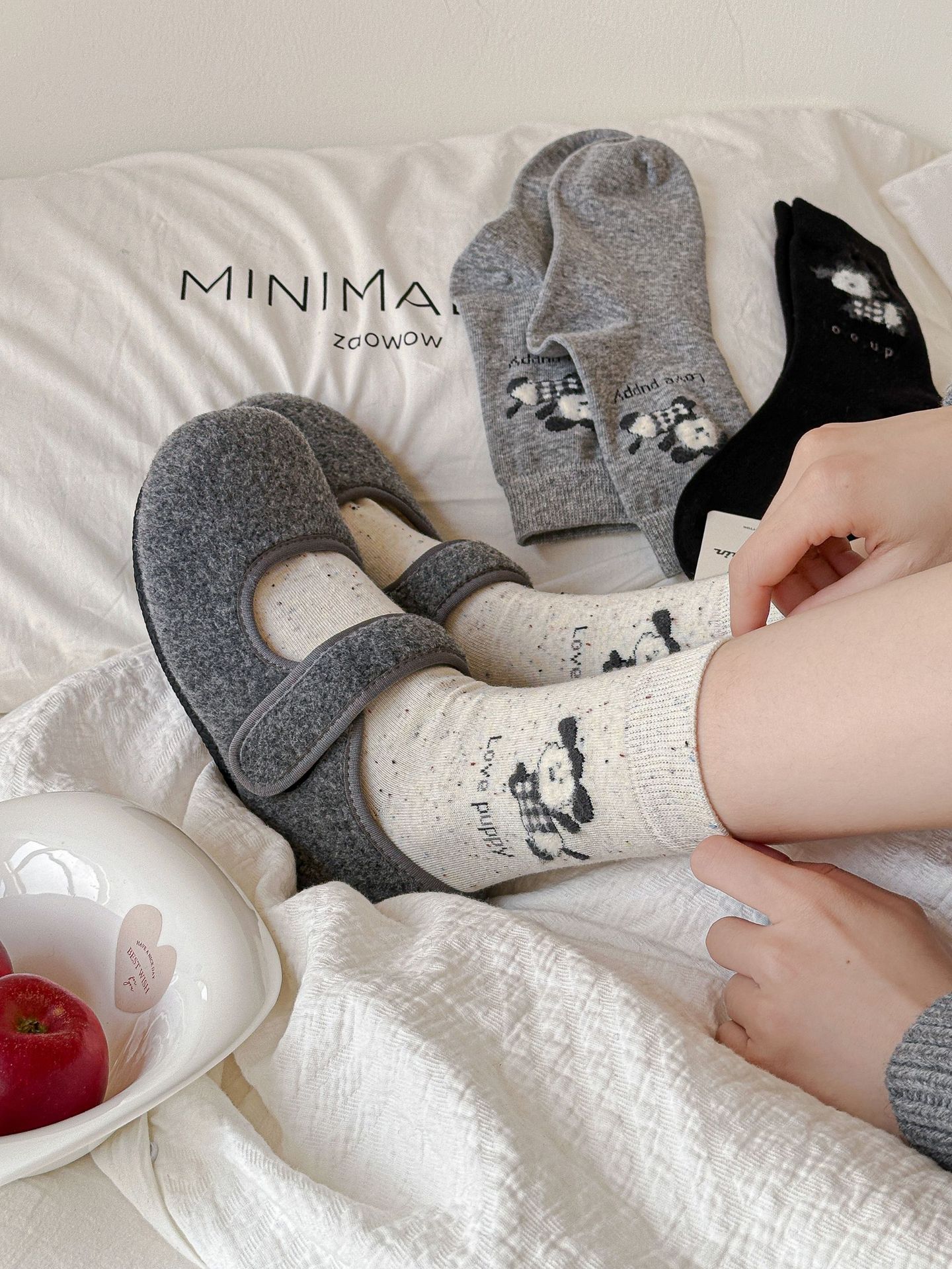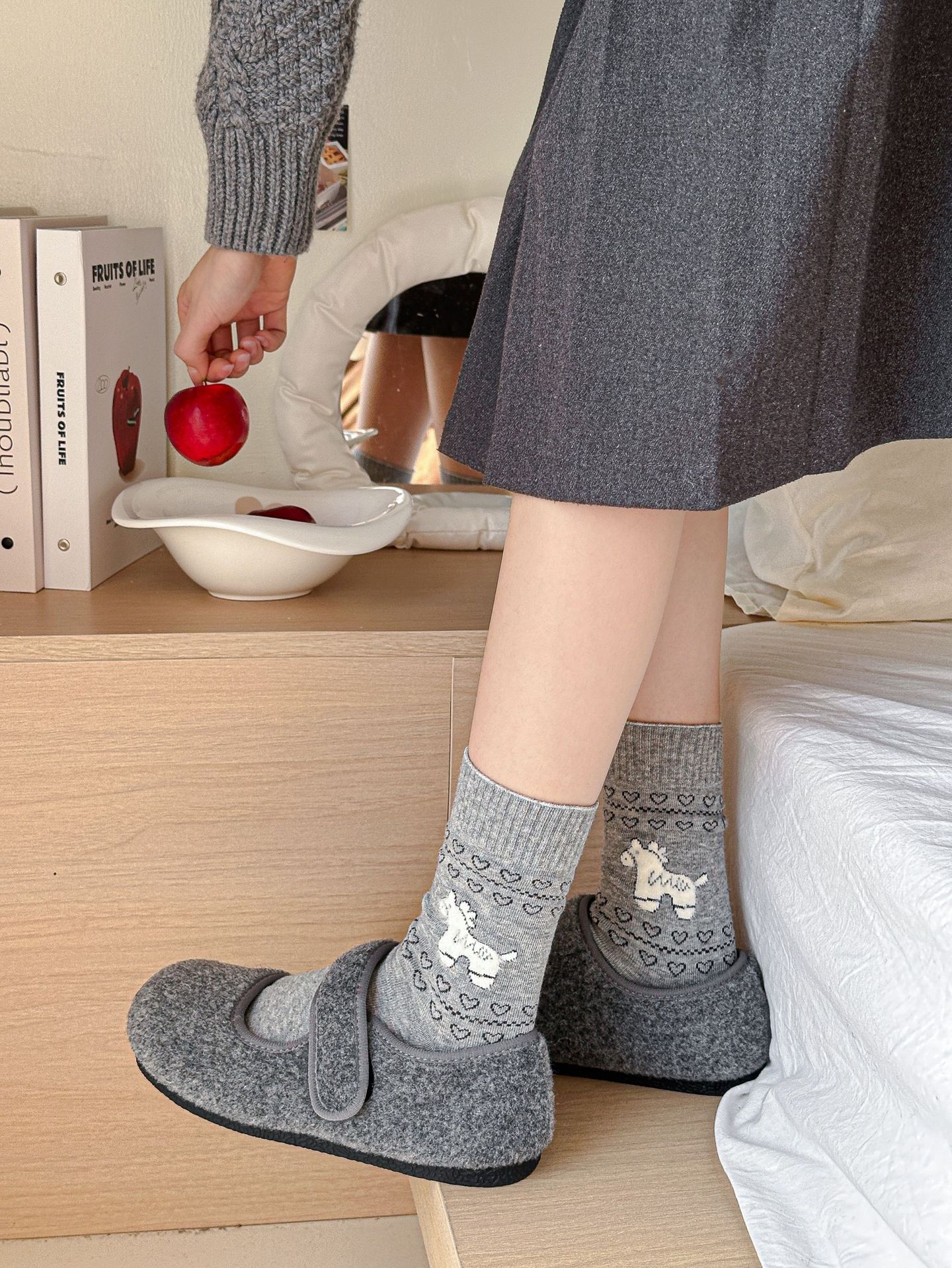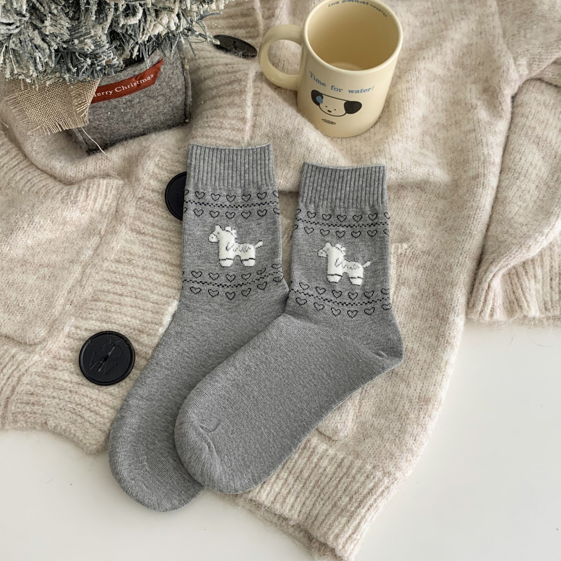 韩版刺绣爱心灰色袜子中筒袜蓝丝带蝴蝶结甜美堆堆袜miu系少女袜