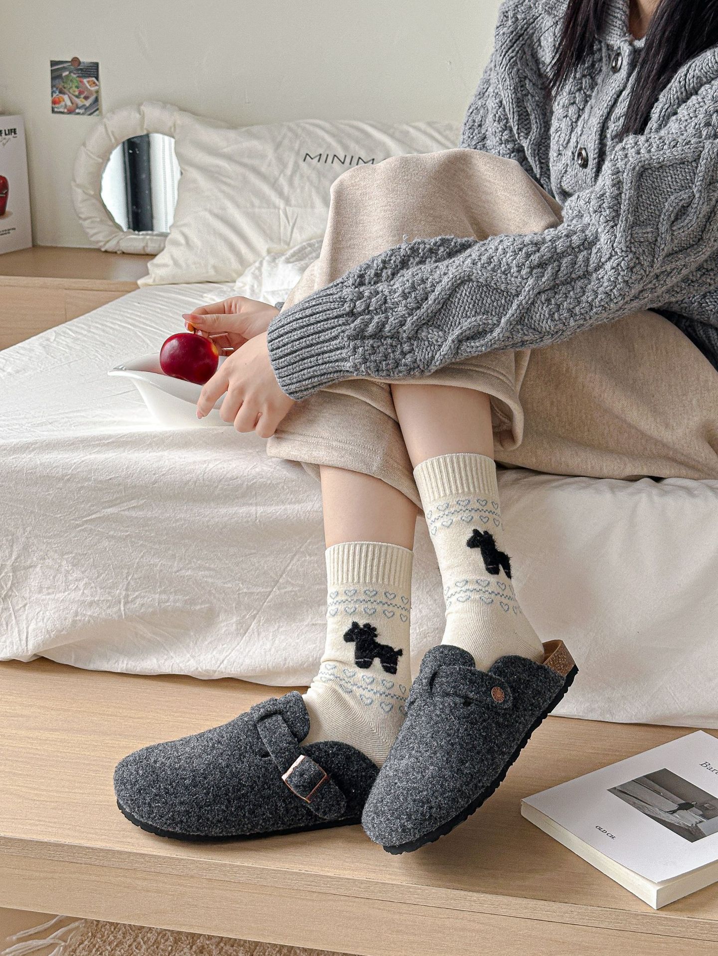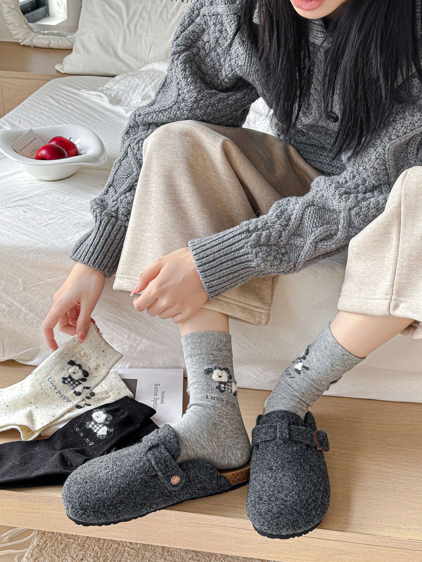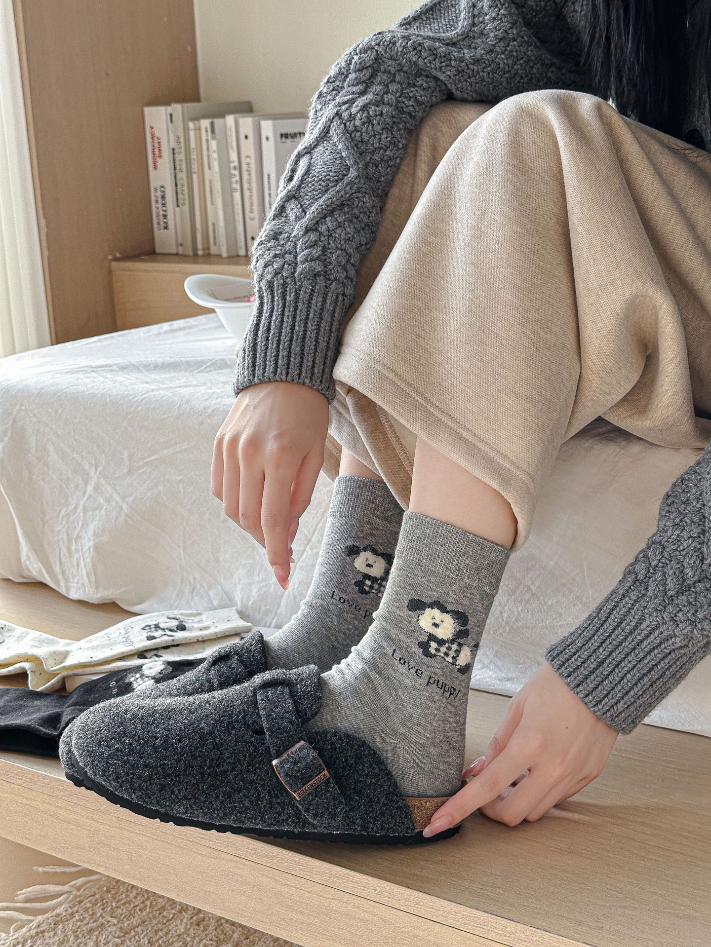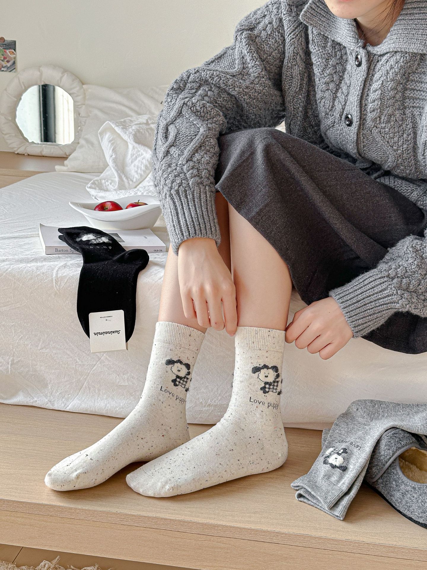 韩版刺绣爱心灰色袜子中筒袜蓝丝带蝴蝶结甜美堆堆袜miu系少女袜