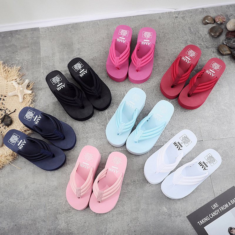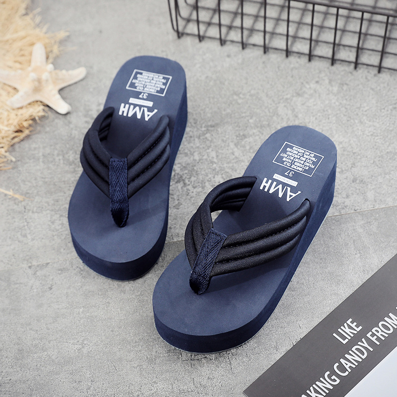 亚马逊爆款粗带厚底防滑人字拖女 百搭6.5cm高跟夹脚外穿沙滩鞋