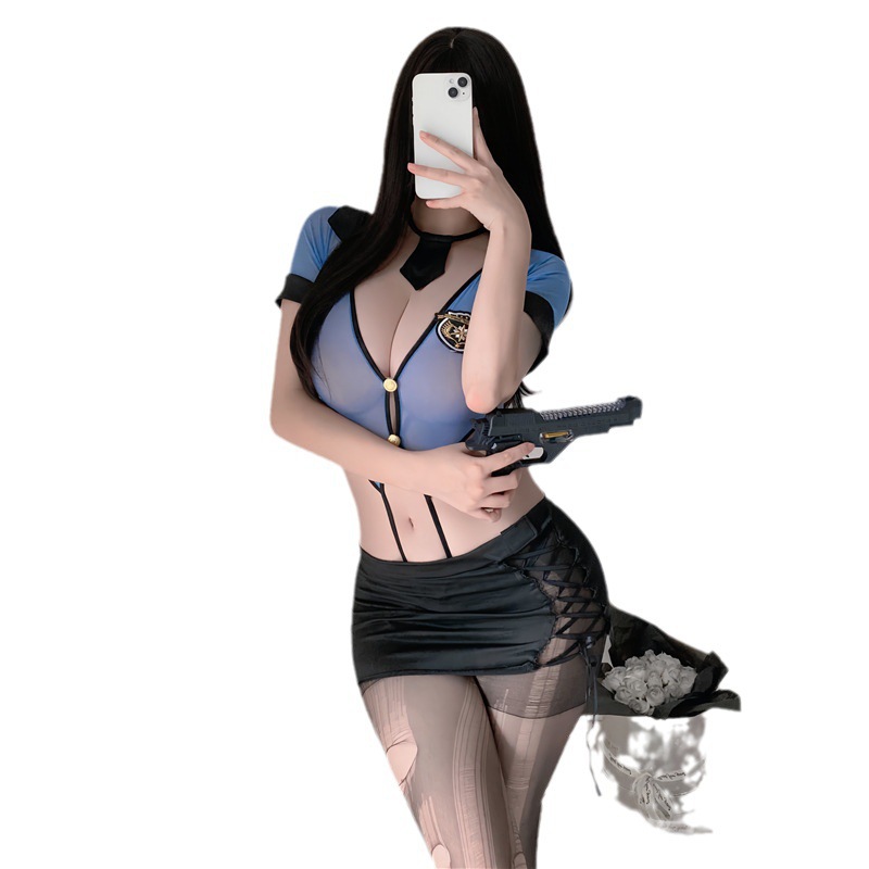 情趣内衣女警制服cos连体套装性感镂空绑带火辣透视V领秘书包臀裙