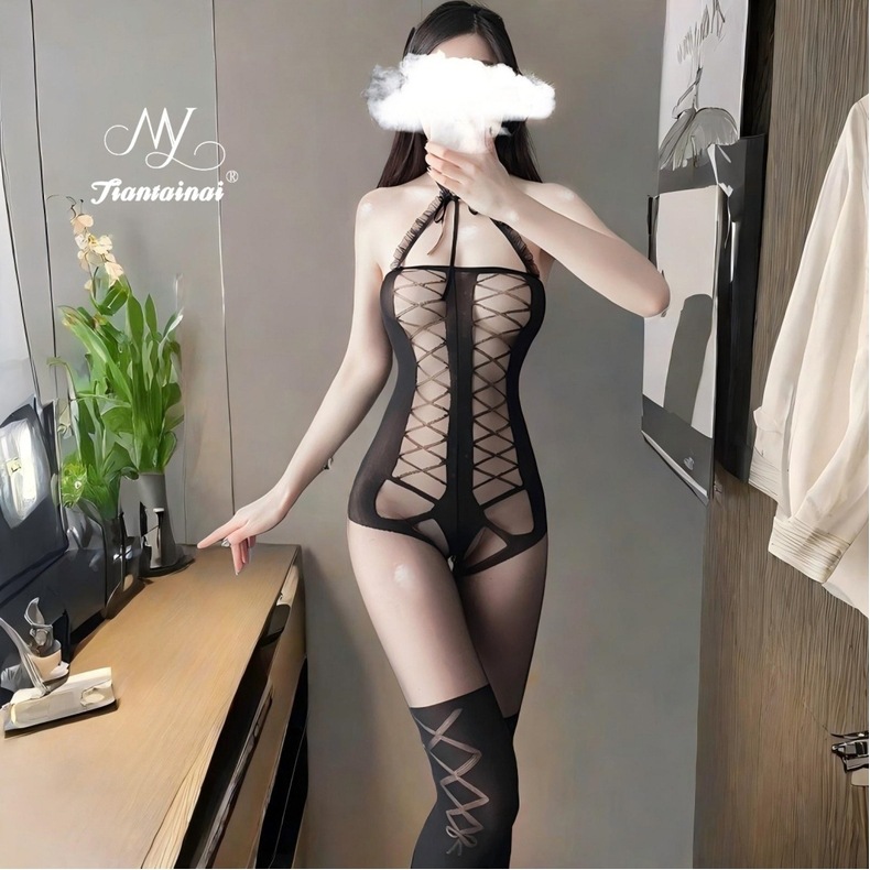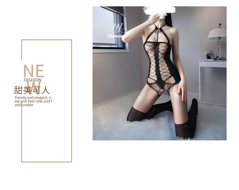 情趣内衣性感挂脖激情SM开裆大码丝袜连体衣纯欲蕾丝制服诱惑套装