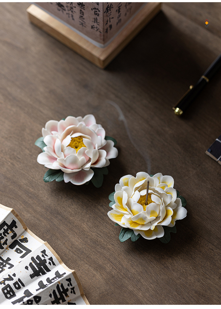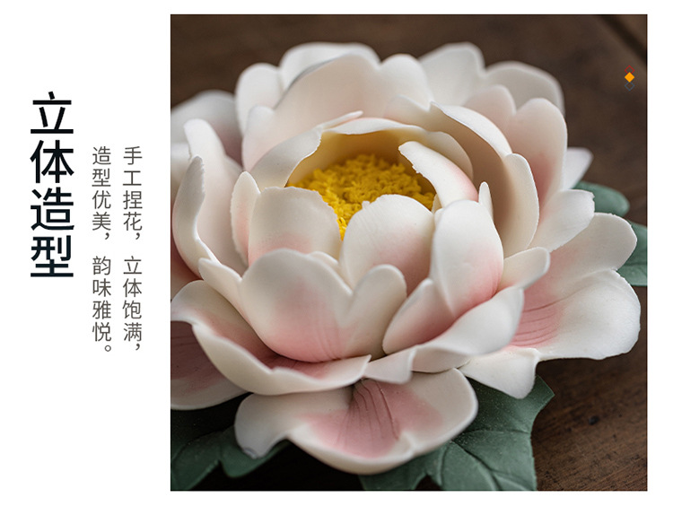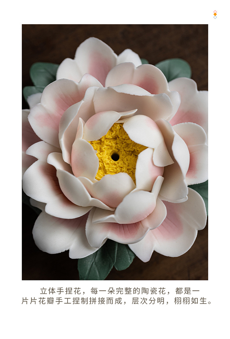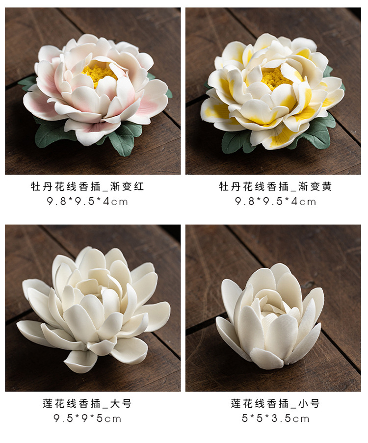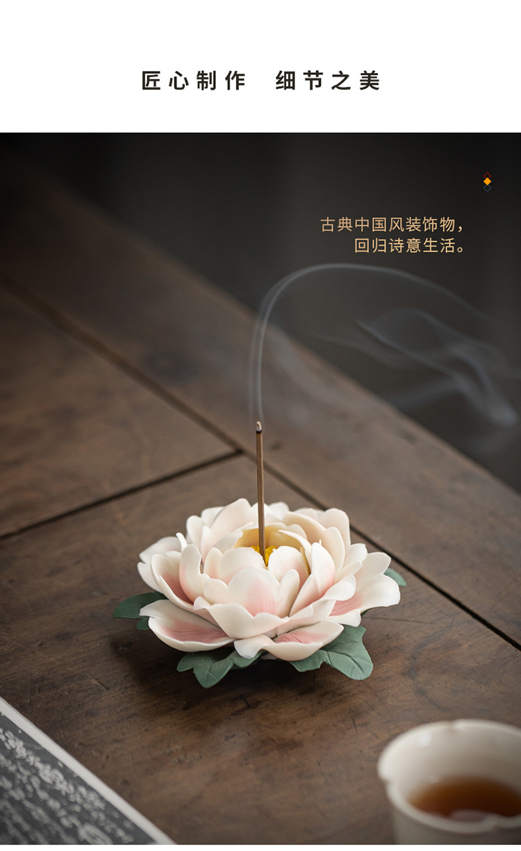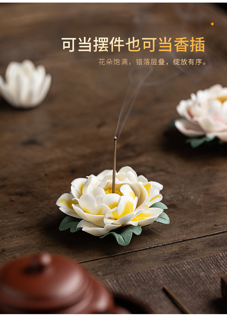 陶瓷莲花摆件禅意家居饰品纯手工莲花牡丹花线香炉客厅装饰工艺品