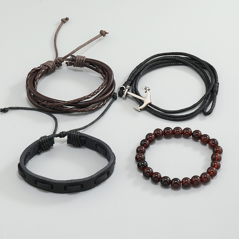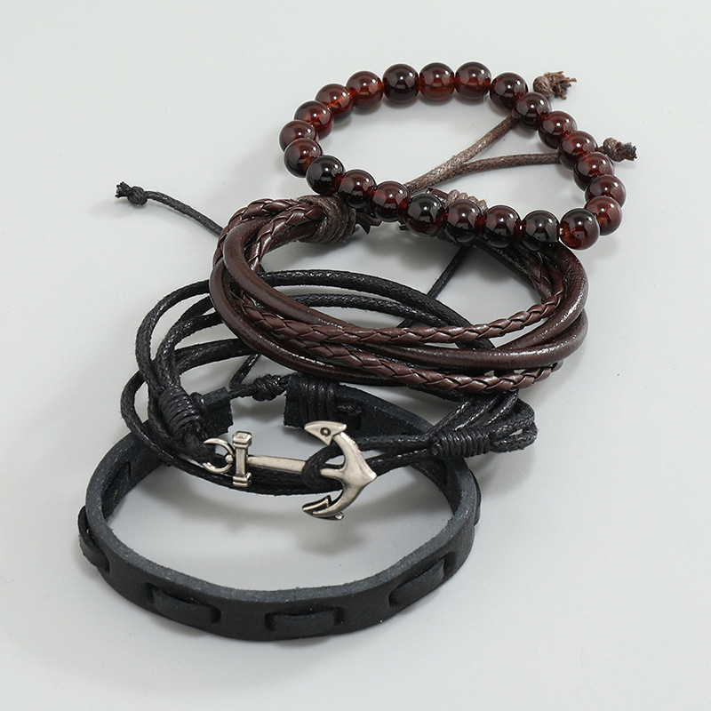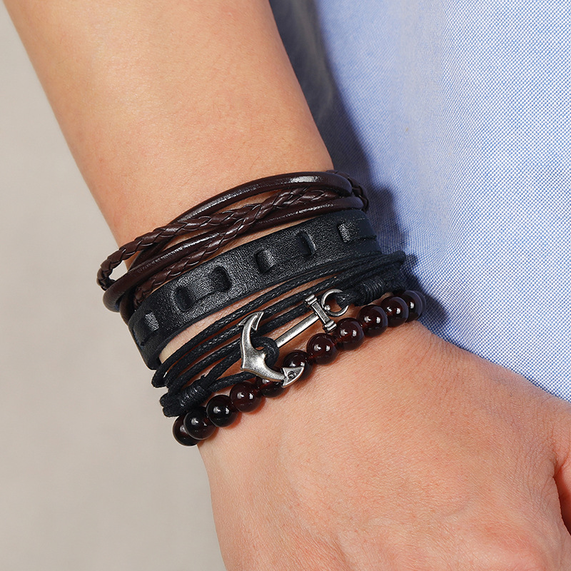 diy欧美简约复古编织船锚牛皮手饰手绳真皮手环多层套装航海手链