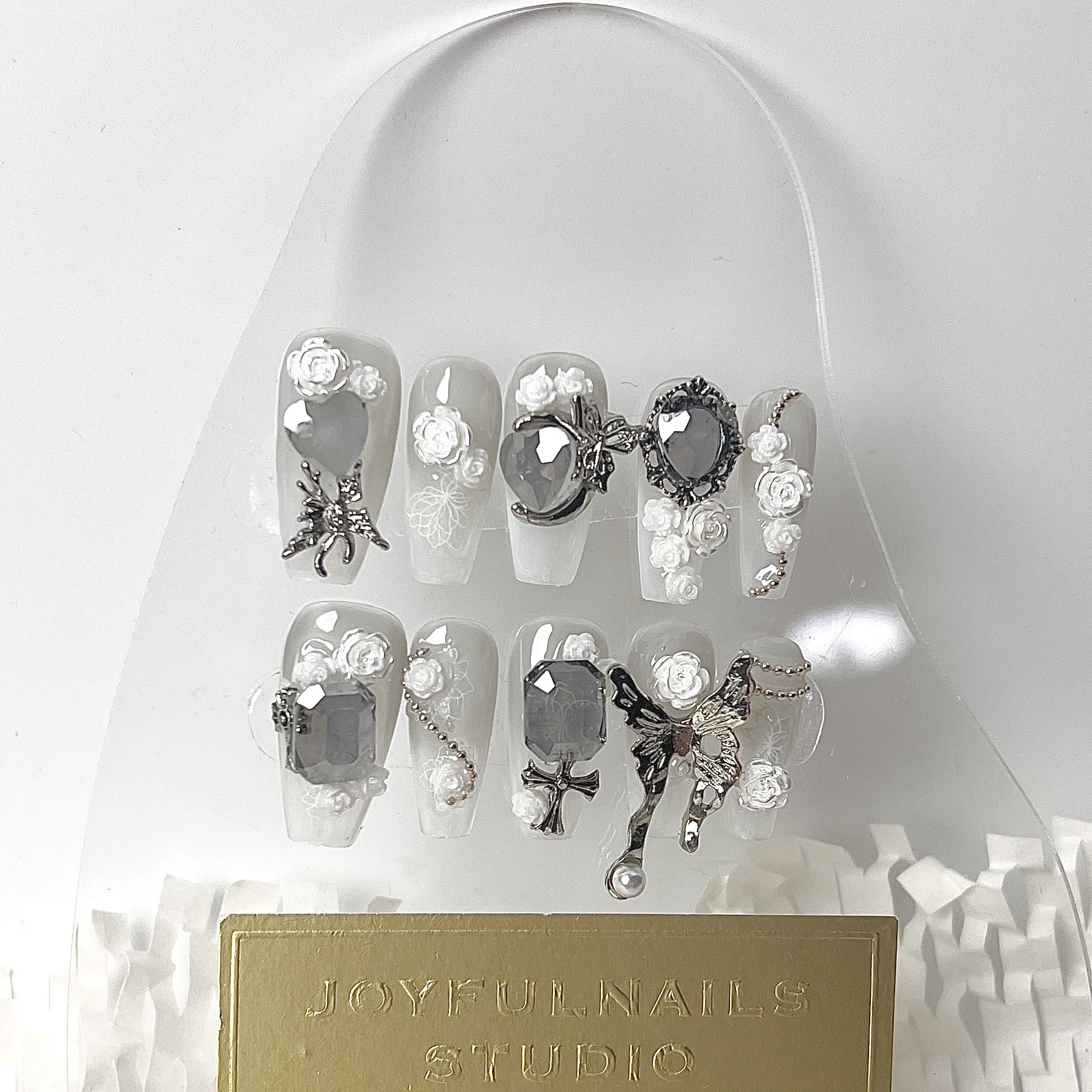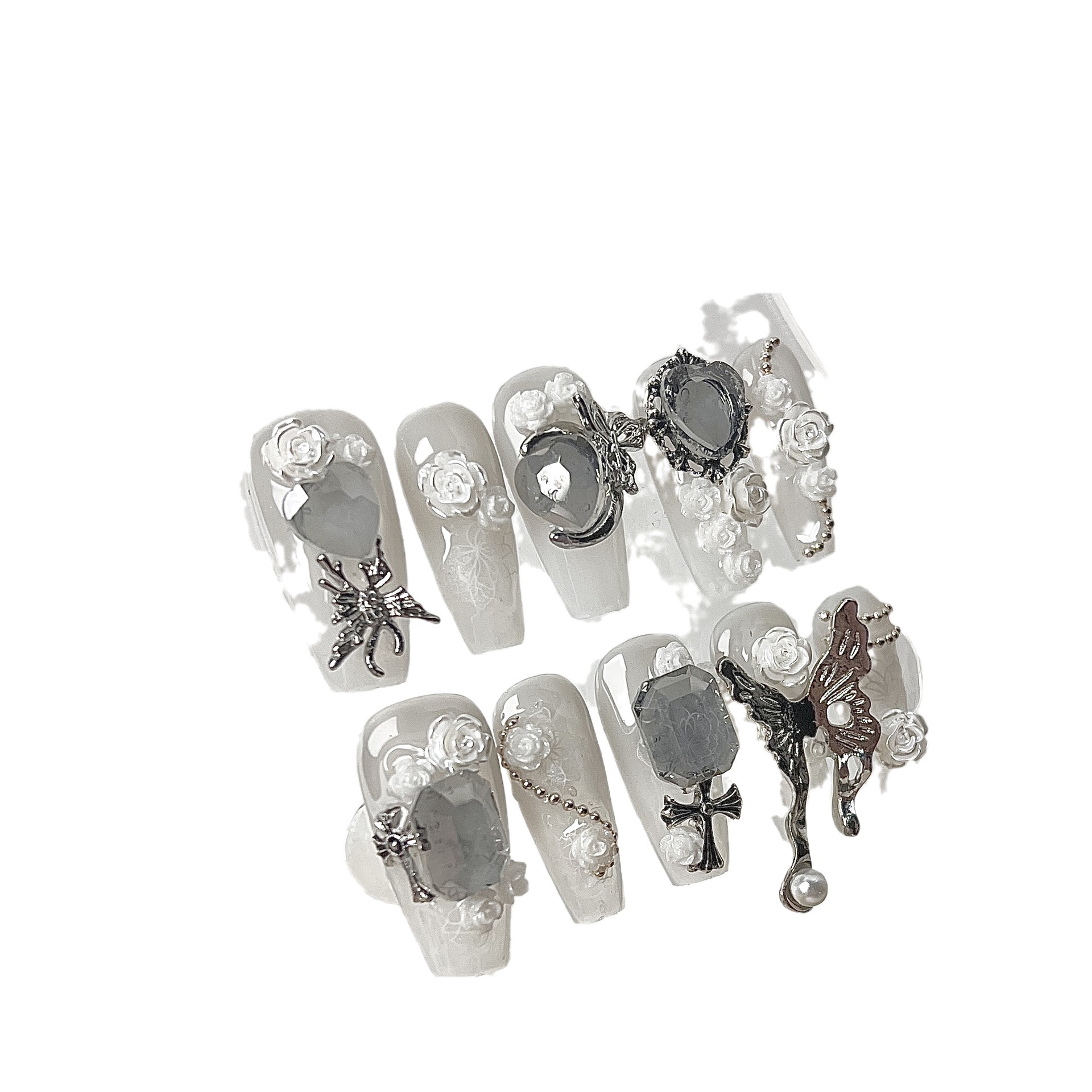 新款冰透重工禁欲灰手工穿戴甲网红同款成品批发美甲假指甲贴片