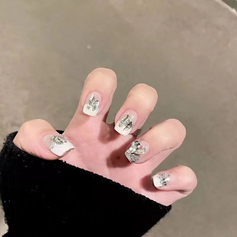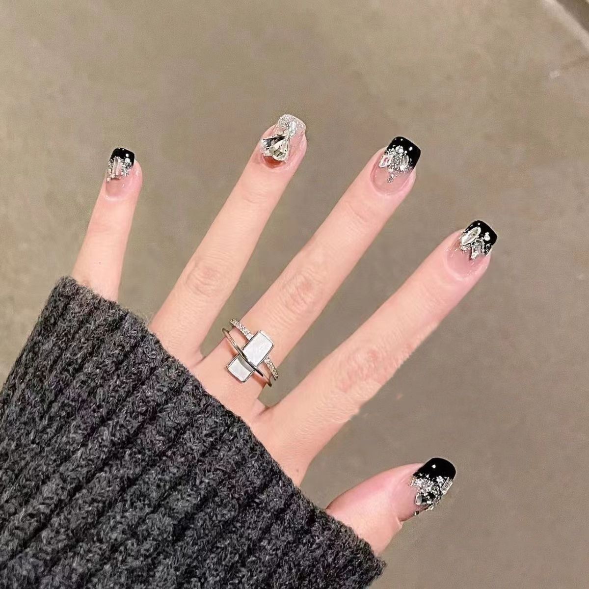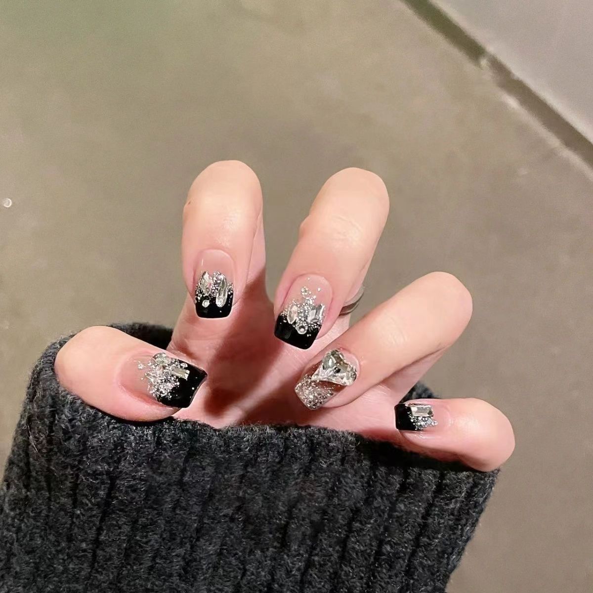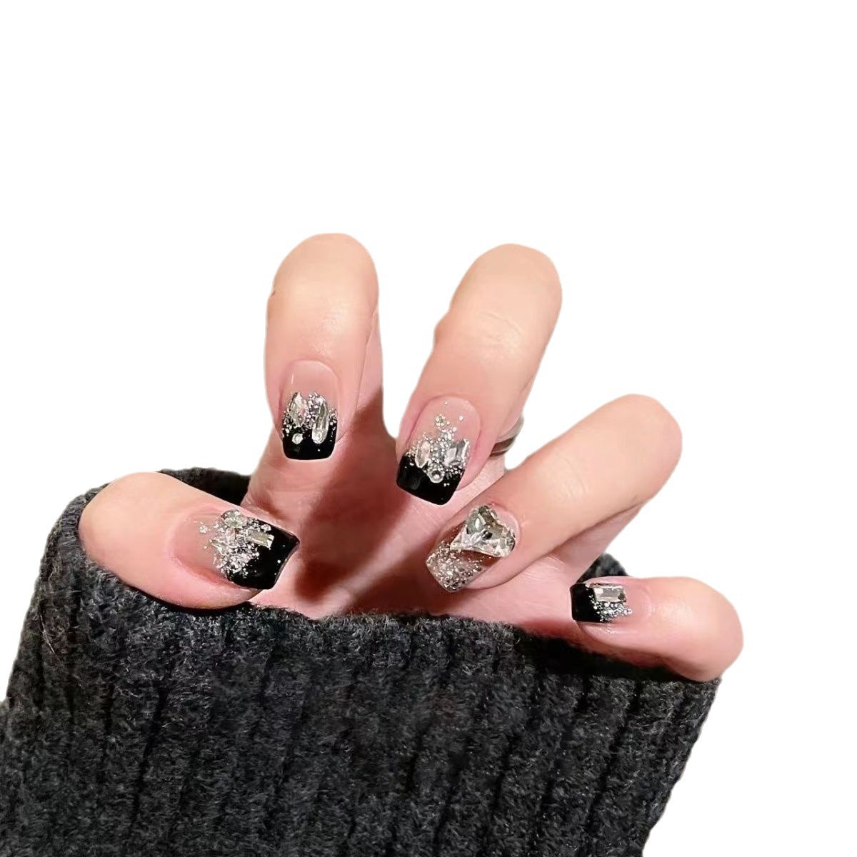 纯手工穿戴甲贴片爆闪渐变法式黑边爱心闪钻短款可拆卸手指甲贴片