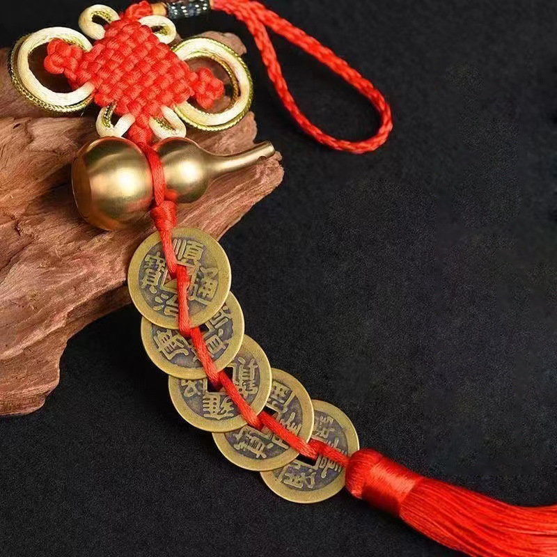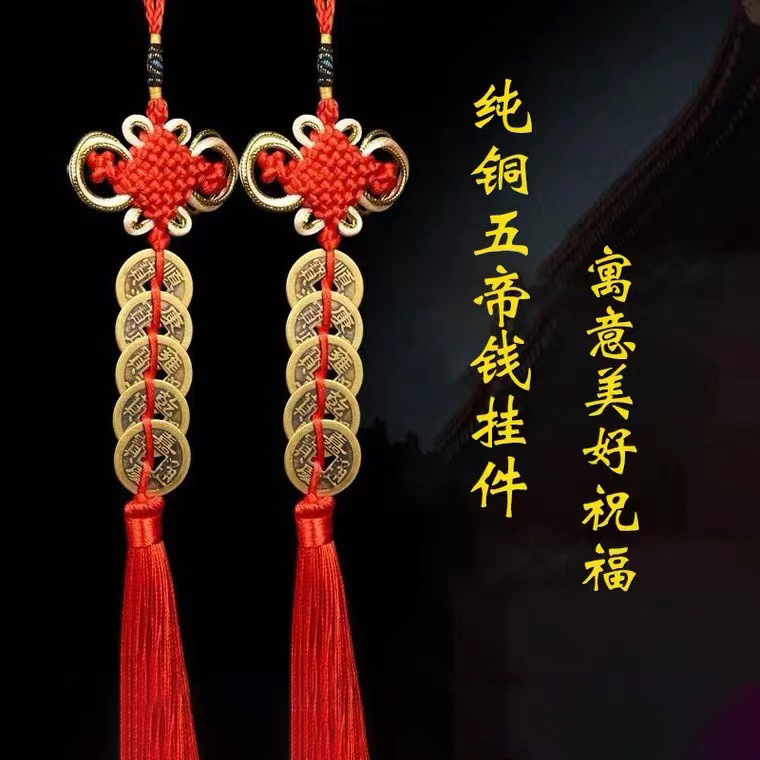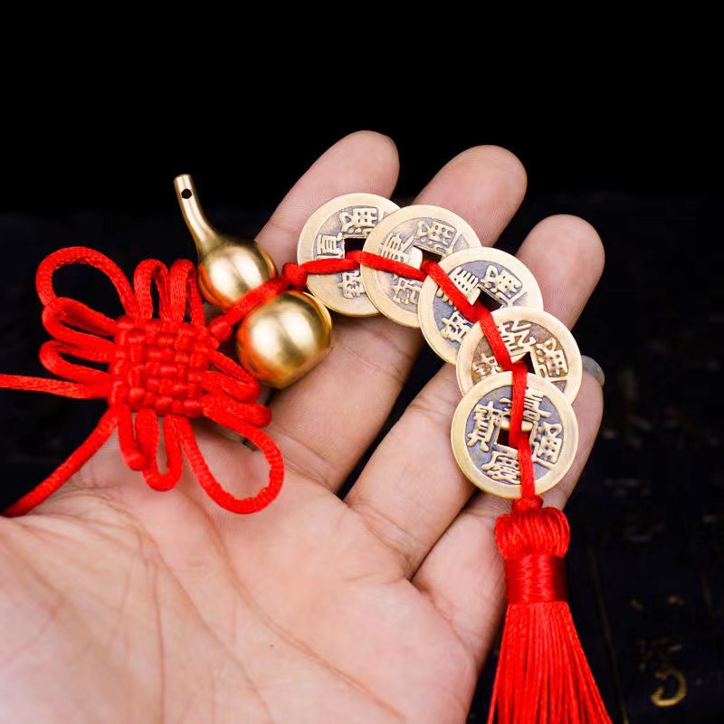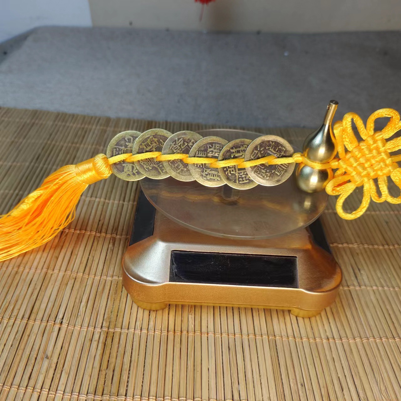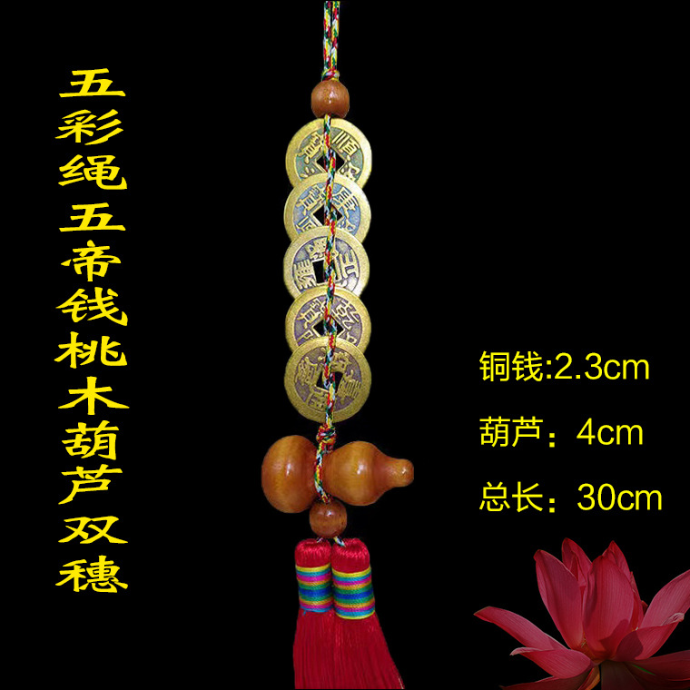 纯铜五帝钱挂件桃木葫芦开口黄铜加厚五帝钱葫芦中国结车挂饰