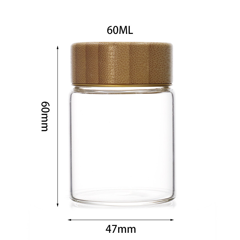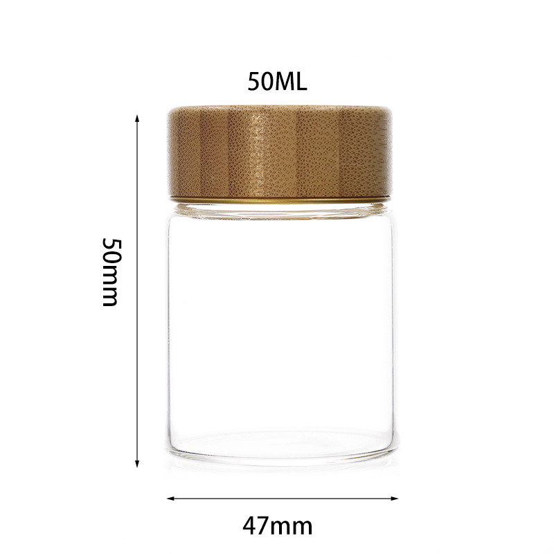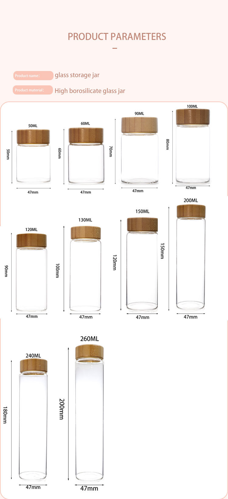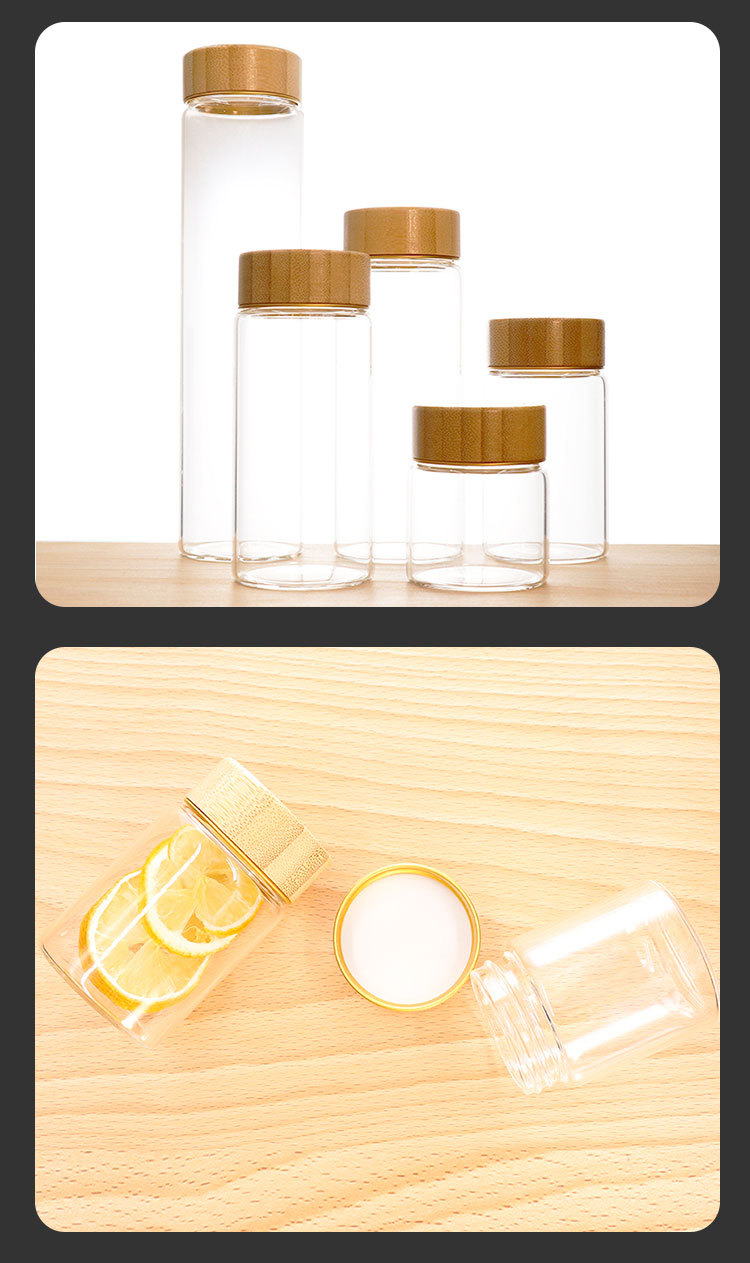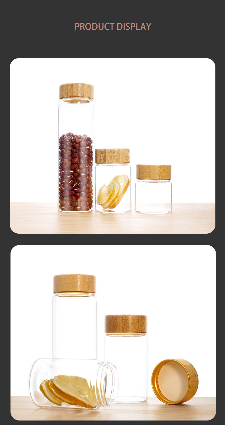 厂家供应直径47竹木盖透明玻璃瓶硼硅瓶谷杂粮收纳瓶防潮储备