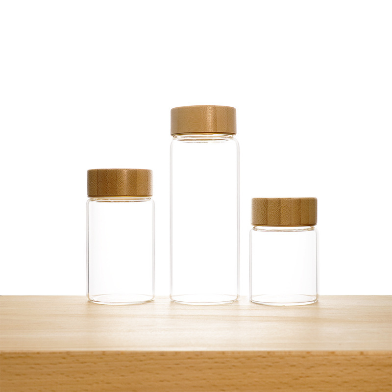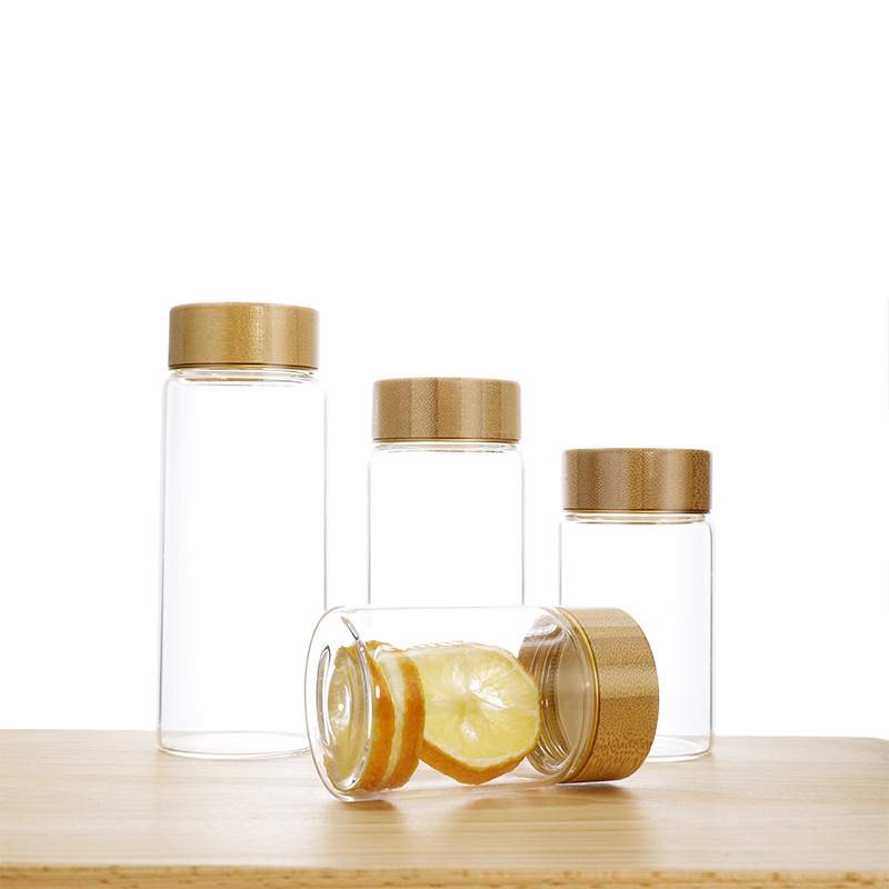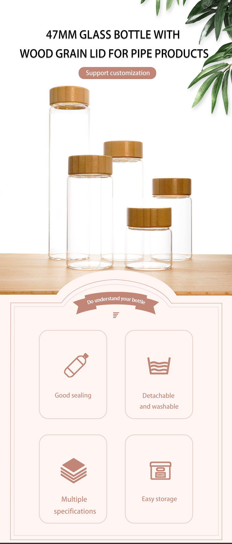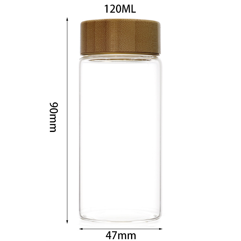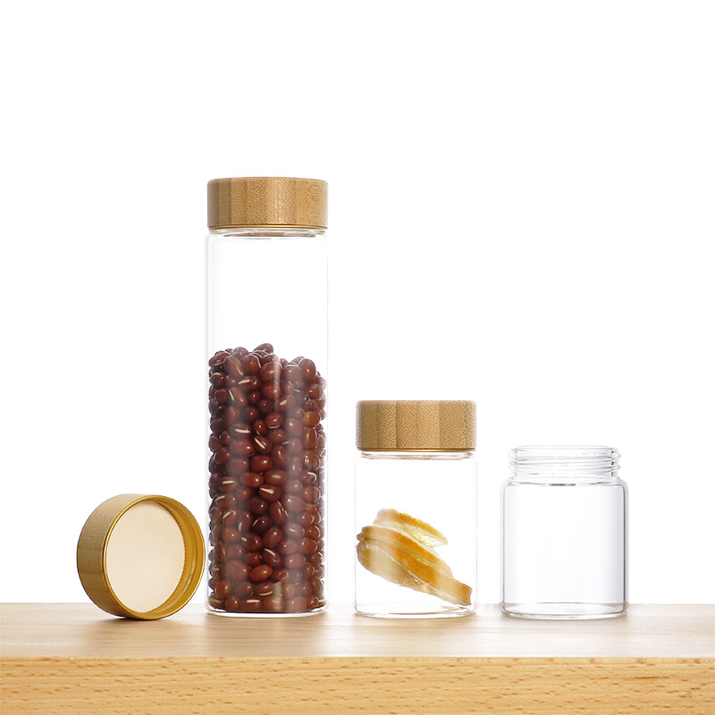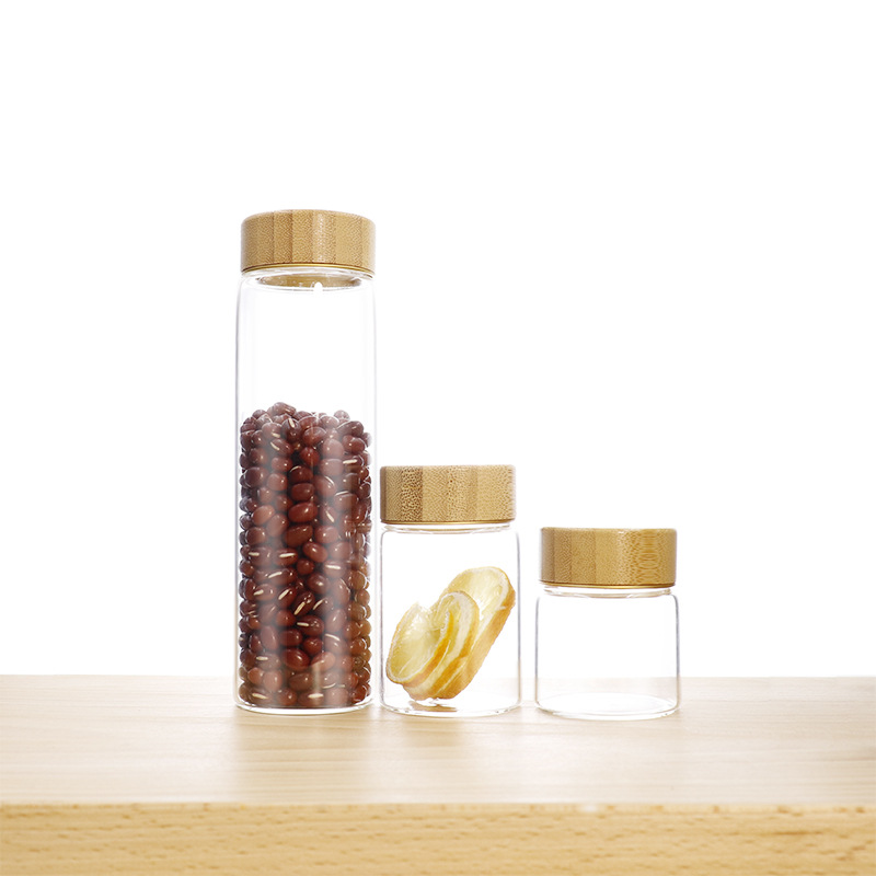 厂家供应直径47竹木盖透明玻璃瓶硼硅瓶谷杂粮收纳瓶防潮储备