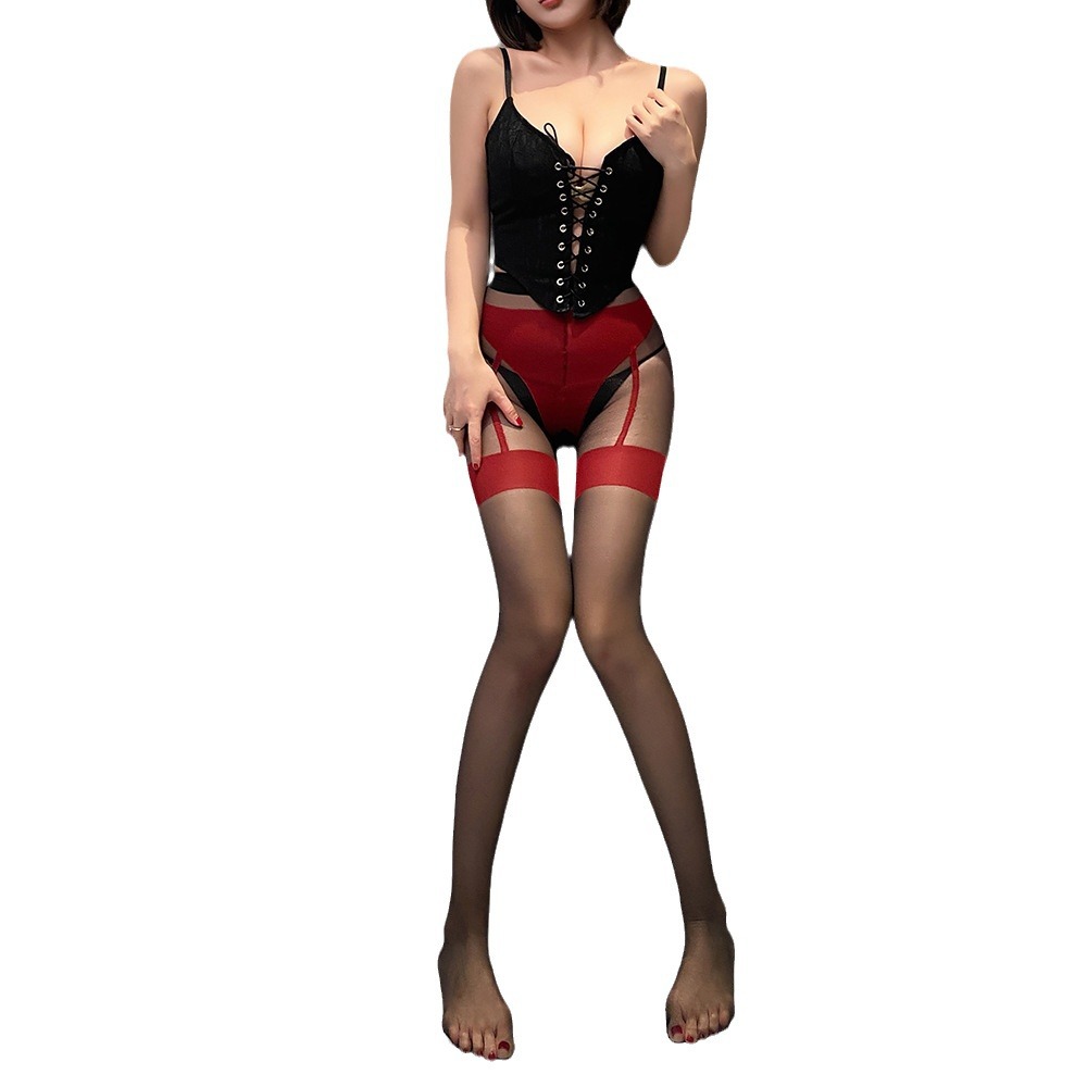 情趣内衣开档假透肉超薄性感长筒丝袜免脱辣妹撞色黑丝吊带袜s149