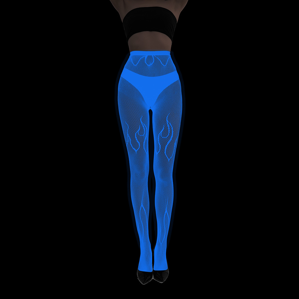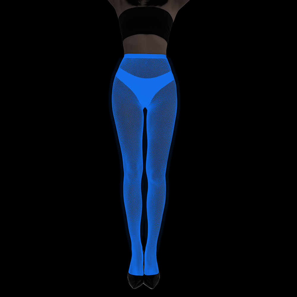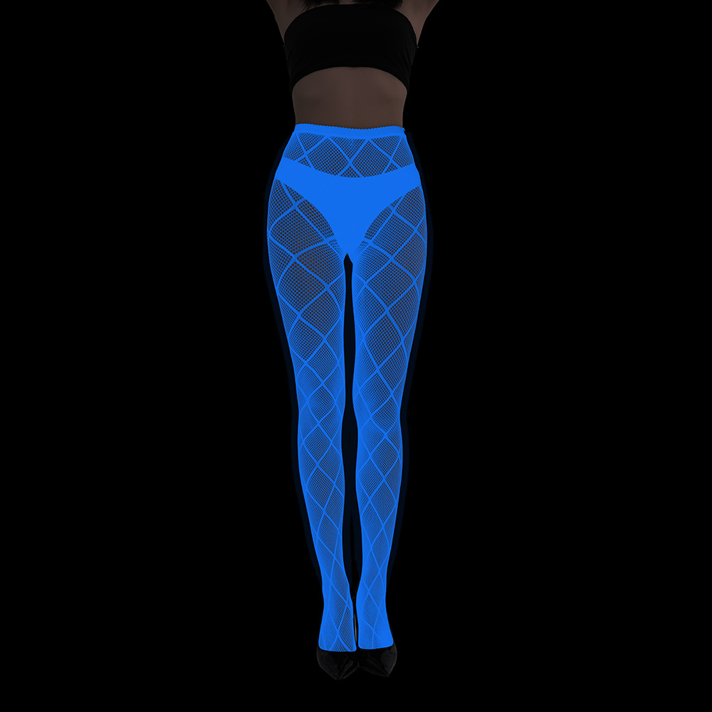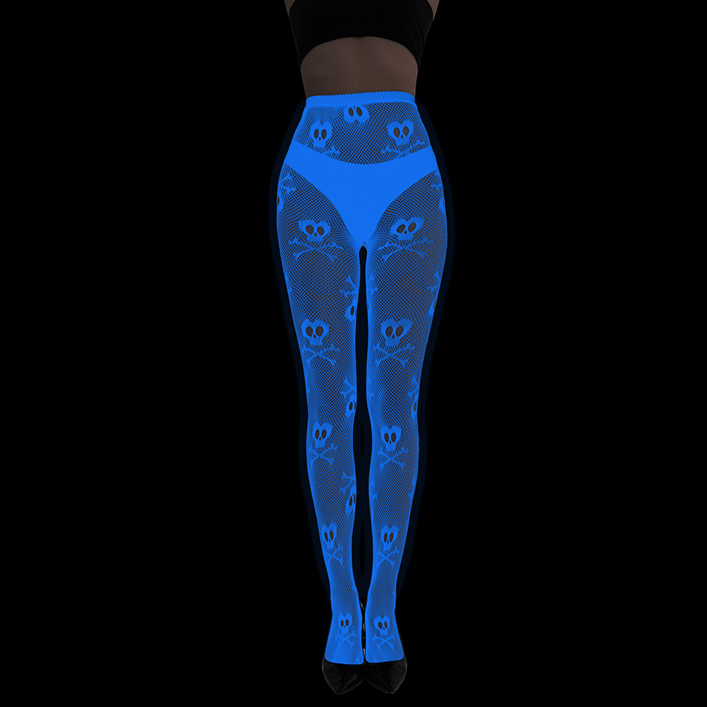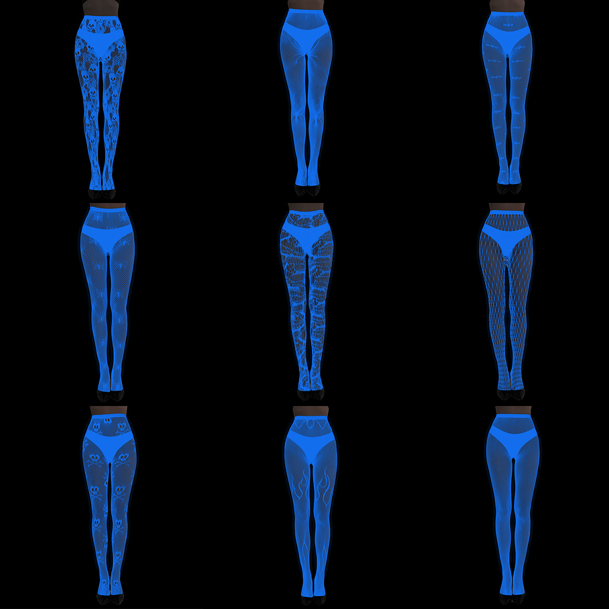 蓝光欧美连裤袜蕾丝镂空夜光渔网袜荧光性感纹身花边体提花袜子