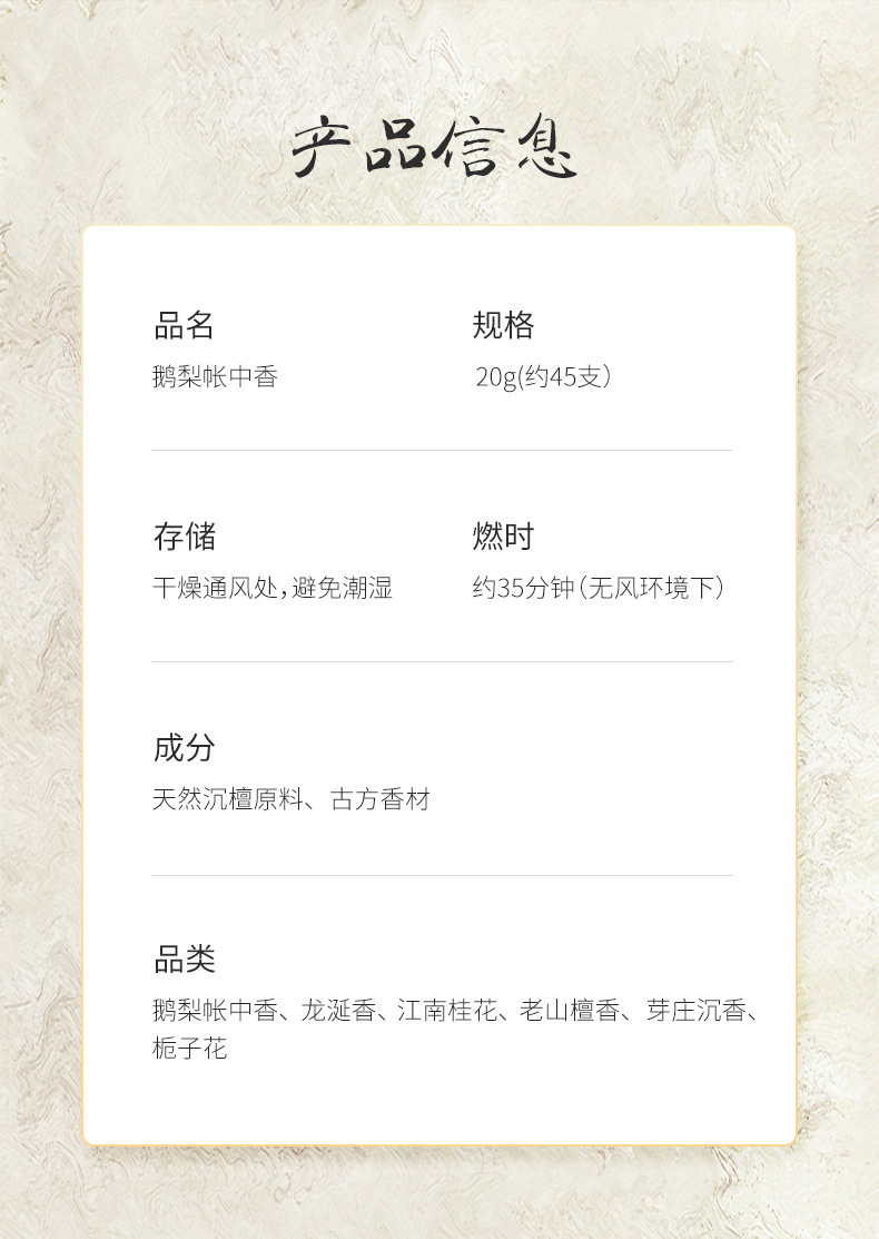 | incense made of pear juice and tambac 20g/about 45 pcs [only incense]](鹅梨帐中香20克/约45支【只有香】) | USD $1.04 | 3751 box available |