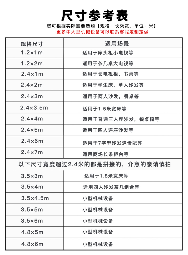 | 2.4*4m (applicable to ordinary three-seat sofa, dining tables and chairs, etc.)(2.4*4m(适用于普通三人座沙发、餐桌椅等)) | USD $5.91 | 79997 piece available |