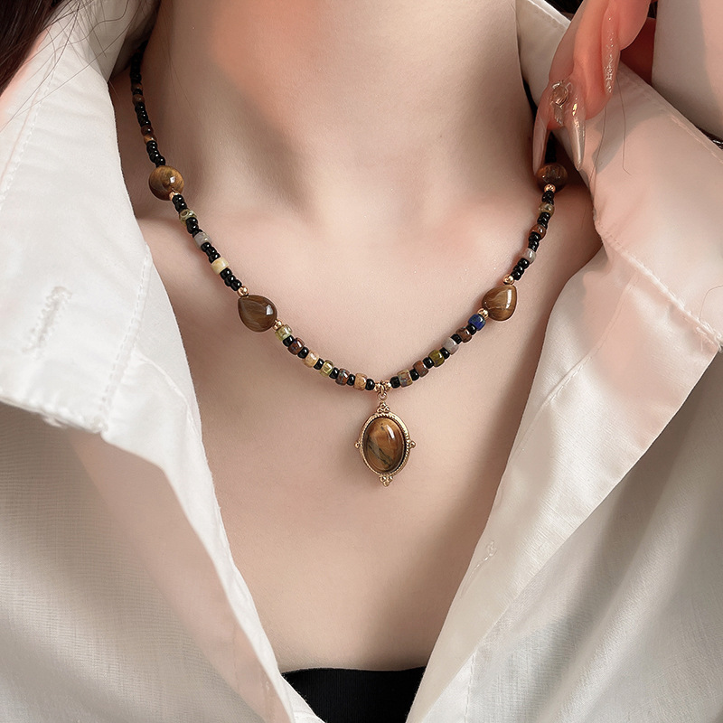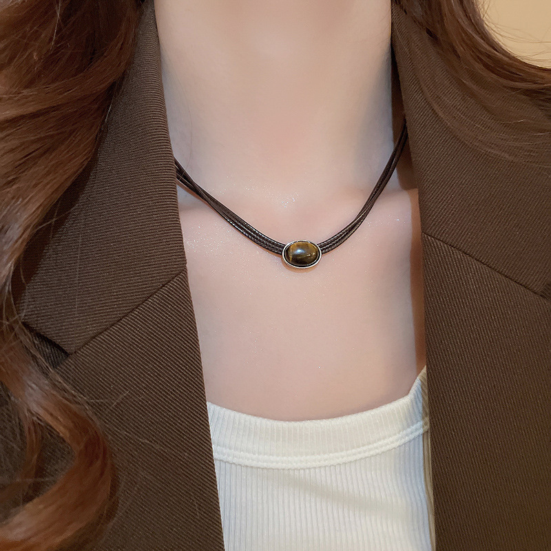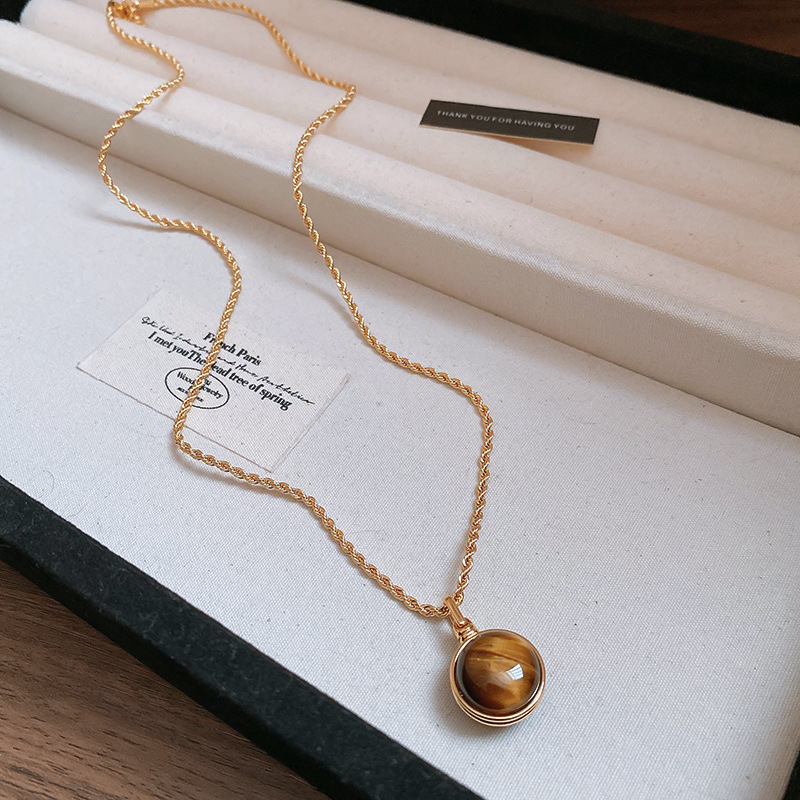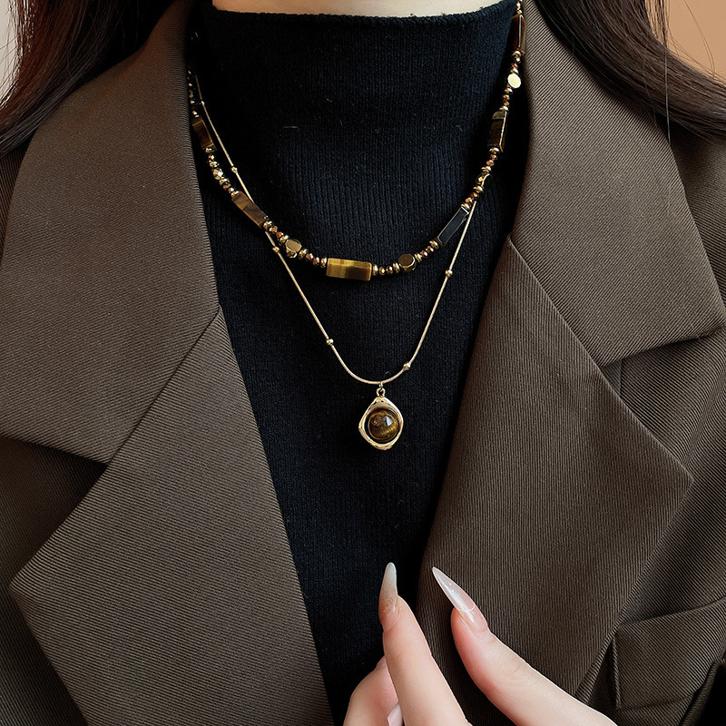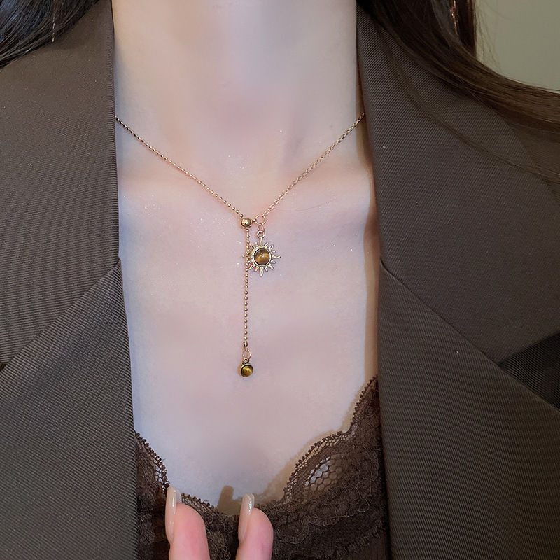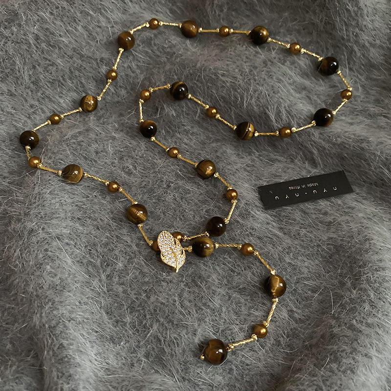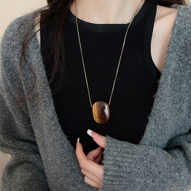 秋冬复古花朵圆形人造虎眼石款项链高级感毛衣链轻奢小众卫衣项饰
