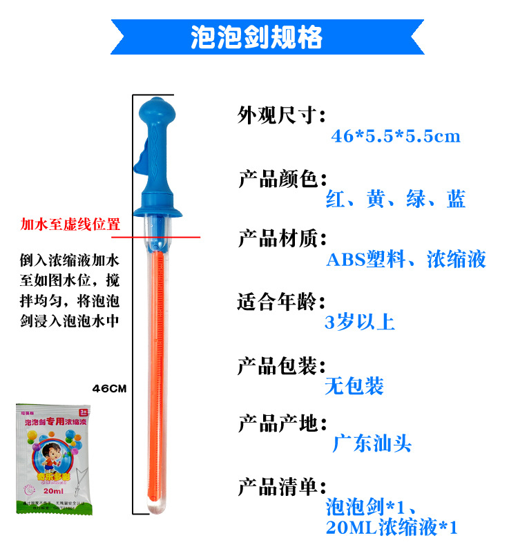 为了发货方便,节省运费,现在泡泡剑为浓缩液版,内附一包浓缩液,回去灌满水晃一下就可以使用,方便快捷!!!没有展示盒,没有单独袋装,请知悉!!!