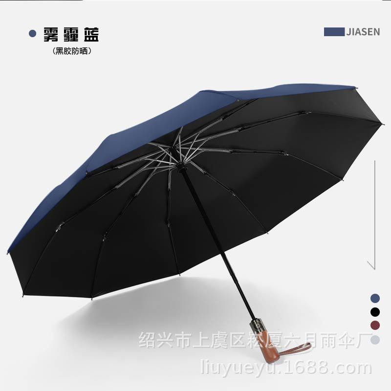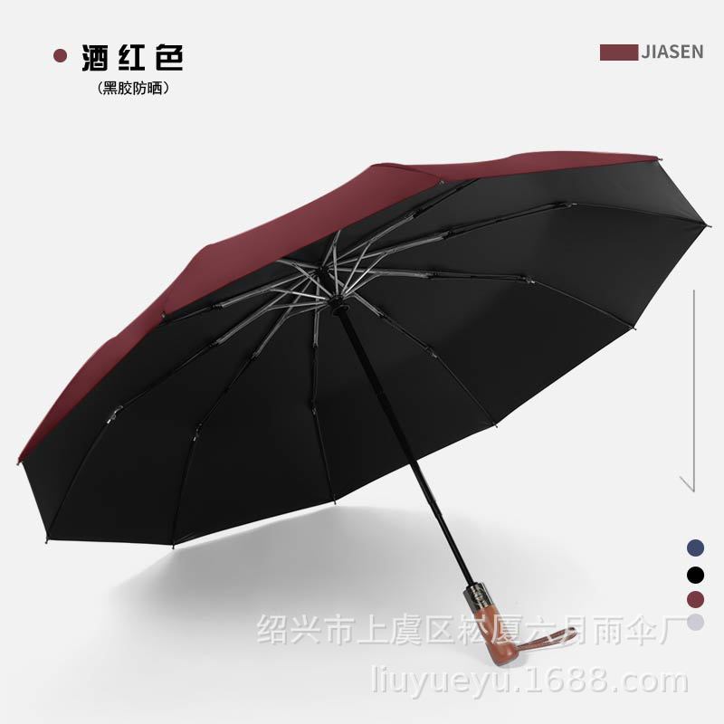 原木柄三折全自动晴雨两用伞黑胶折叠可印logo广告伞超大号