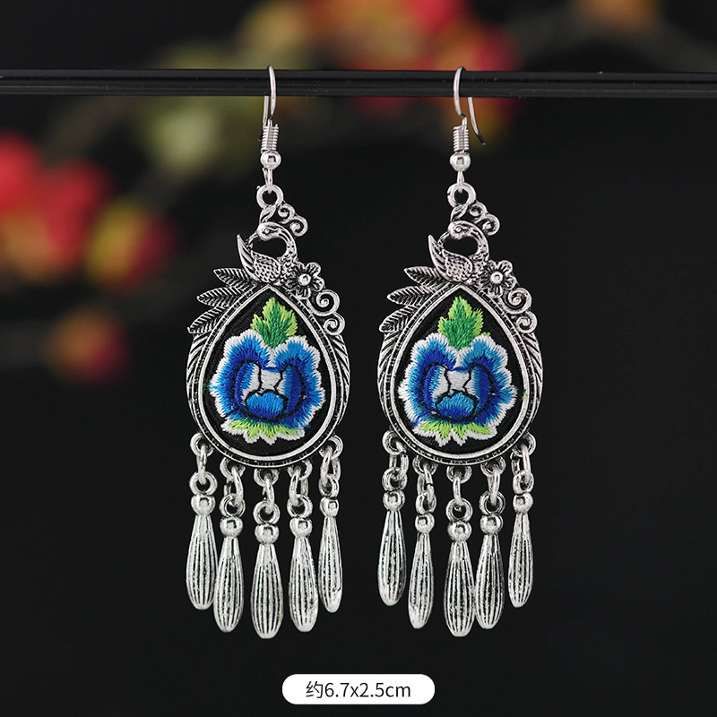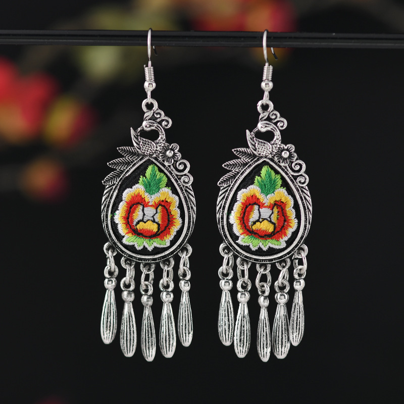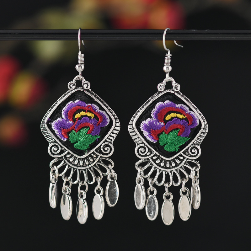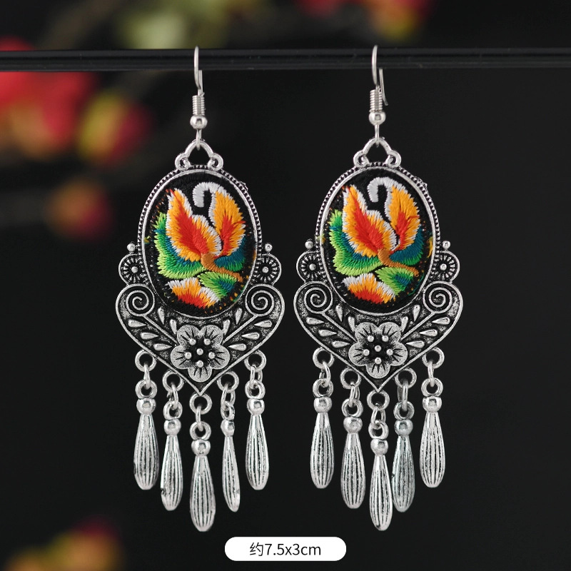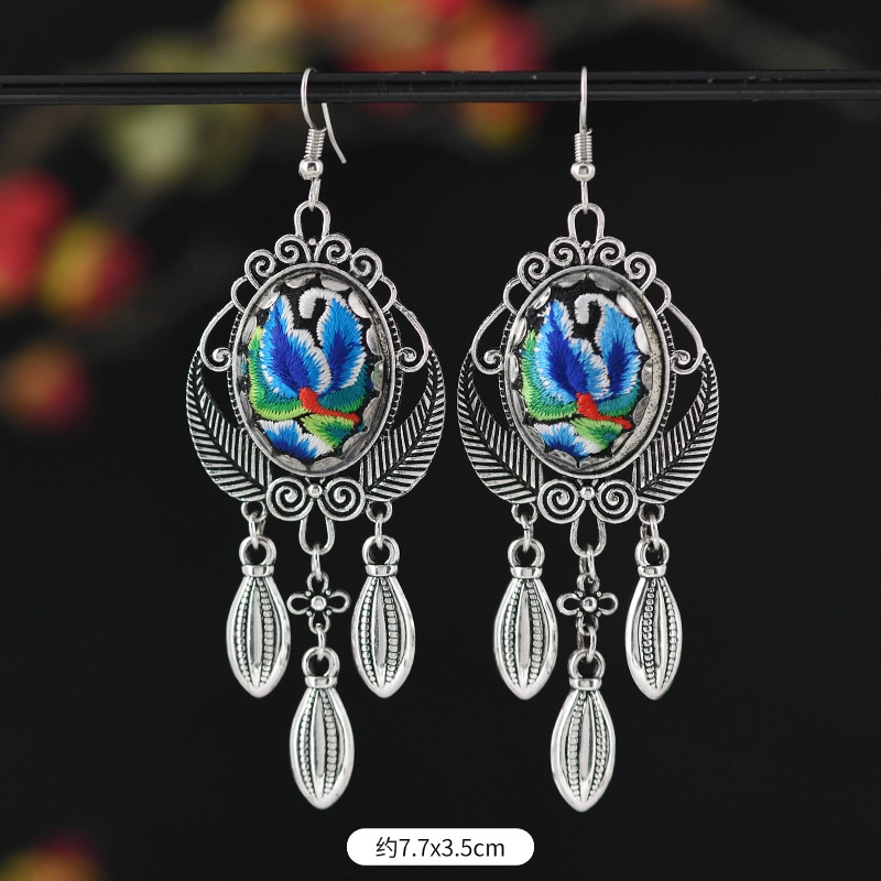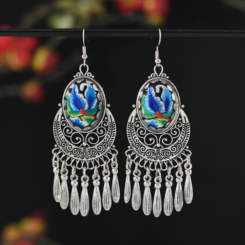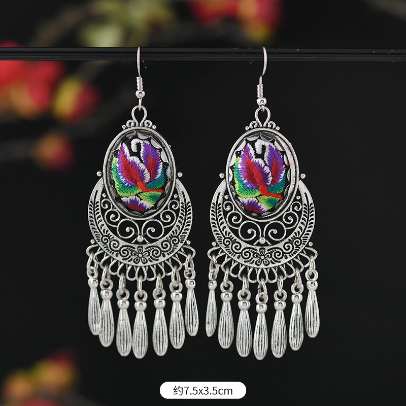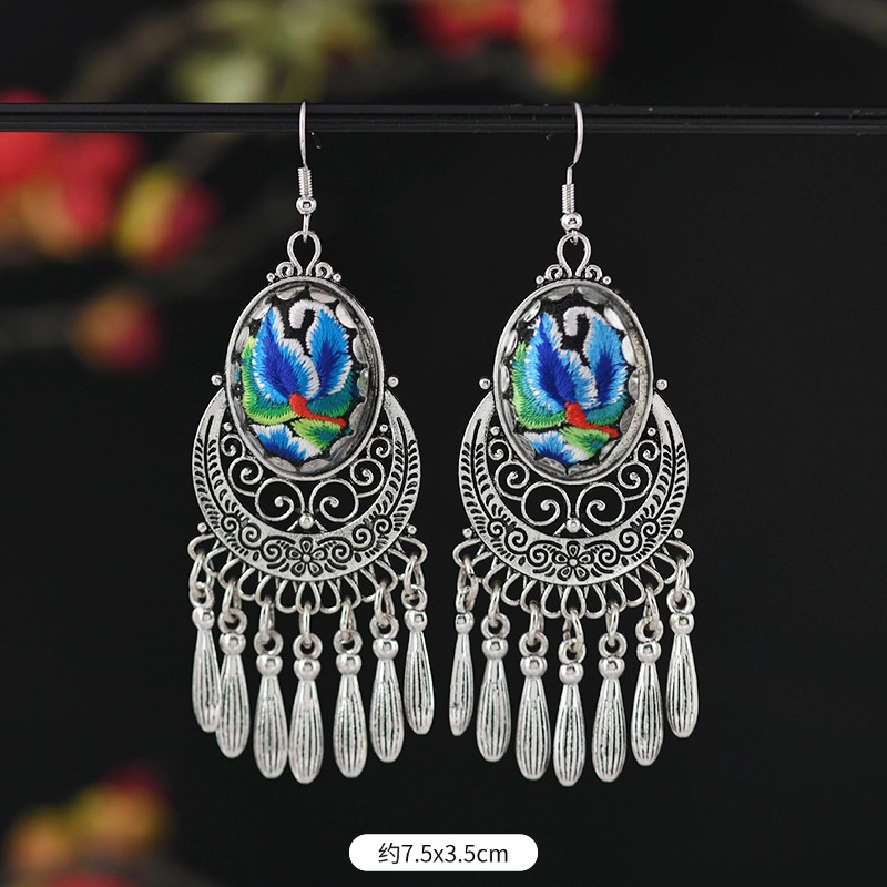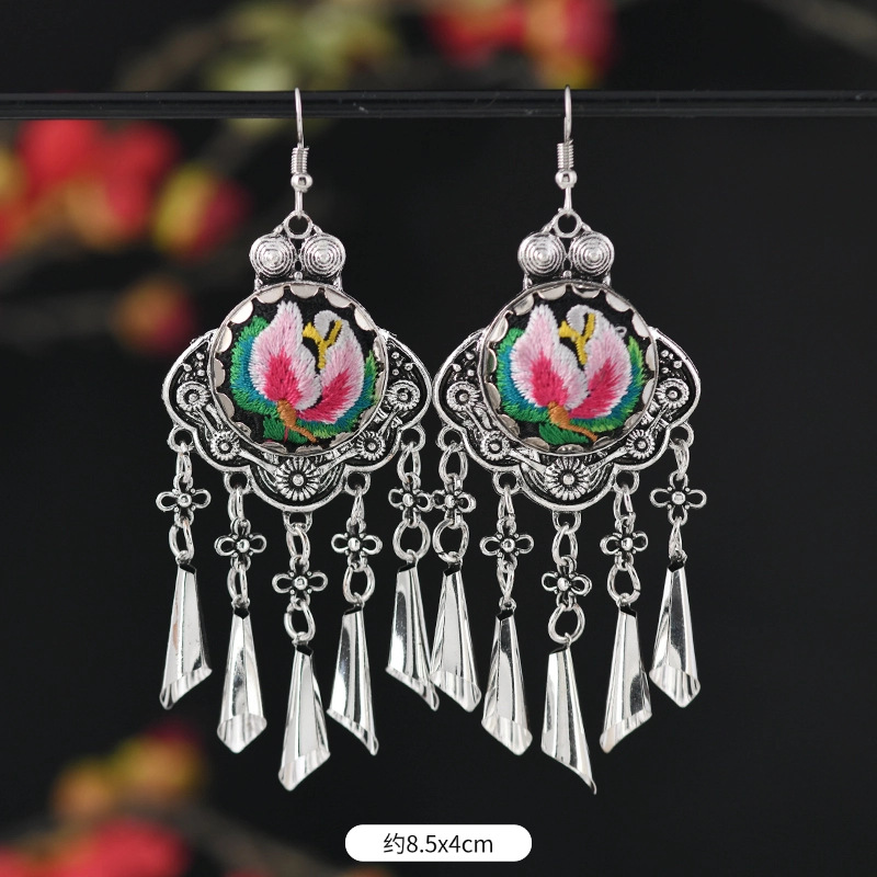 民族风手工刺绣苗银耳环复古长款流苏苗族老绣片女新中式国风耳饰