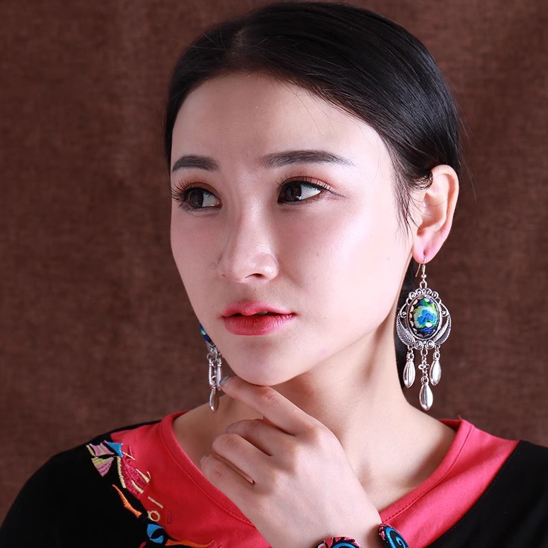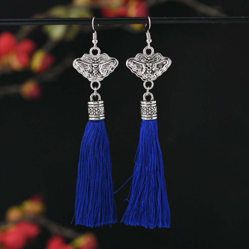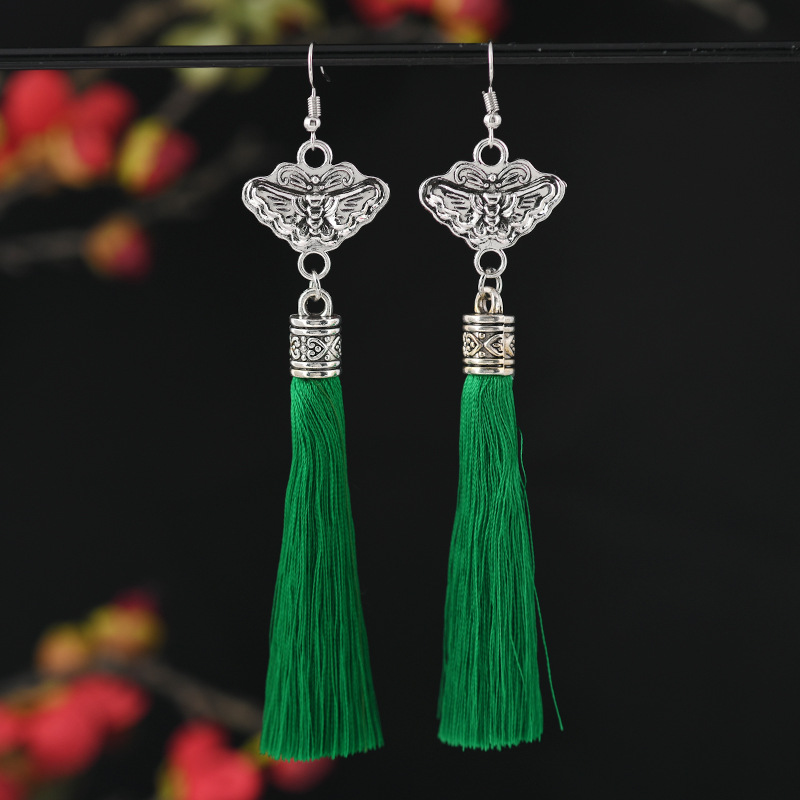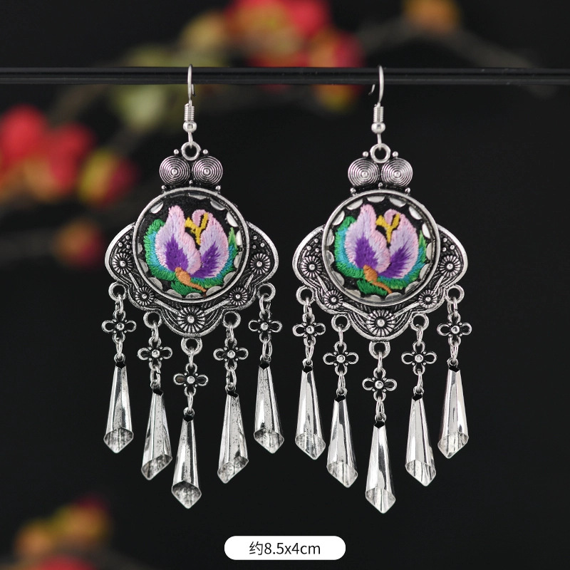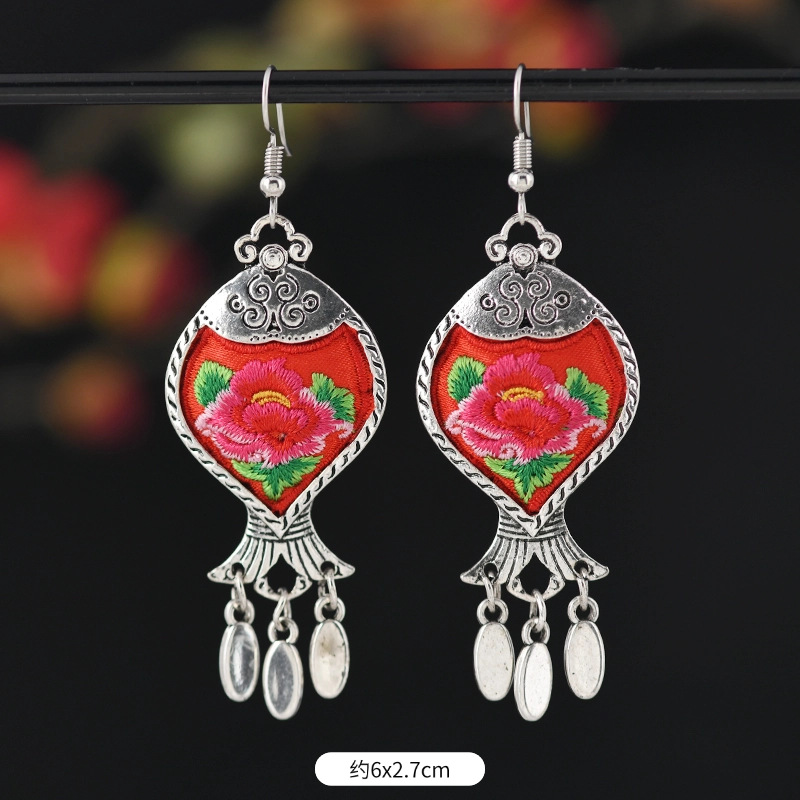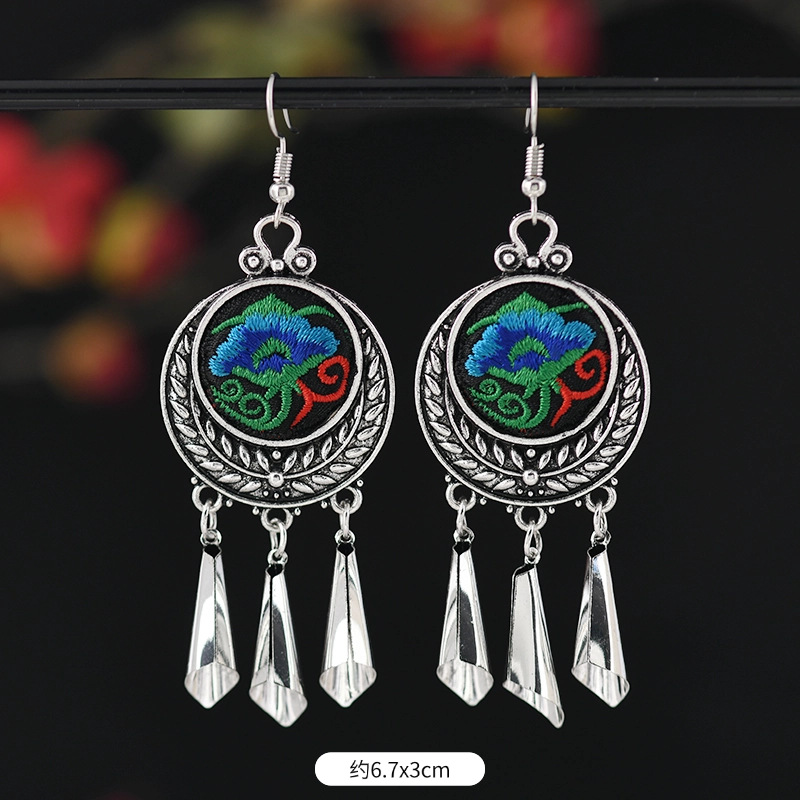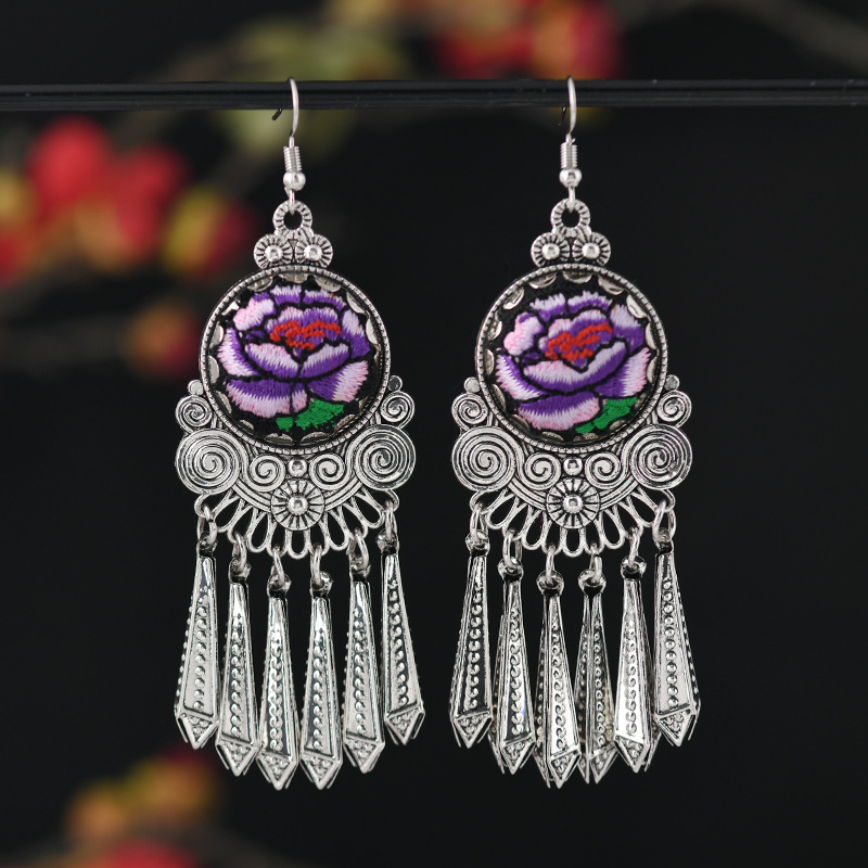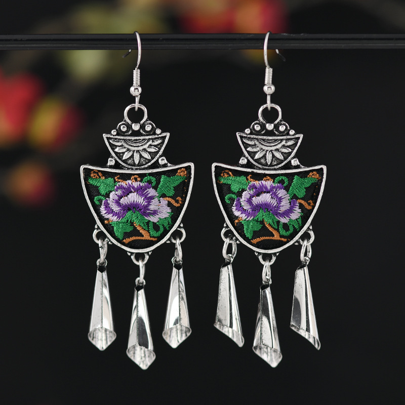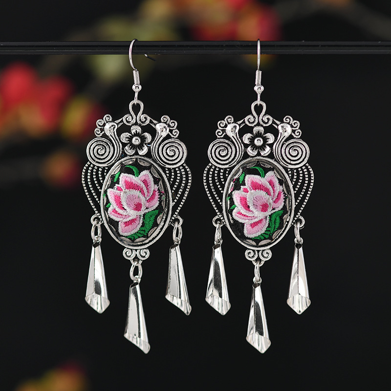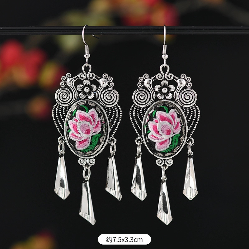 民族风手工刺绣苗银耳环复古长款流苏苗族老绣片女新中式国风耳饰