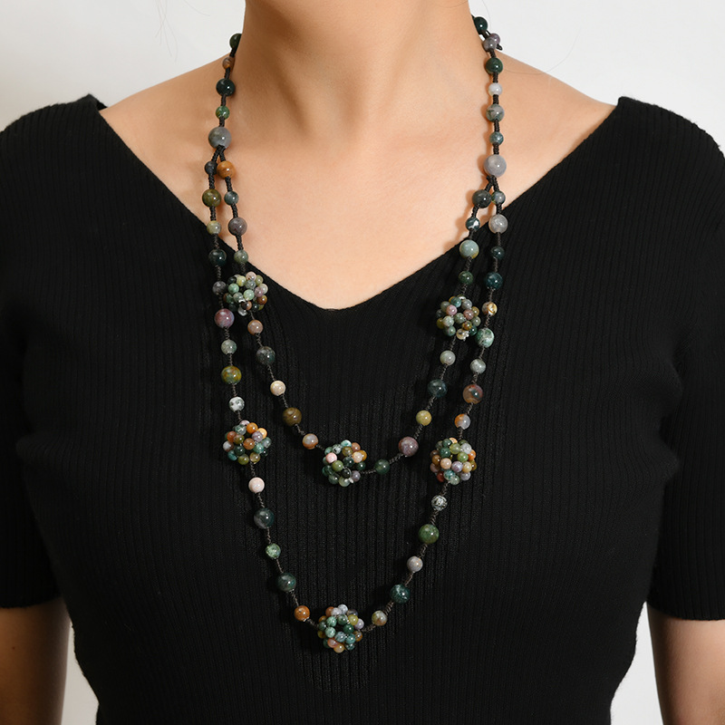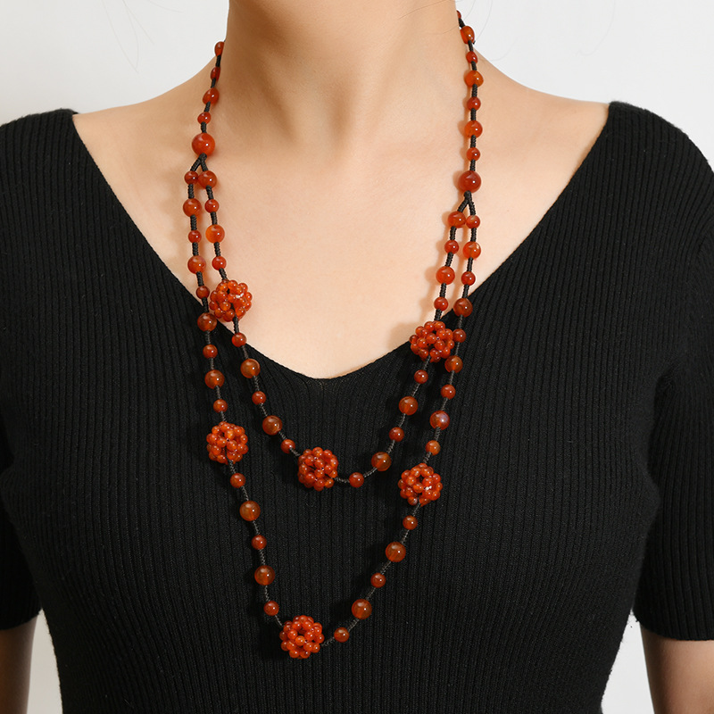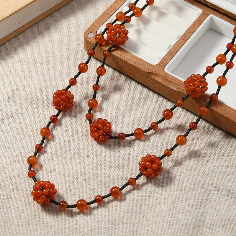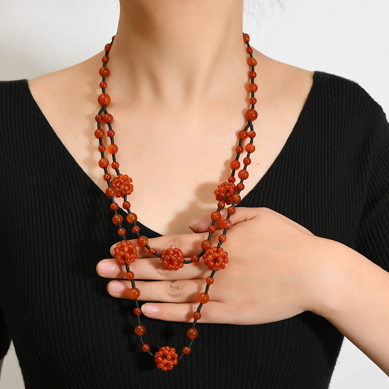 双层天然红玛瑙玉石项链手工编织民族风毛衣链小众高级感女士配饰